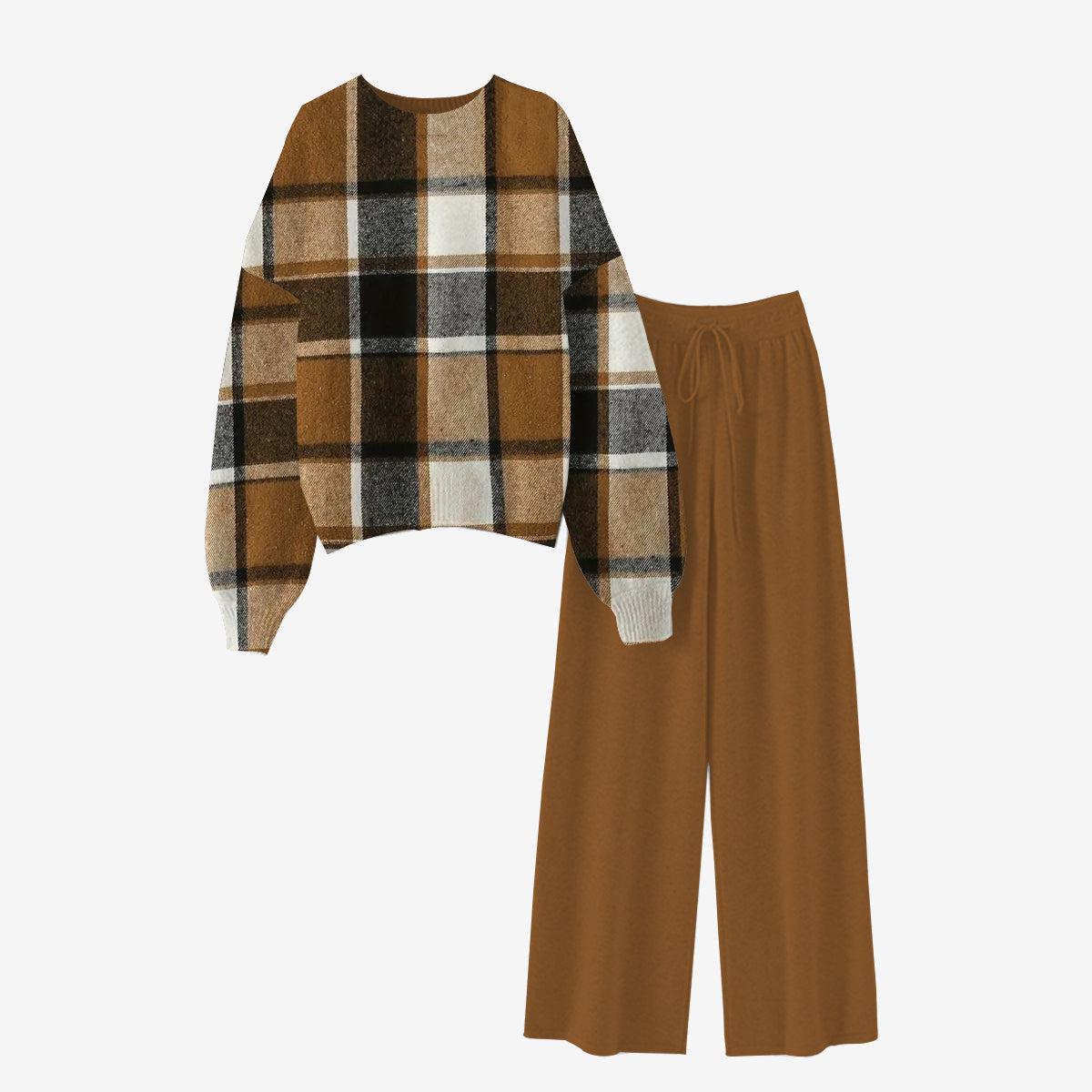 Brown Print Round Neck Two Piece Set