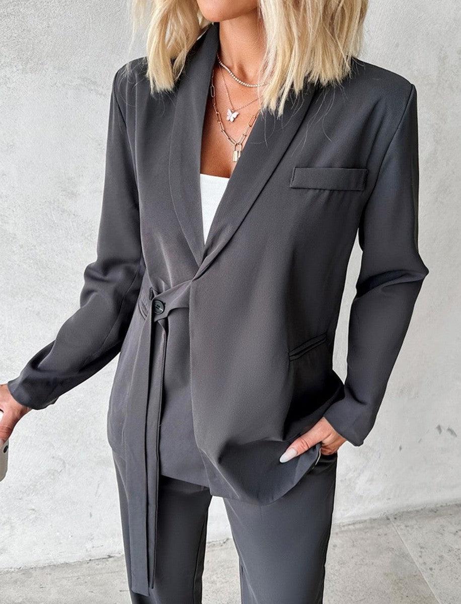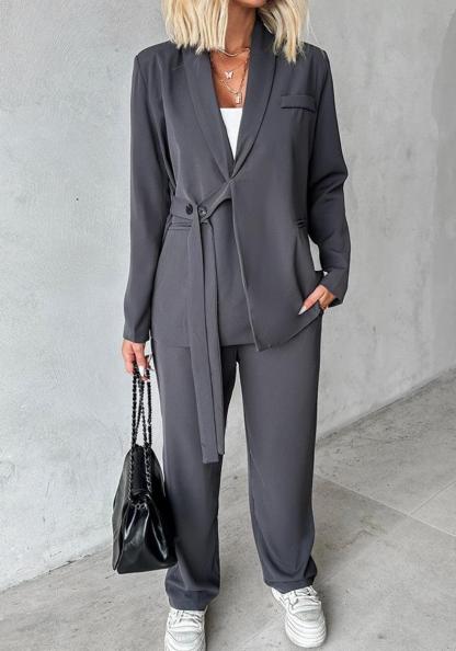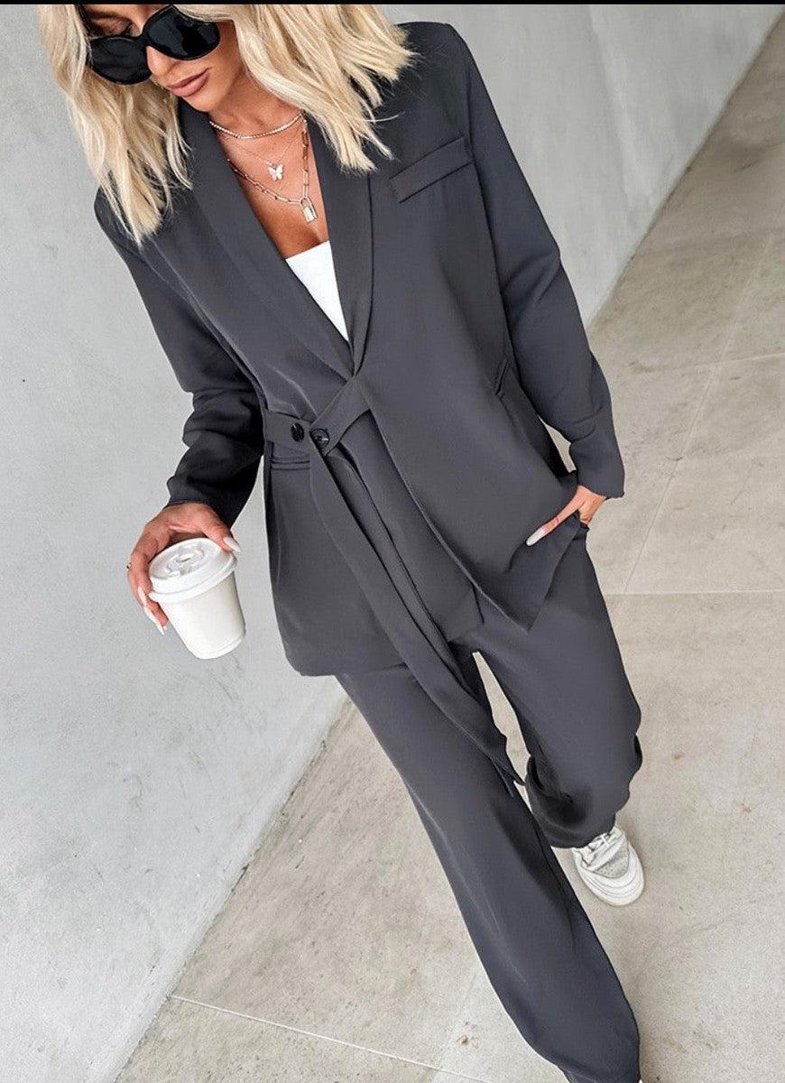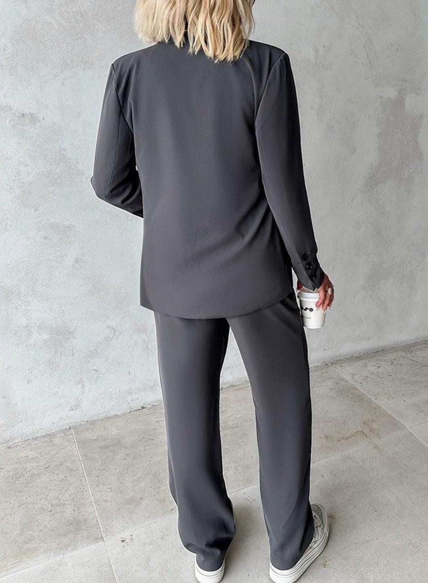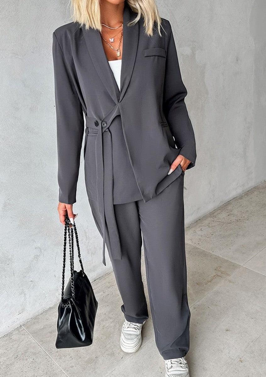 Grey Plain Lapel Two Piece Set