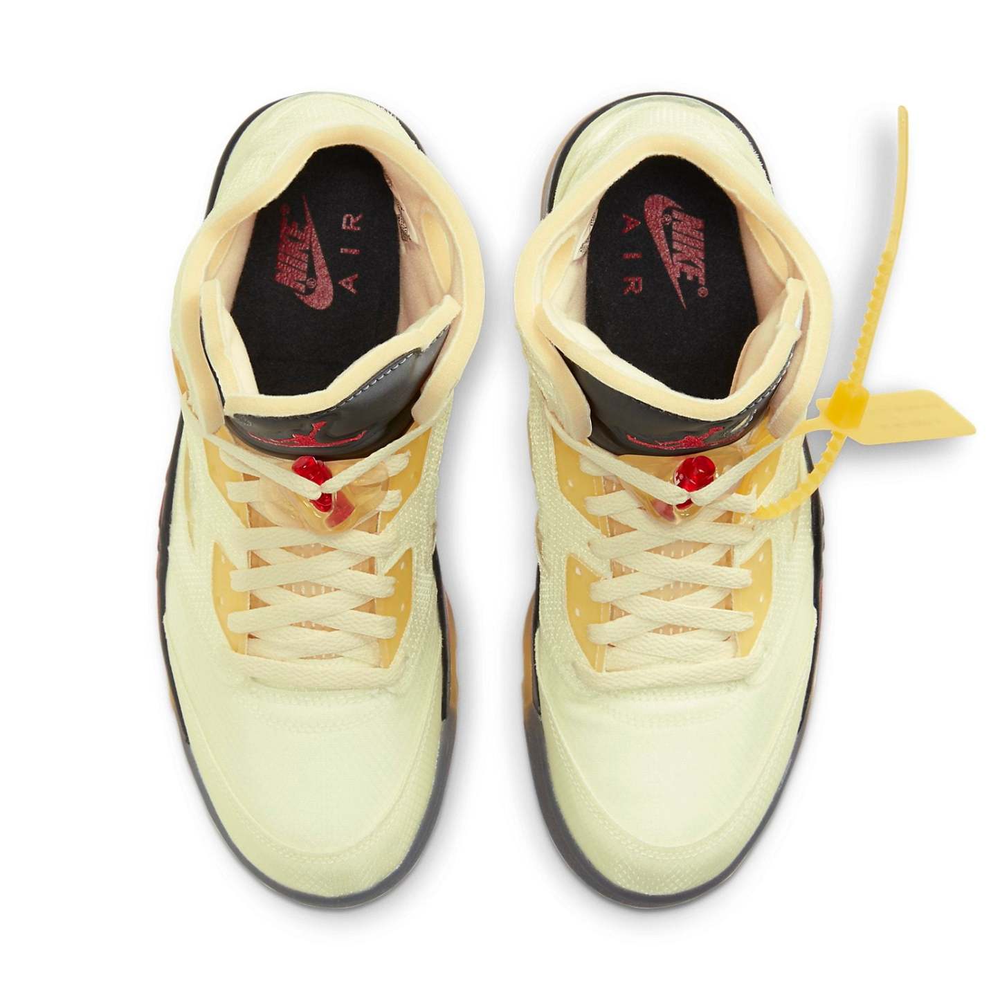 A Whole Family - Nike x Off White Air Jordan 5 Retro “Sail“Air Jordan 5 x Off White “Sail” is composed by translucent TPE material covering the cream color upper, and circular hollow design on the 3M reflective tongue. It also retains Helvetica font manual type words, “SHOELACES” words laces, and fiery red serrations on the midsole.