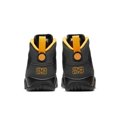 The Air Jordan 9 Retro 'Dark Charcoal University Gold' is a great choice for those who want a low-key shoe that still makes a statement. The dark grey nubuck upper is contrasted by hits of University Gold, making this shoe perfect for fans of the Bulls or MJ himself. The Jumpman icon on the lateral midsole and embroidered '23' on the back heel are both standout features, while the webbing pull tab makes this shoe easy to slip on and off. Whether you're hitting the court or just running errands, the Air Jordan 9 Retro 'Dark Charcoal University Gold' is a comfortable and stylish choice.