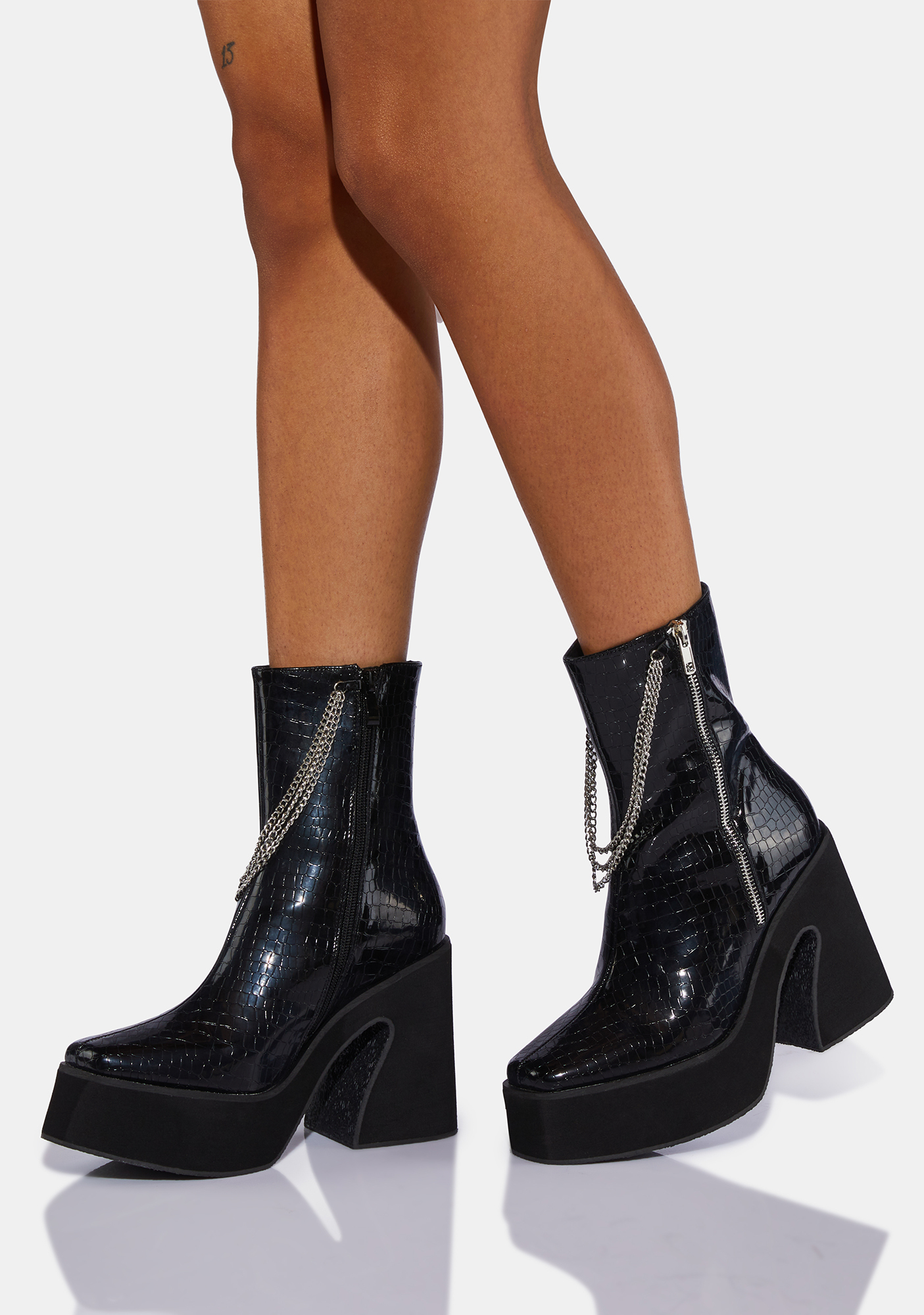 Arnor Heeled Croc Chain Boots have a patent faux leather construction with a croc texture, chain detailing, side zipper closures, and chunky platform heels.