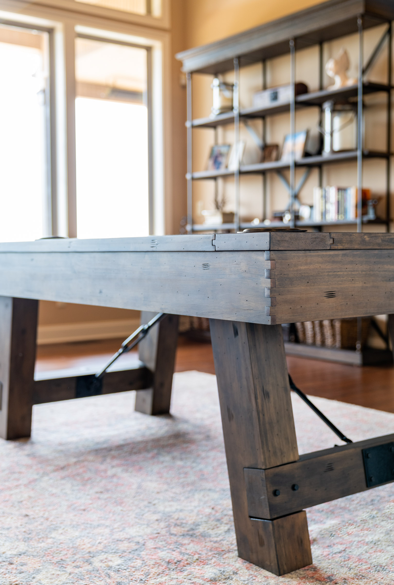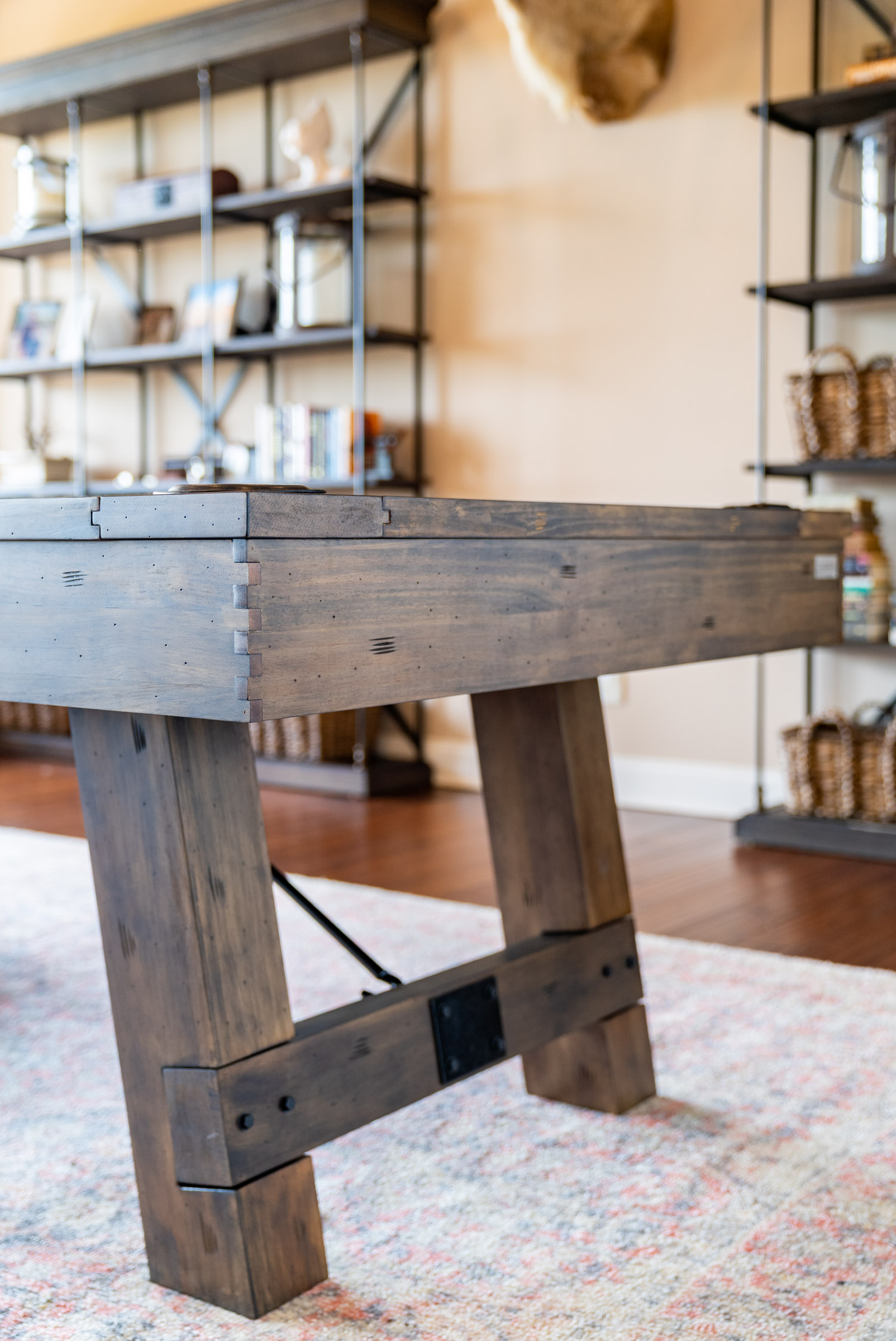 The Aspen Nights Handcrafted Distressed Wood 7′ Pool Table was meticulously designed and built with style in mind. From the unique hand distressed wood finish to the designer inspired metal hex head pattern inlays you get these sense this table was designed to not only function as a pool table but to also add a touch of style to your home. The design features continue with real leather ball cups, craftsman-inspired dovetail finished corners and professional-grade wool cloth felt.