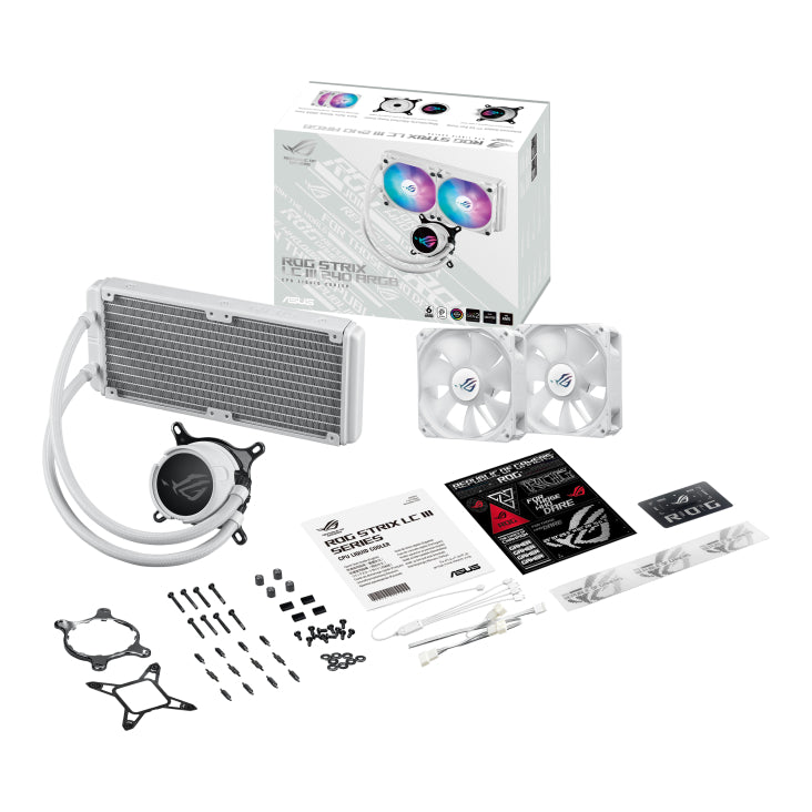 | Package Content | 1 x CPU Liquid Cooler (pre-applied thermal compound) 2 x 120 mm ARGB Radiator Fan 1 x 1-to-2 Fan Splitter Cable 1 x 1-to-4 ARGB Splitter Cable 1 x Accessory Pack of Screws and Brackets 1 x Quick Start Guide 1 x ROG Sticker 1 x ROG cable organizer 1 x ROG VIP card |