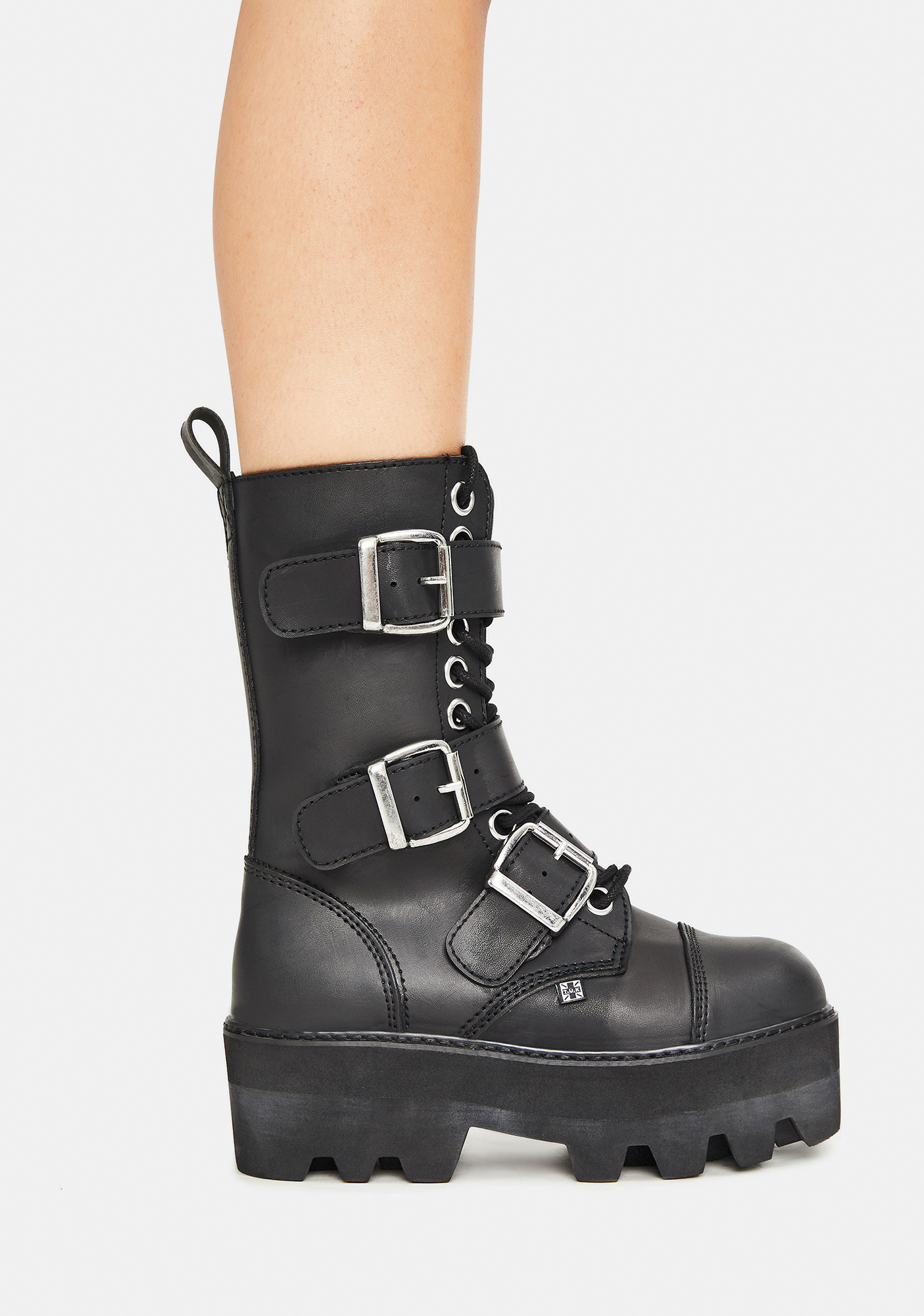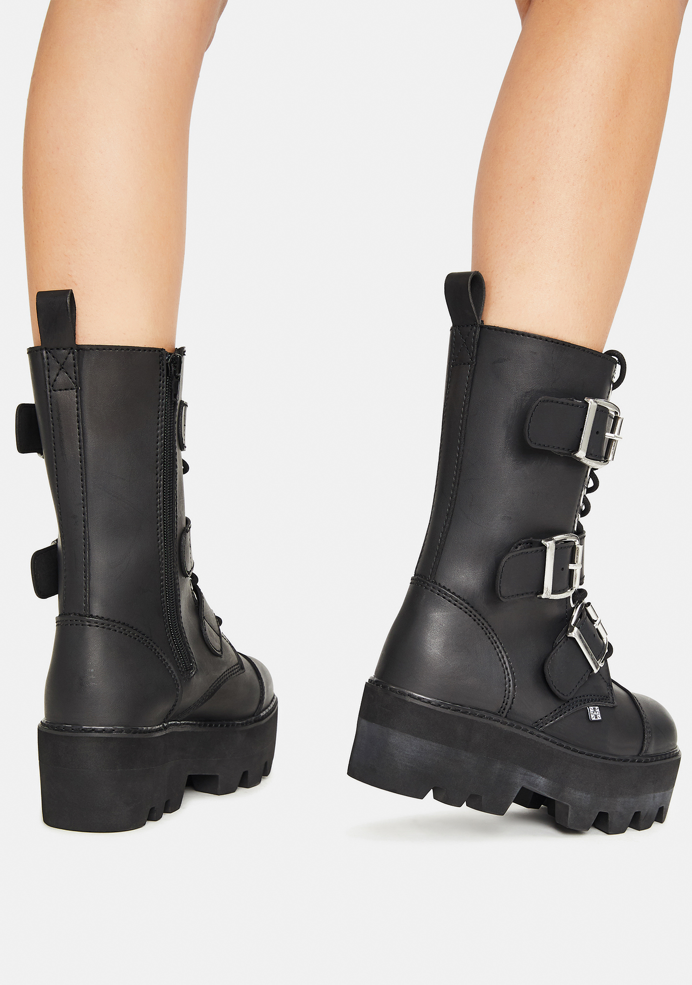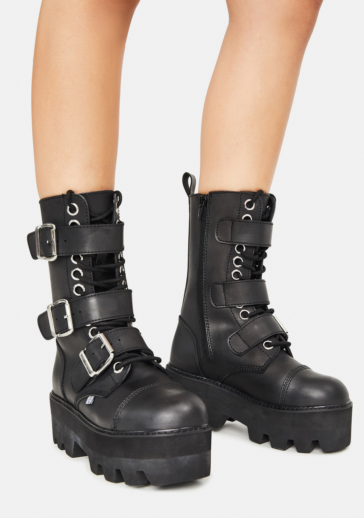 Black 12-Eye 3 Strap Dino Boots feature a vegan leather construction, front lace up closures with layered buckle straps, and platform soles.