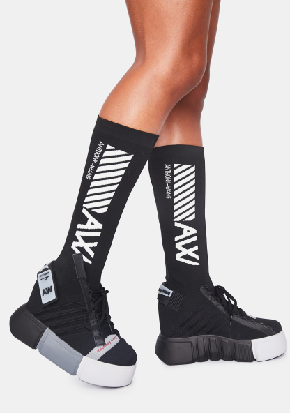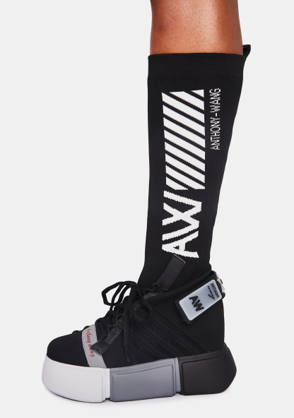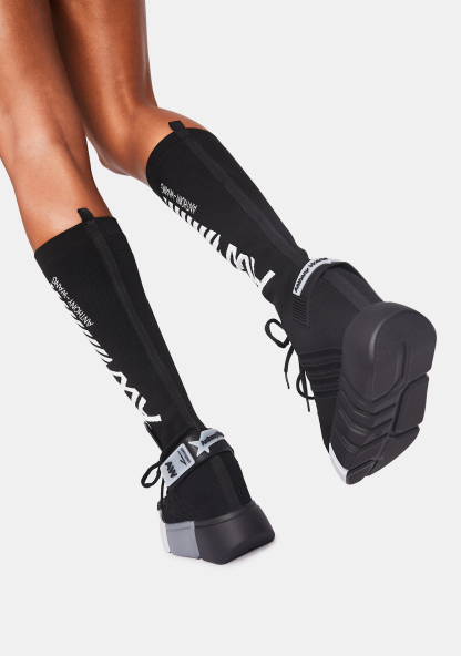 Black Cranberry Sock Sneakers you never slow down. These sport sneakers have multi tone platform soles, a canvas upper with lace up and velcro details, and a built in knee high sock with brand logos.