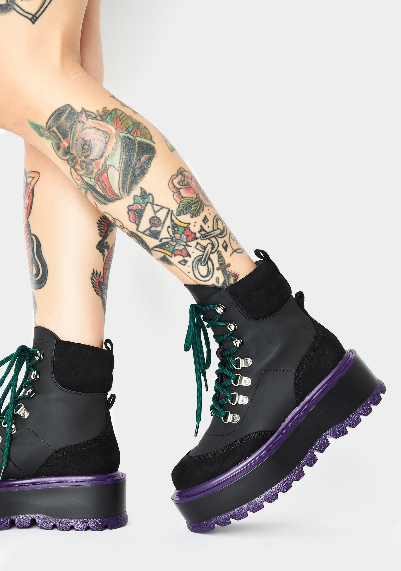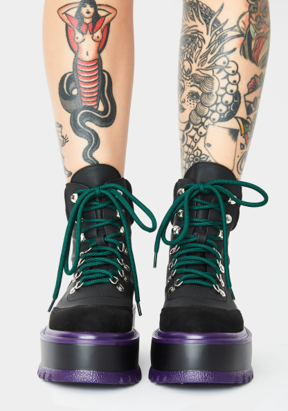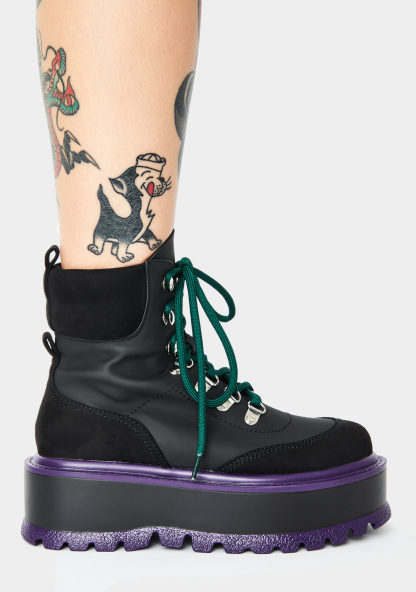Black Hydra Matrix Platform Boots will have ya on your worst behavior. There’s no hesitation in these sikk ankle boots that have contrast stitching, front lace up closures, N’ chunky platform soles.