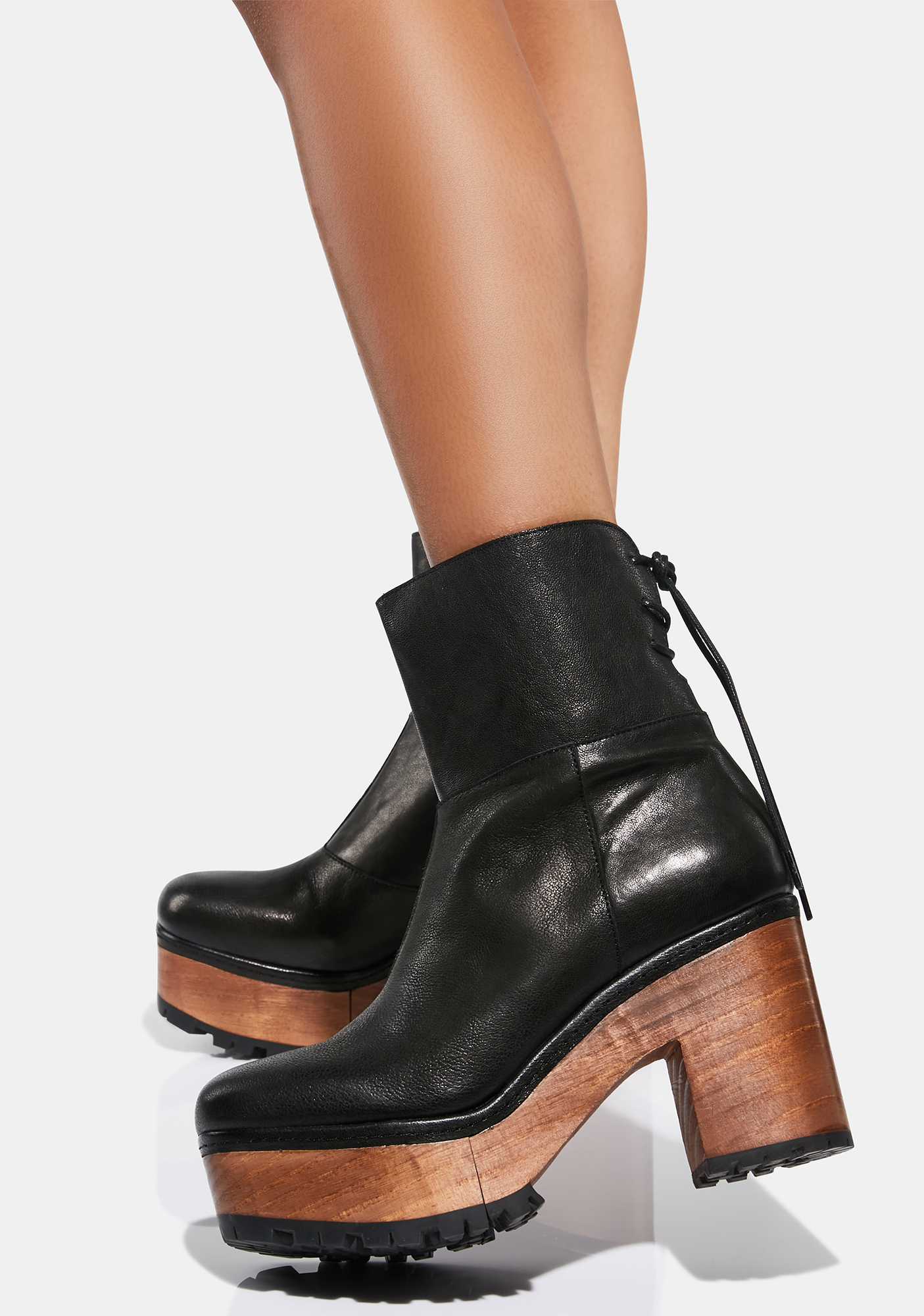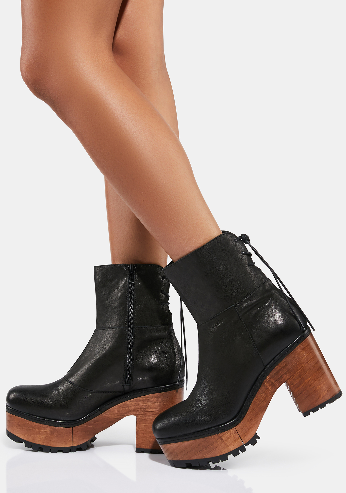 Black Kenna Platform Clogs feature distressed leather uppers, adjustable lace up ankle shafts, inside zipper closures, cushioned footbeds, and wooden platform soles.