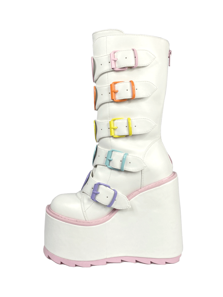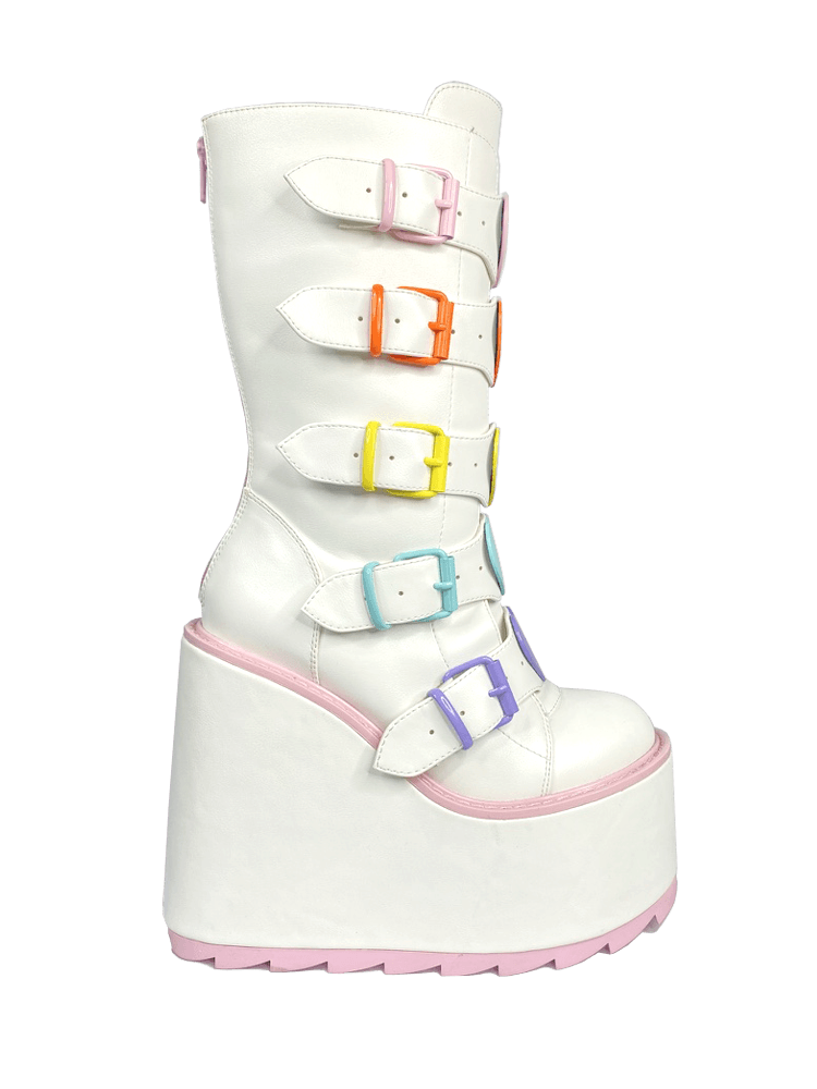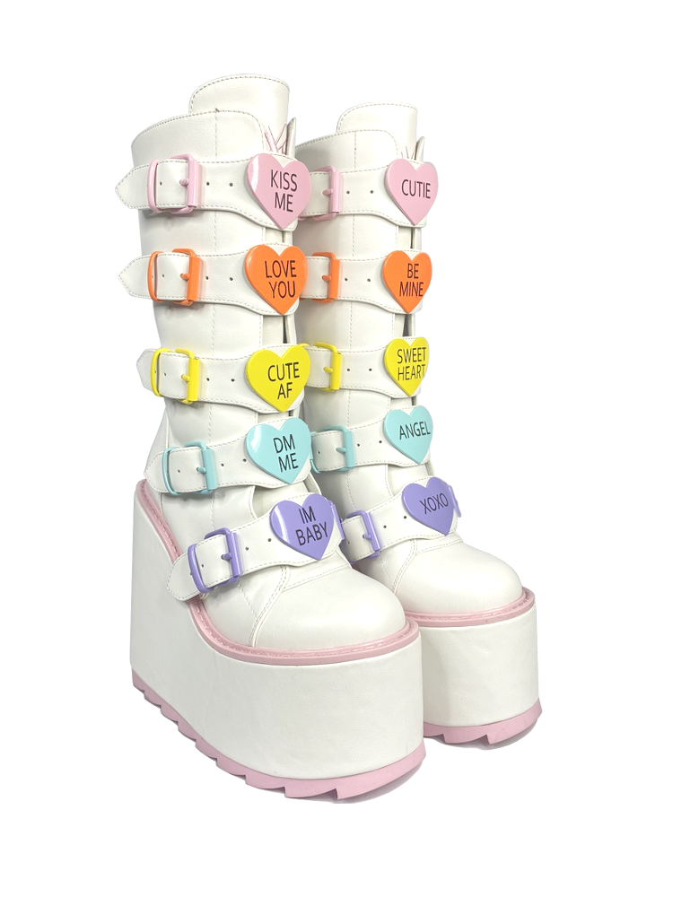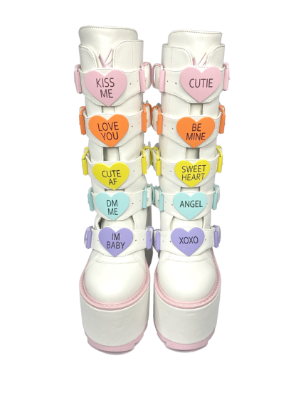 These are cute on another level! Be THE valentine all year-round with these white and pink Boots 's with pastel innocence. Charm all your lovelies with a variety of cute inscriptions on candy-like, heart shaped hardware.