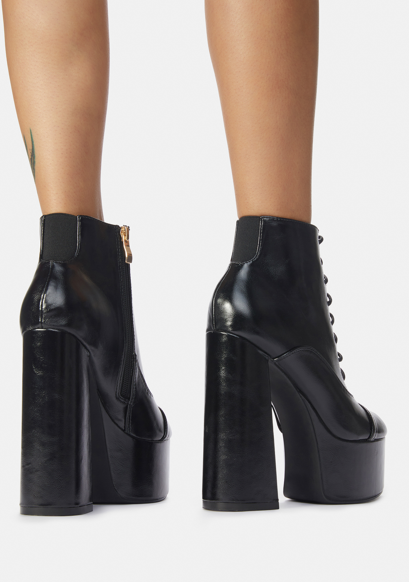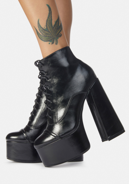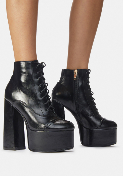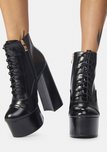 Bouncin' Back Lace Up Ankle Boots feature a chunky heel, platform sole, vegan leather fabric design, side zip closure and lace up front.