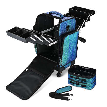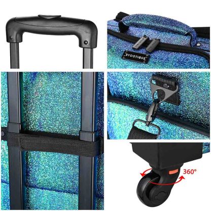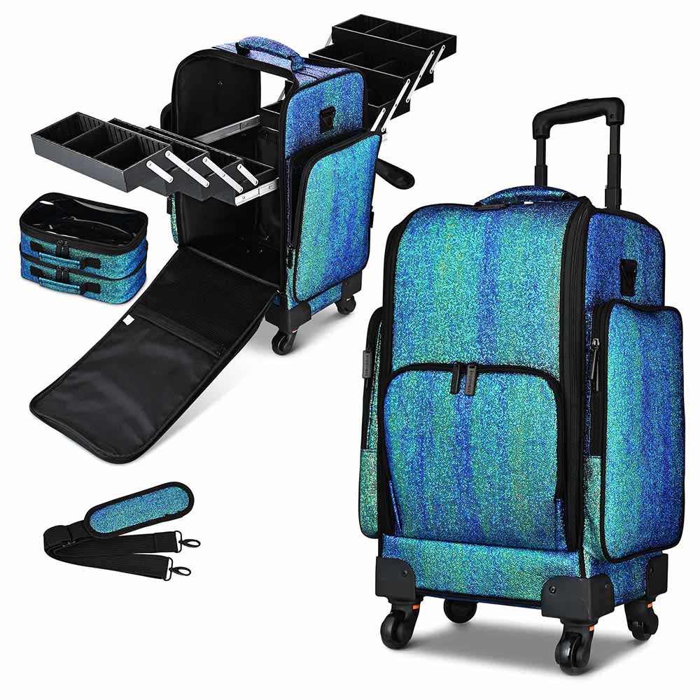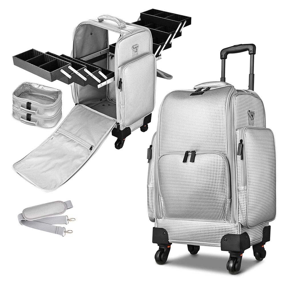 Portable Rolling Cosmetic Bag comes with 8 extendable trays, 2 removable clear pouches & large side pockets for better organization. This Makeup Storage Bag is a perfect gift for makeup lovers, makeup artists, freelance beauticians, hairdressers.