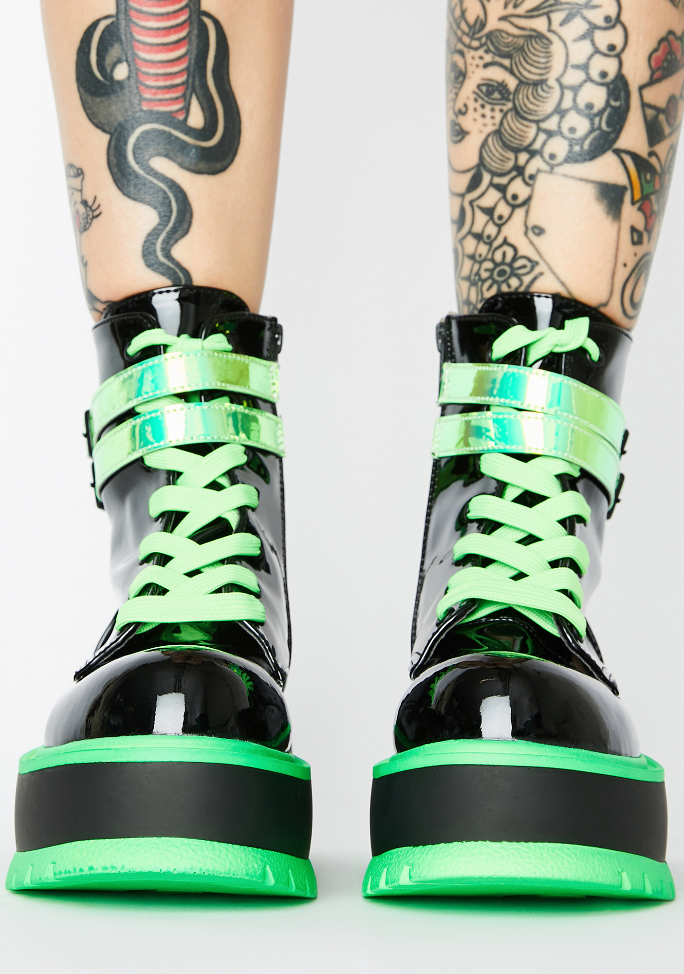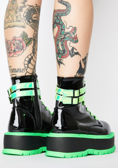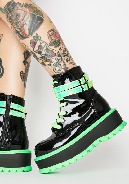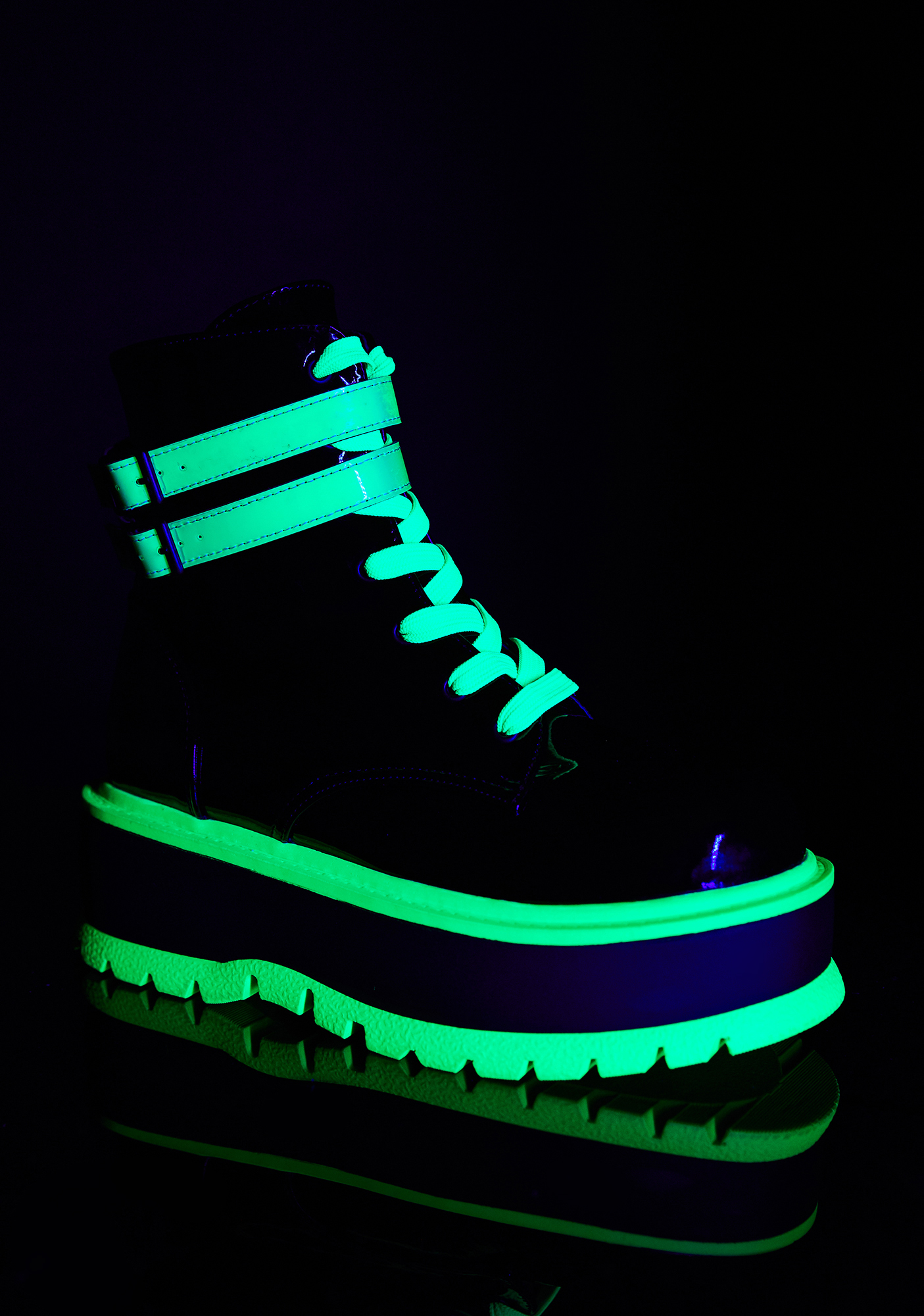 Chemical Fuse UV Platform Boots got ya starting a nuclear reaction! Stomp through hyperspace in these UV reactive patent boots that have chunky platforms, iridescent double buckle ankle straps, adjustable lace-ups N’ side zip closures.