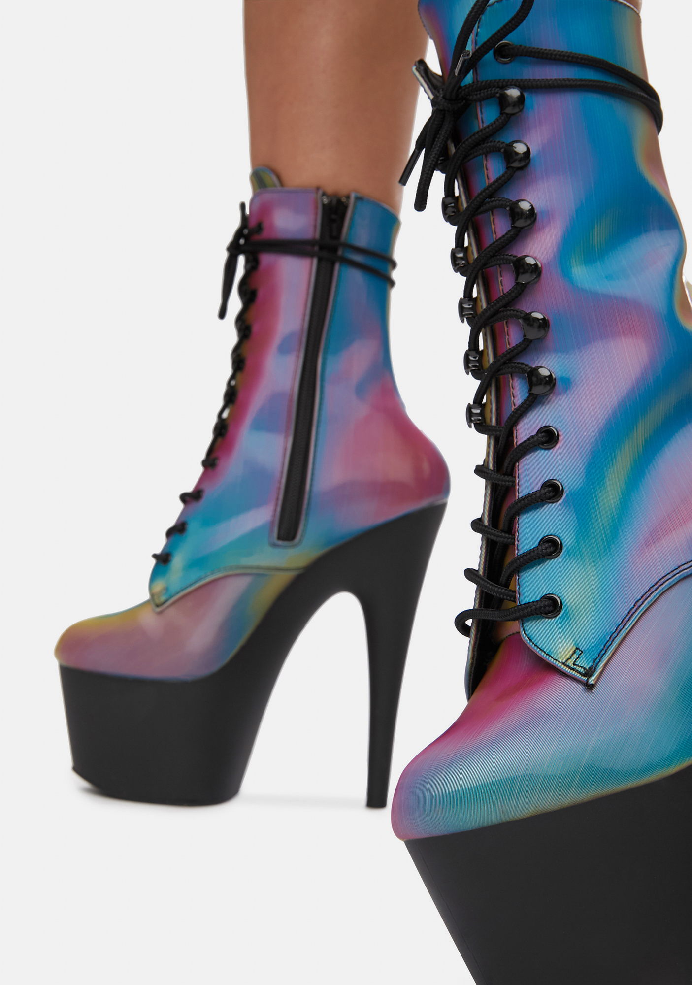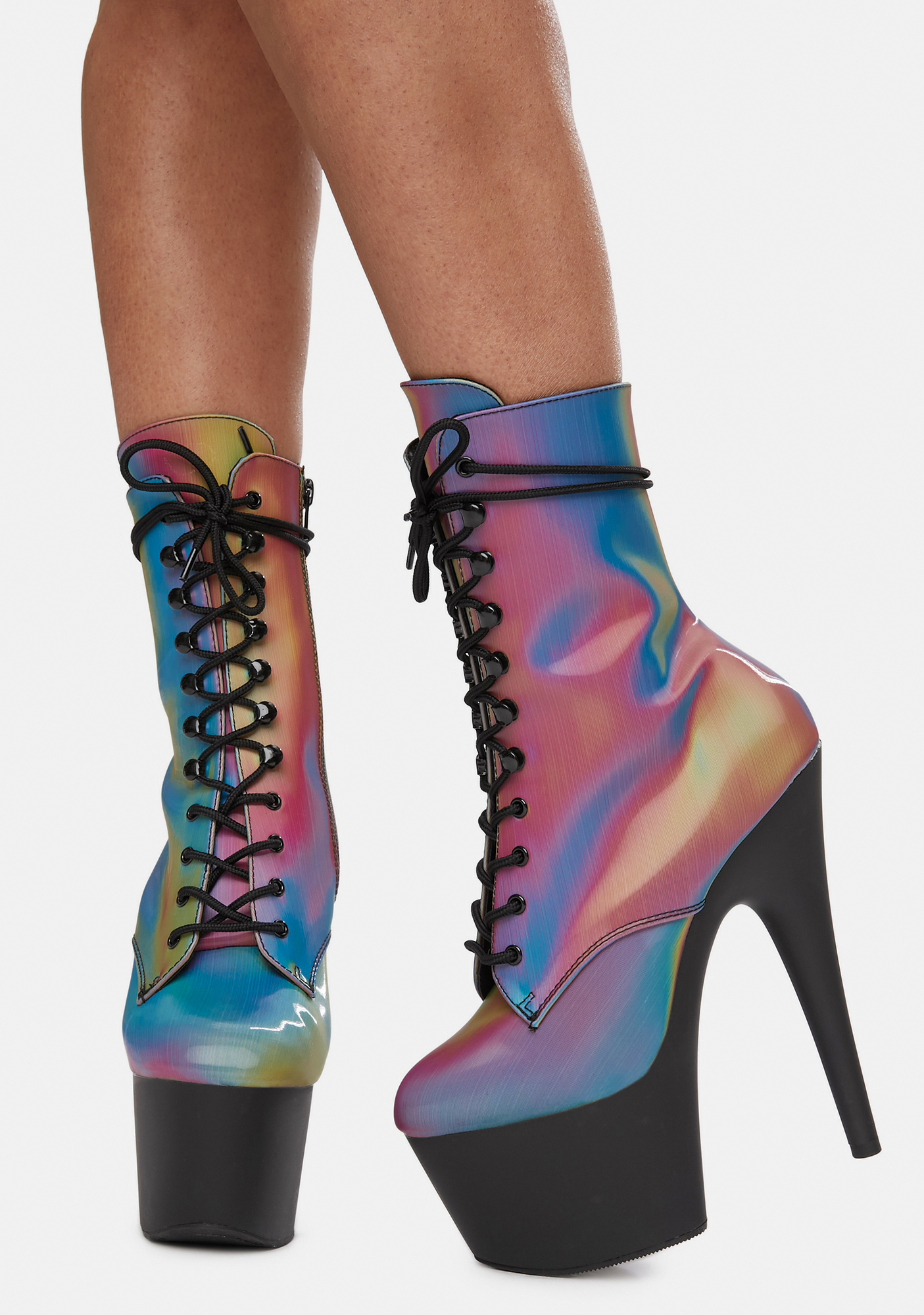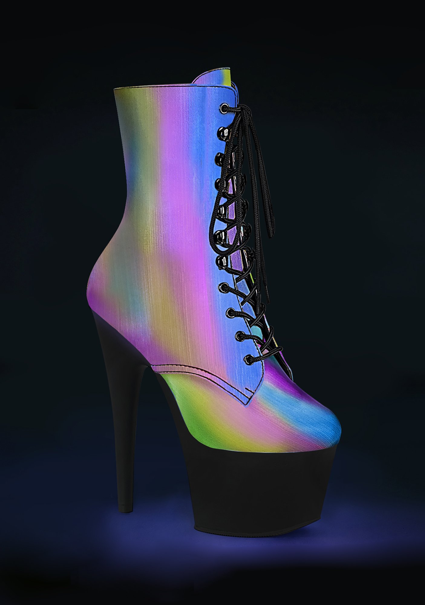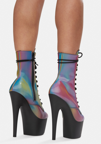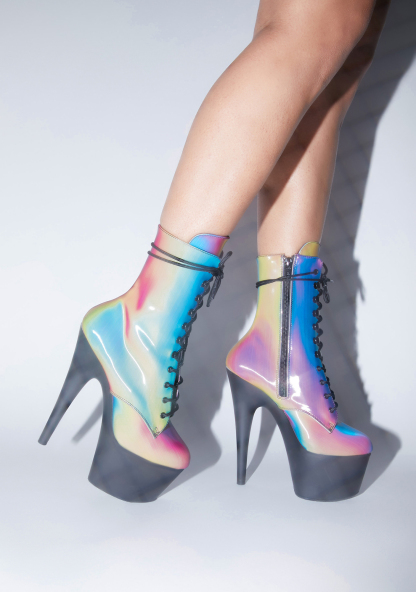Chromatic Own The Spotlight Reflective Platform Boots cuz you don’t share the limelight! These platform booties have a sikk reflective construction, tall stiletto heels, lace up fronts, and side zip closures.