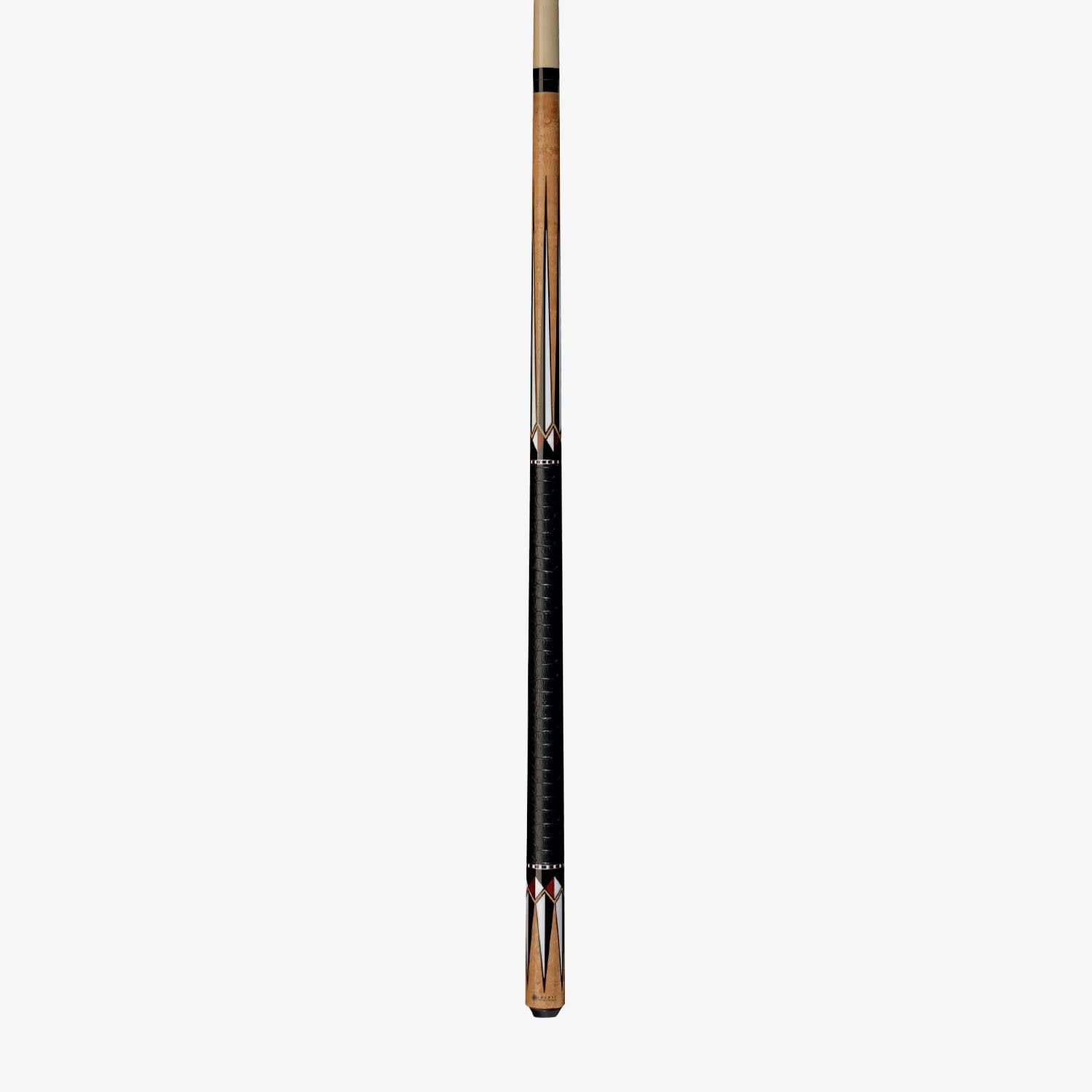 This modern classic Lucasi Custom cue features an antique-stained Super Birdseye Maple forearm and butt with six-point split black/imitation bone inlay points, split Rengas/imitation bone diamond inlays, black crowns, checked rings, black snake print embossed leather wrap, quick-release Uni-loc joint, and Zero Flexpoint Solid Core Low Deflection Technology Shaft.