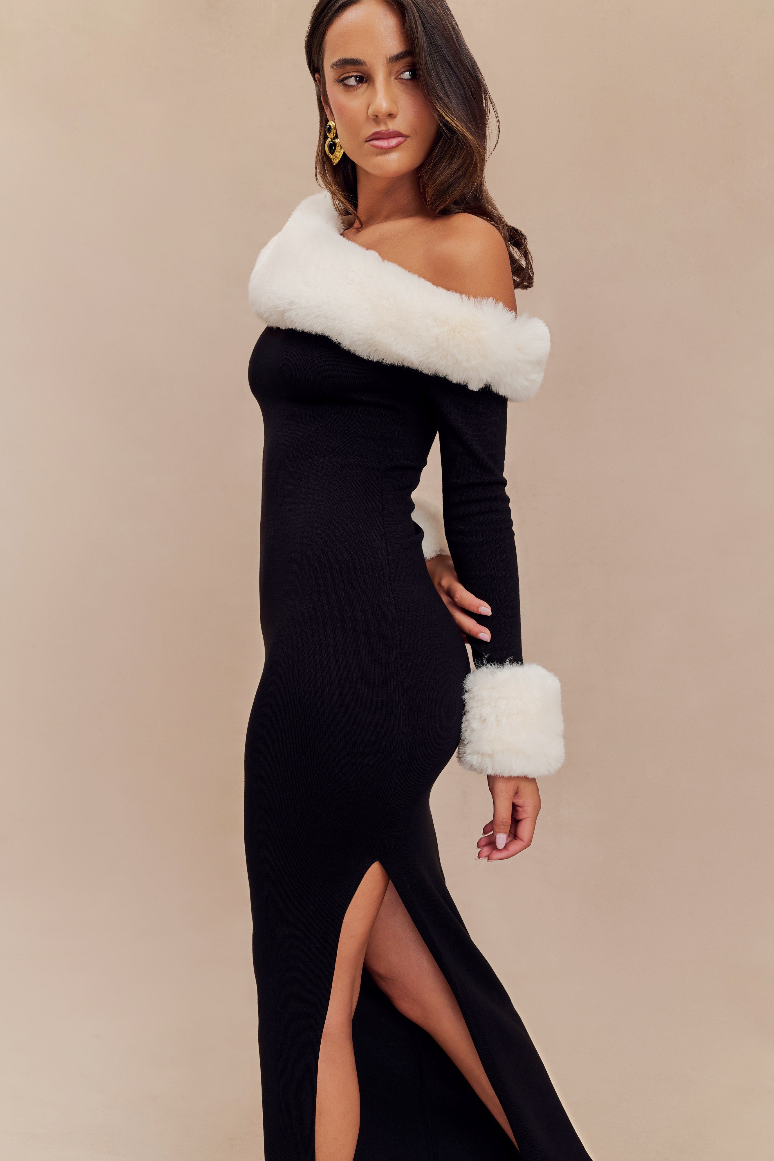Dawn Faux Fur One Shoulder Slit Maxi Dress