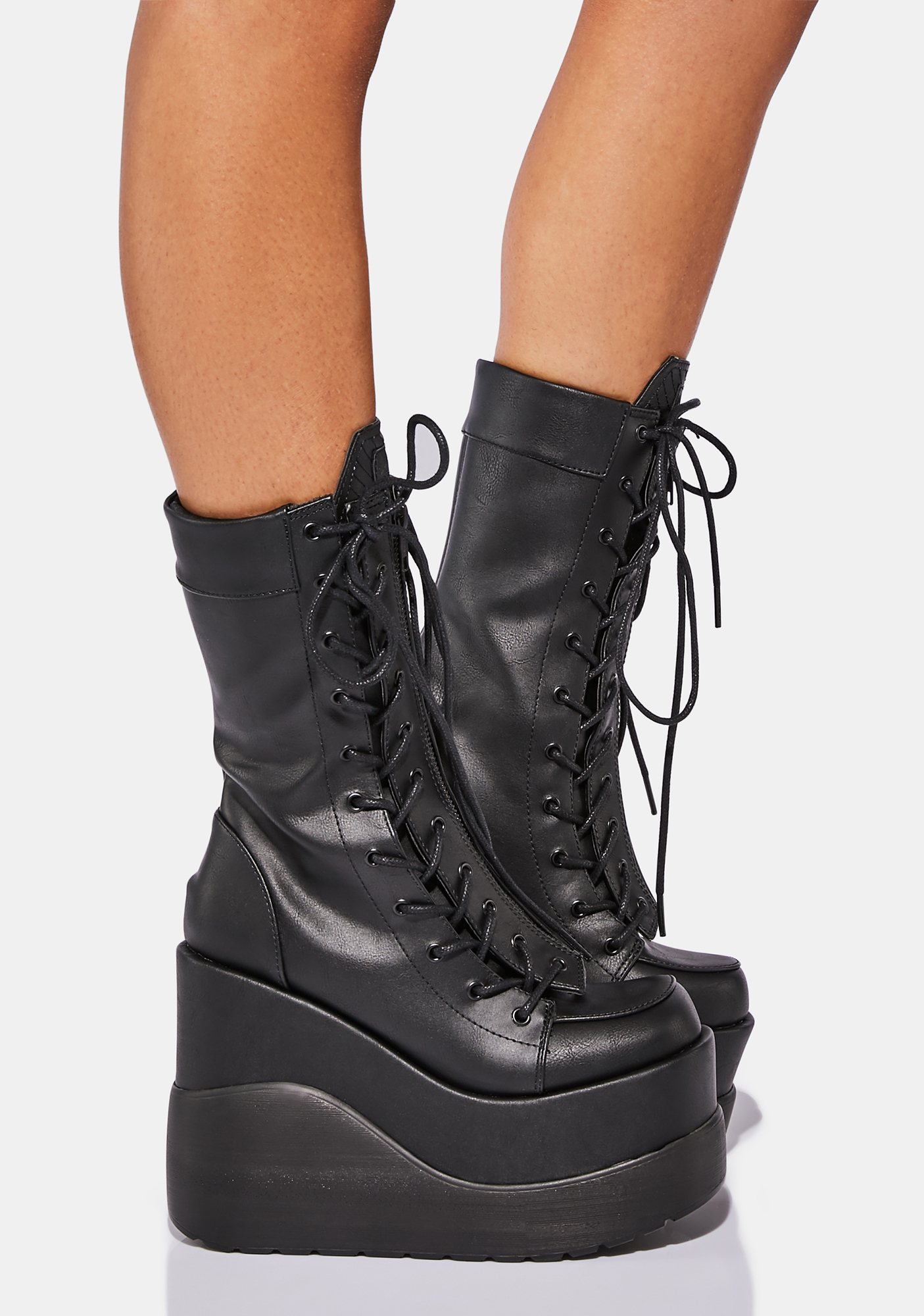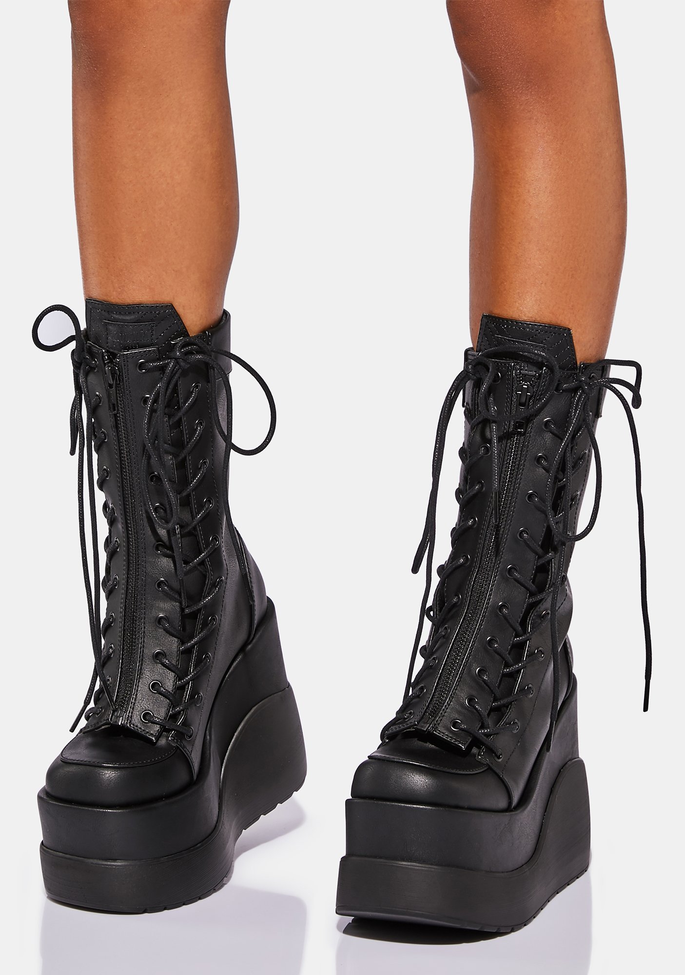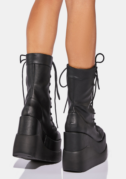 Deep Void Platform Boots have a vegan leather construction, tiered wedge platform soles, adjustable double lace-ups, front zip closures, padded collars, and coffin shaped tongues.