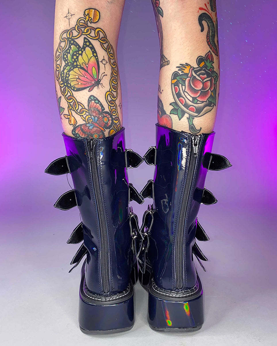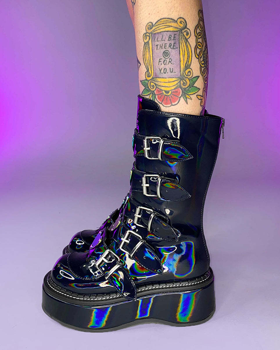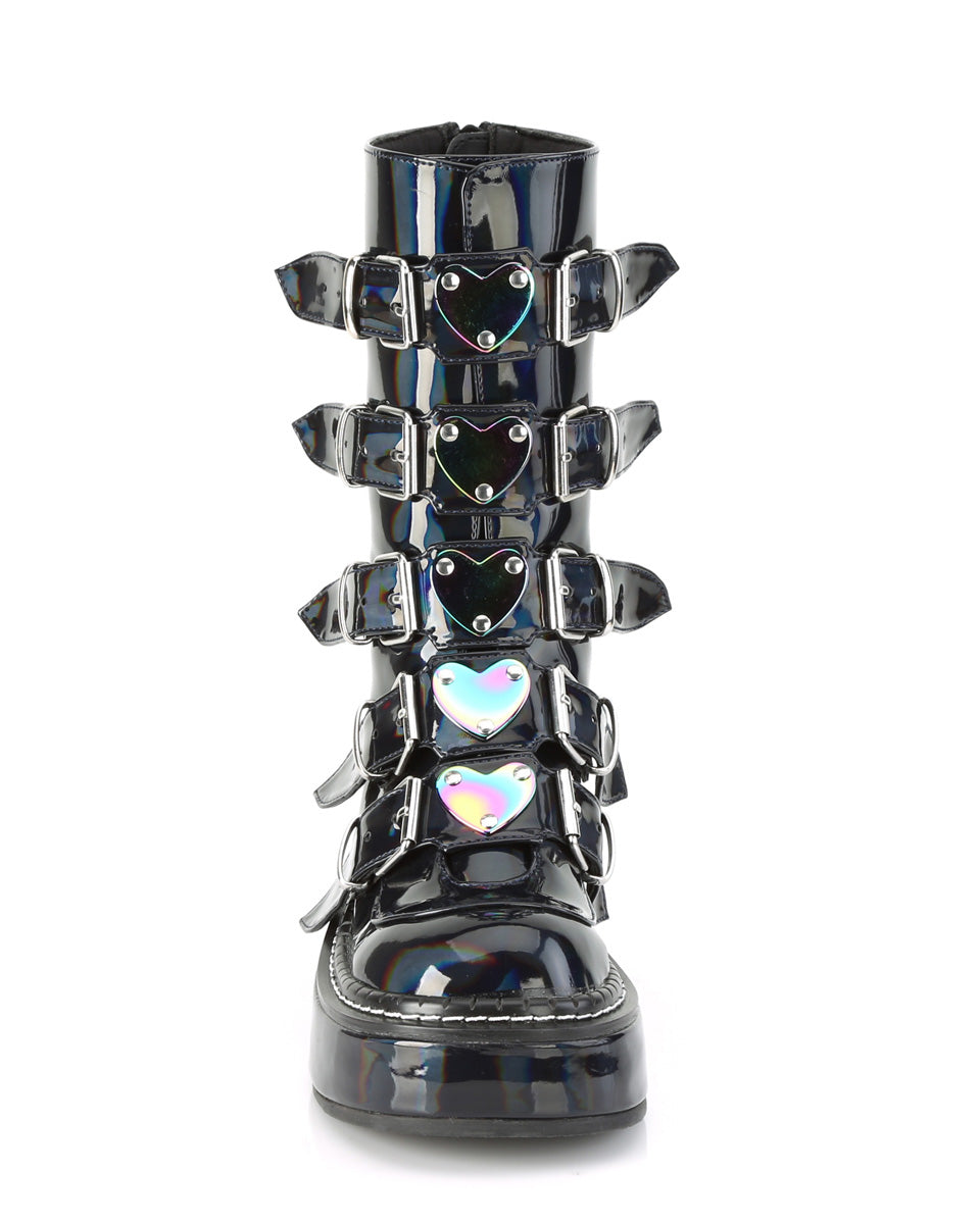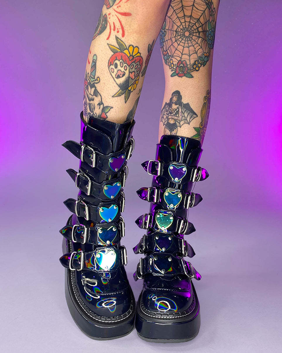 2" (51mm) Platform Mid-Calf Boot Featuring 5 Buckle Straps w/ Colorful Plating Heart Shaped Metal Plates at Center, Back Metal Zip Closure