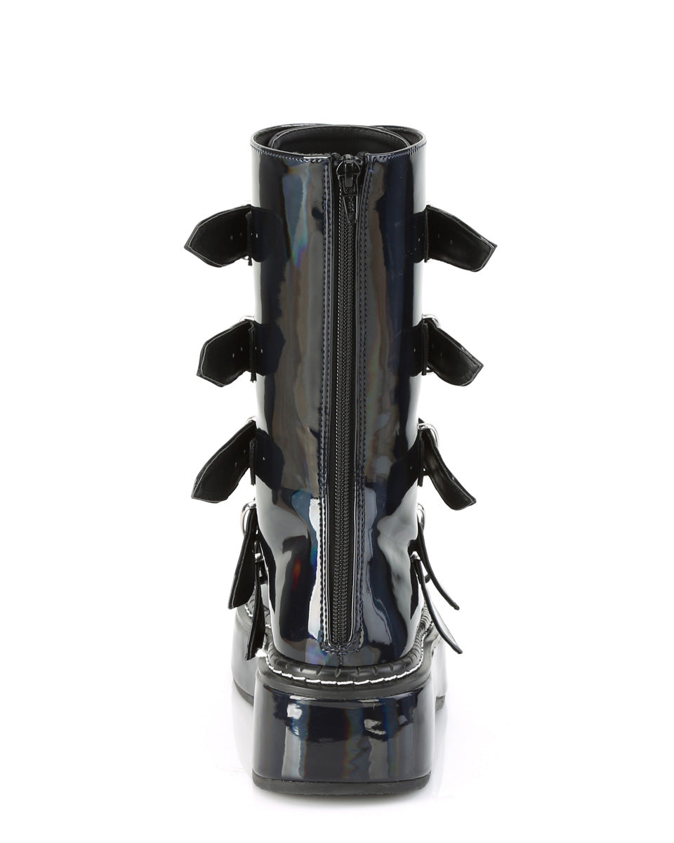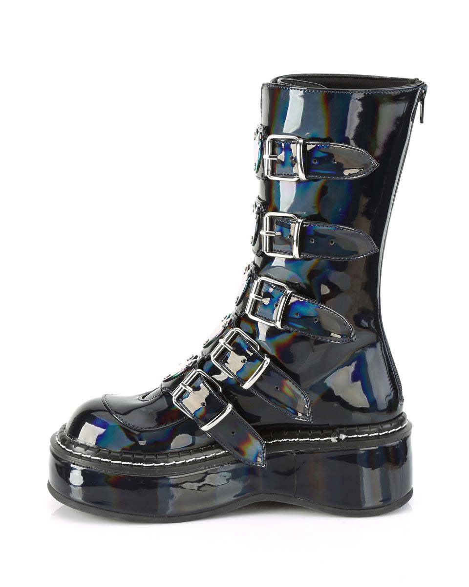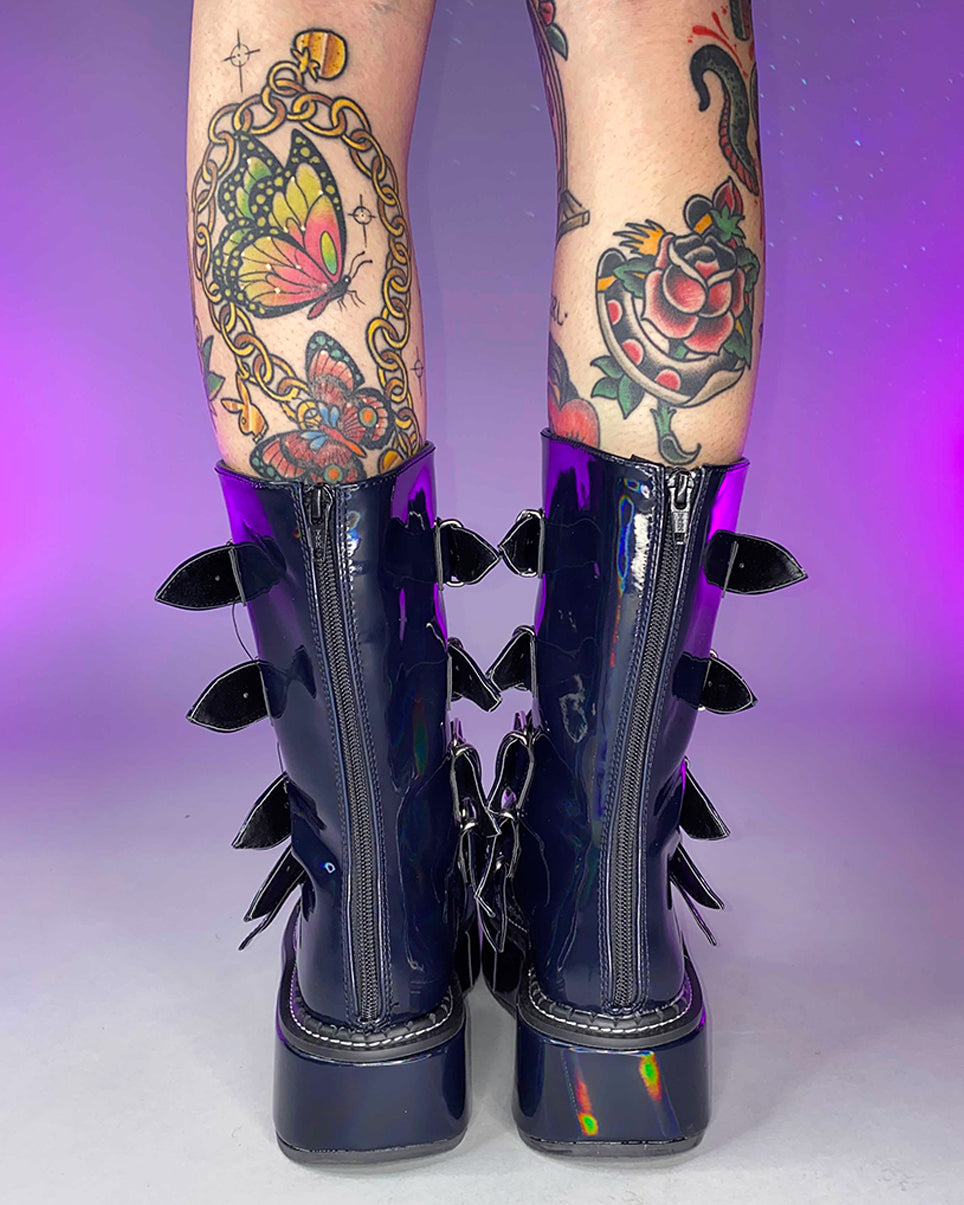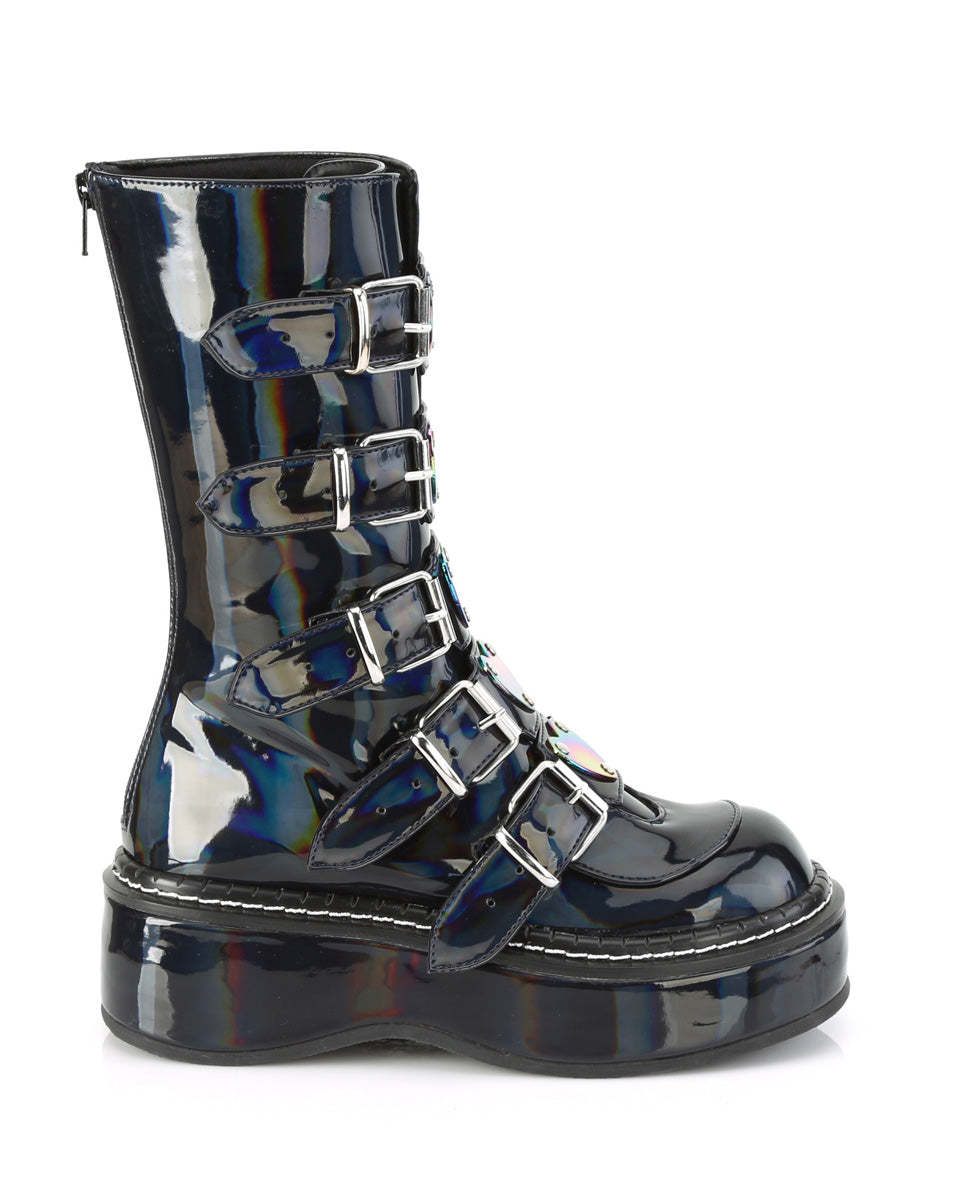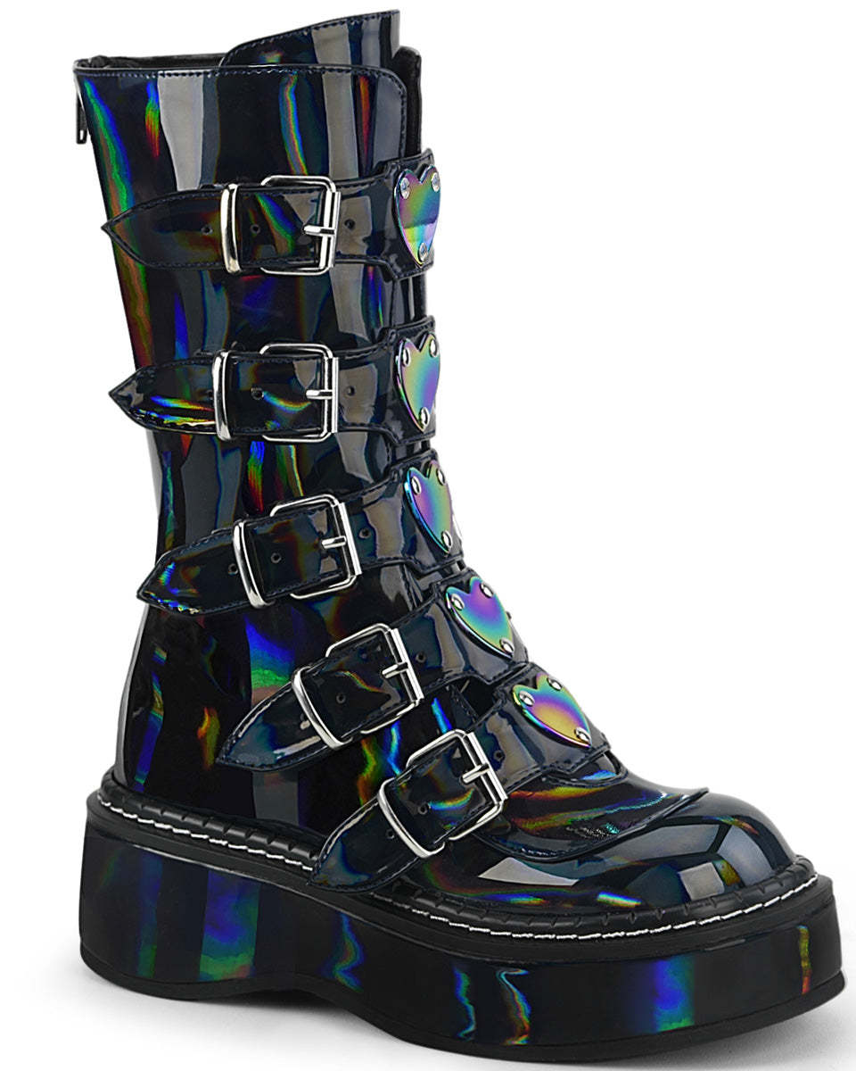2" (51mm) Platform Mid-Calf Boot Featuring 5 Buckle Straps w/ Colorful Plating Heart Shaped Metal Plates at Center, Back Metal Zip Closure