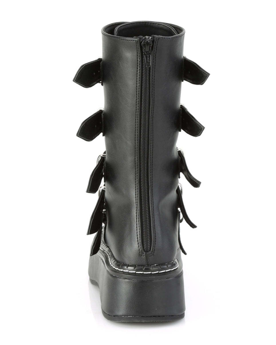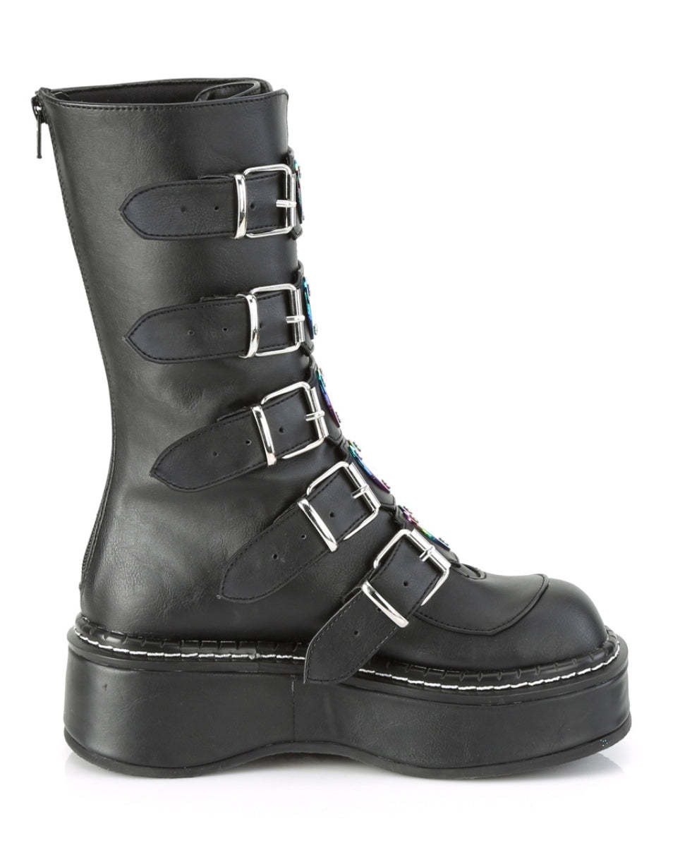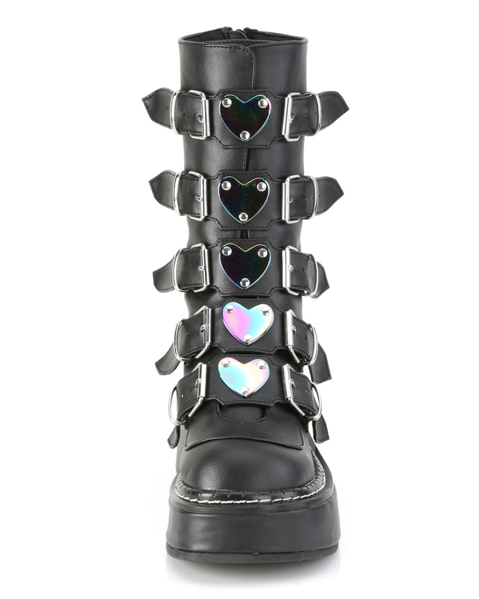 2" (51mm) Platform Mid-Calf Boot Featuring 5 Buckle Straps w/ Colorful Plating Heart Shaped Metal Plates at Center, Back Metal Zip Closure