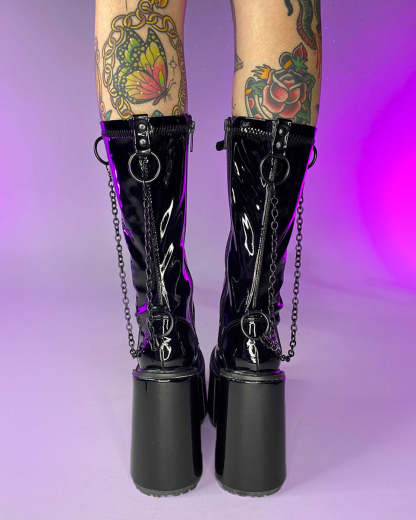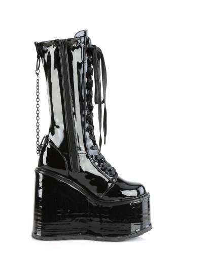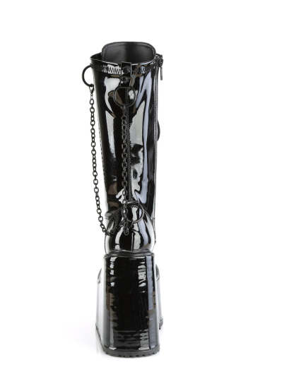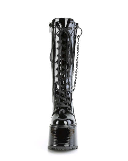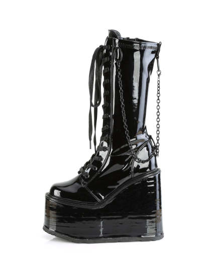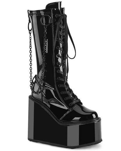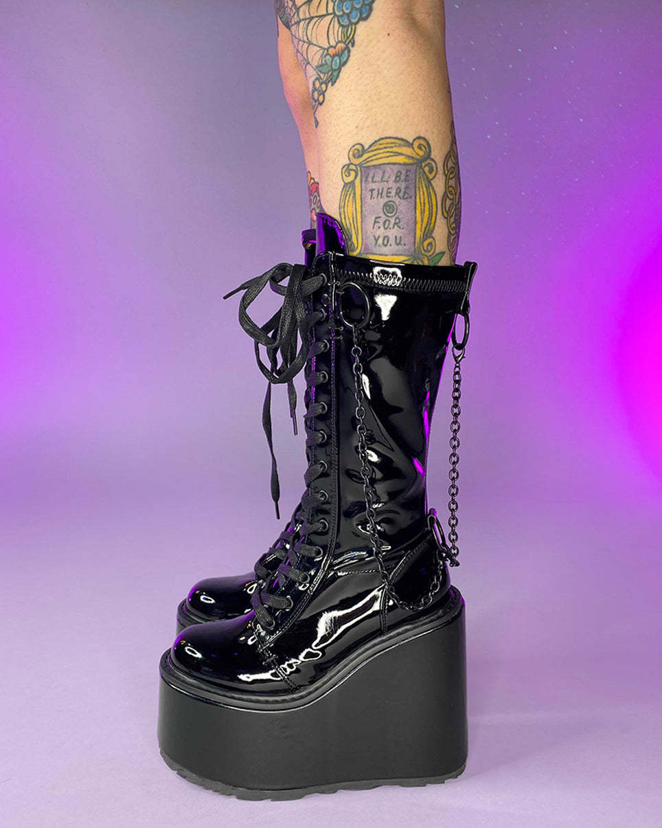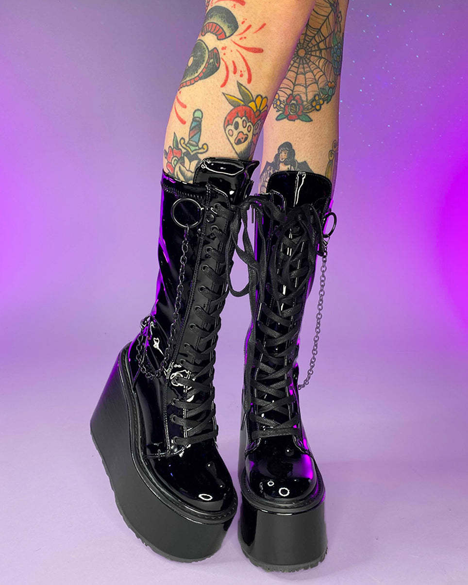 5 1/2" (140mm) Wedge Platform Lace-Up Front Stretch Knee High Boot Featuring Removeable Metal Chain Detail, Inside Metal Zip Closure