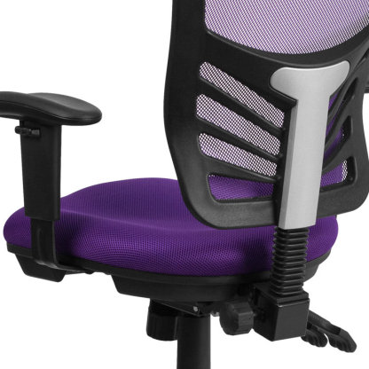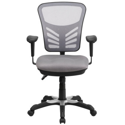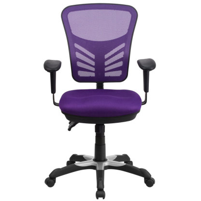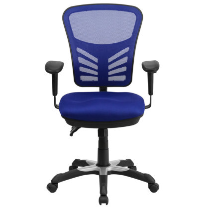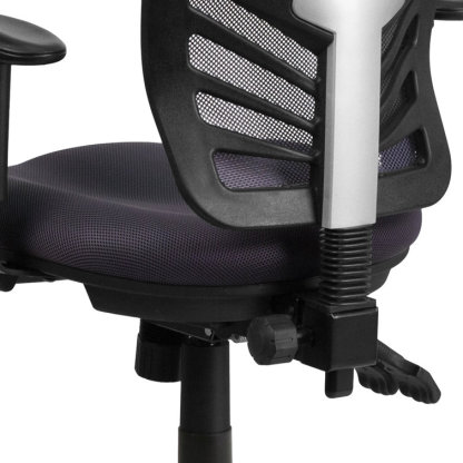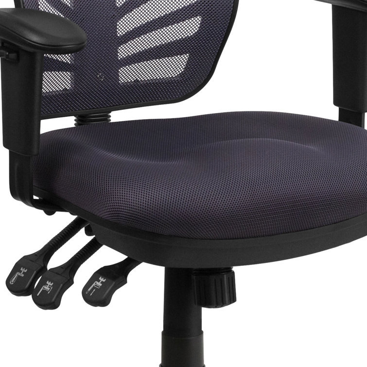 This attractive office chair is loaded with options to maximize your comfort and productivity. The transparent mesh back allows air to circulate, keeping you cool no matter how high the pressure gets. Built-in lumbar support helps prevent back strain and you can adjust the back height a full 2" up and down. Easily adjust the seat's back angle, seat height, and tilt angle using three paddle mechanisms. The contoured padded swivel seat is filled with 2" of foam. Height-adjustable padded arms take pressure off your shoulders and neck. Turn the tilt tension adjustment knob to increase or decrease the amount of force needed to rock or recline. Lock the seat in place with the multi-tilt lock mechanism. The heavy-duty, nylon base with silver accents and dual wheel casters makes it easy to roll. This mesh executive chair is a stylish chair that will keep you cool and comfortable.