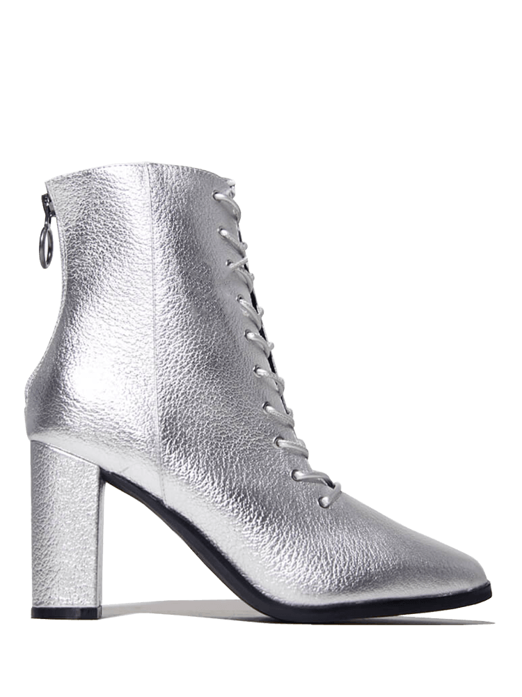 Eclipse them all in these appropriately-named booties. These silver leather lace-up booties can be paired with any look to add an eye-catching punch to any outfit.