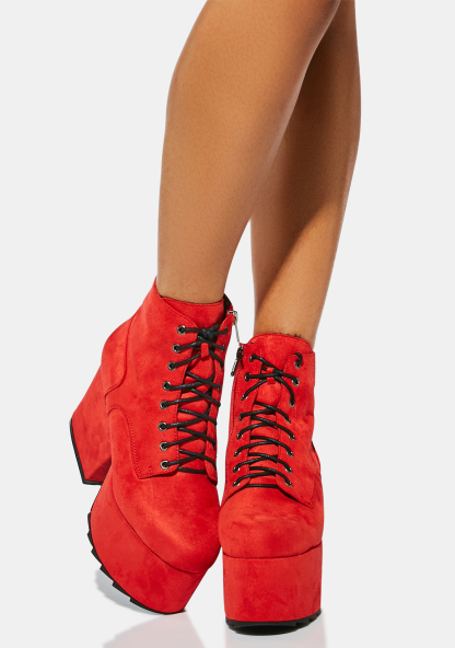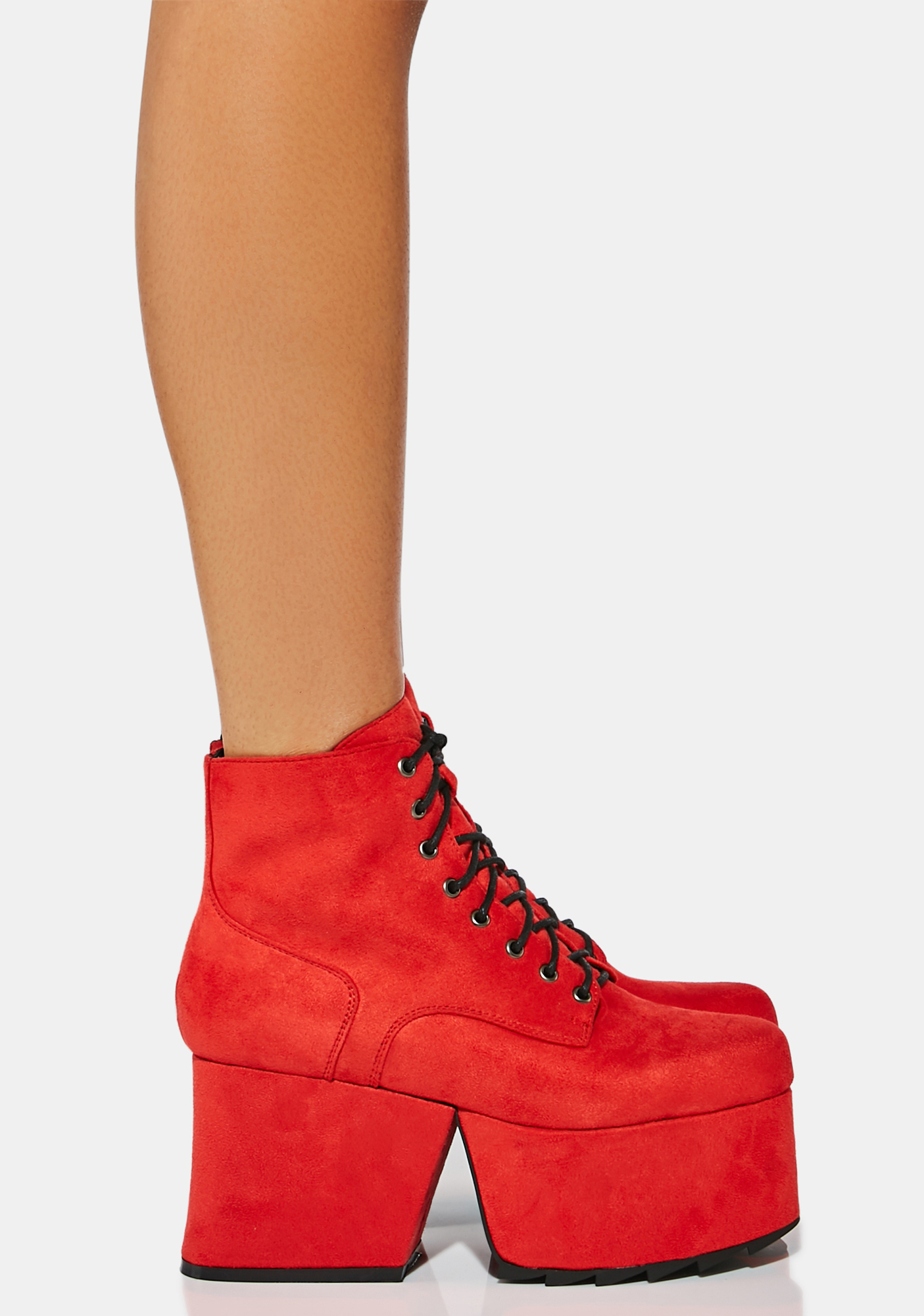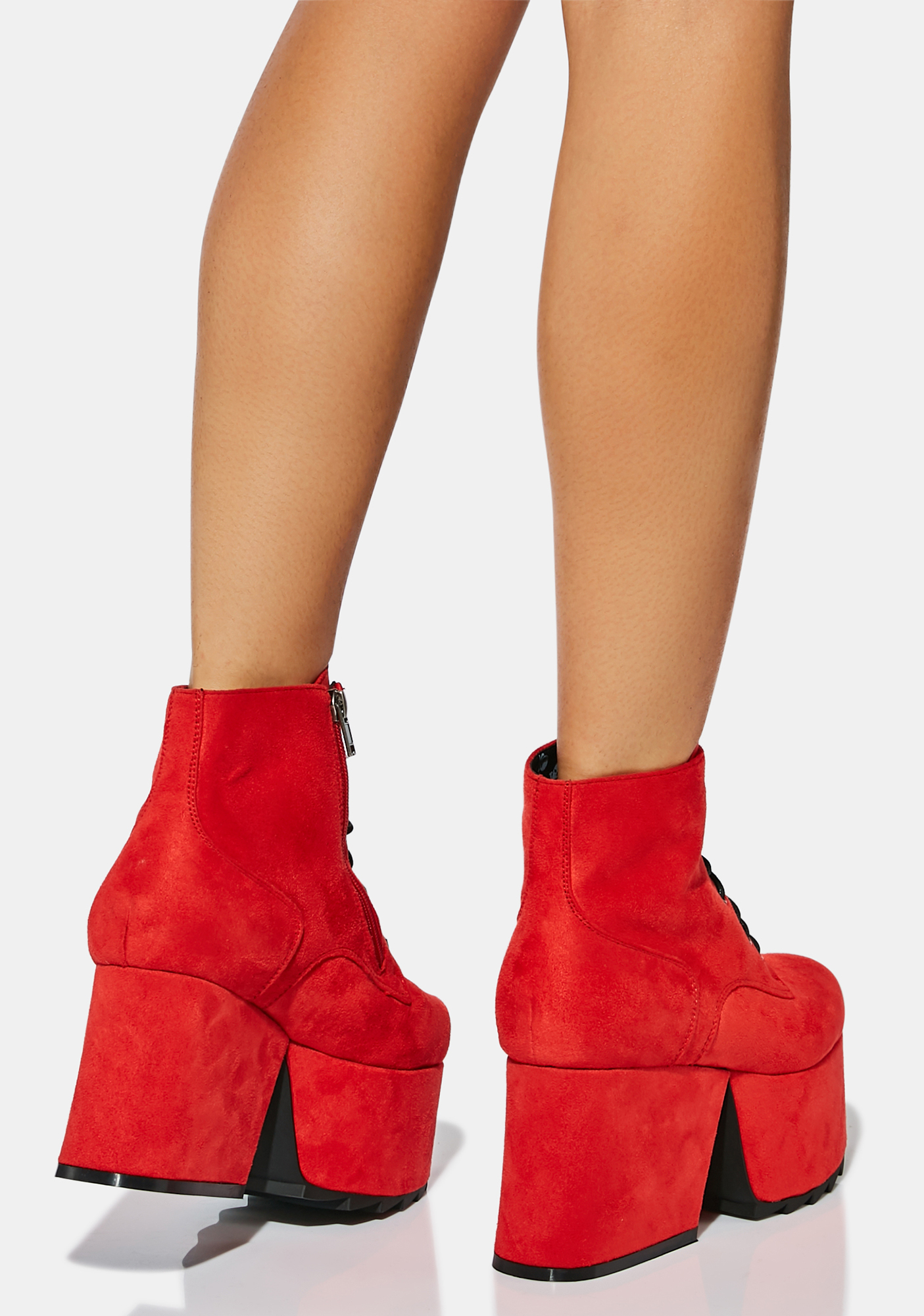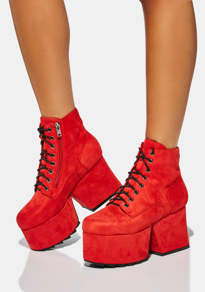 Fire Crushed Velvet Platform Boots have a vegan suede construction, a low ankle rise, a chunky heel and platform sole, laces up the front, and a zipper closure near the eyestay.