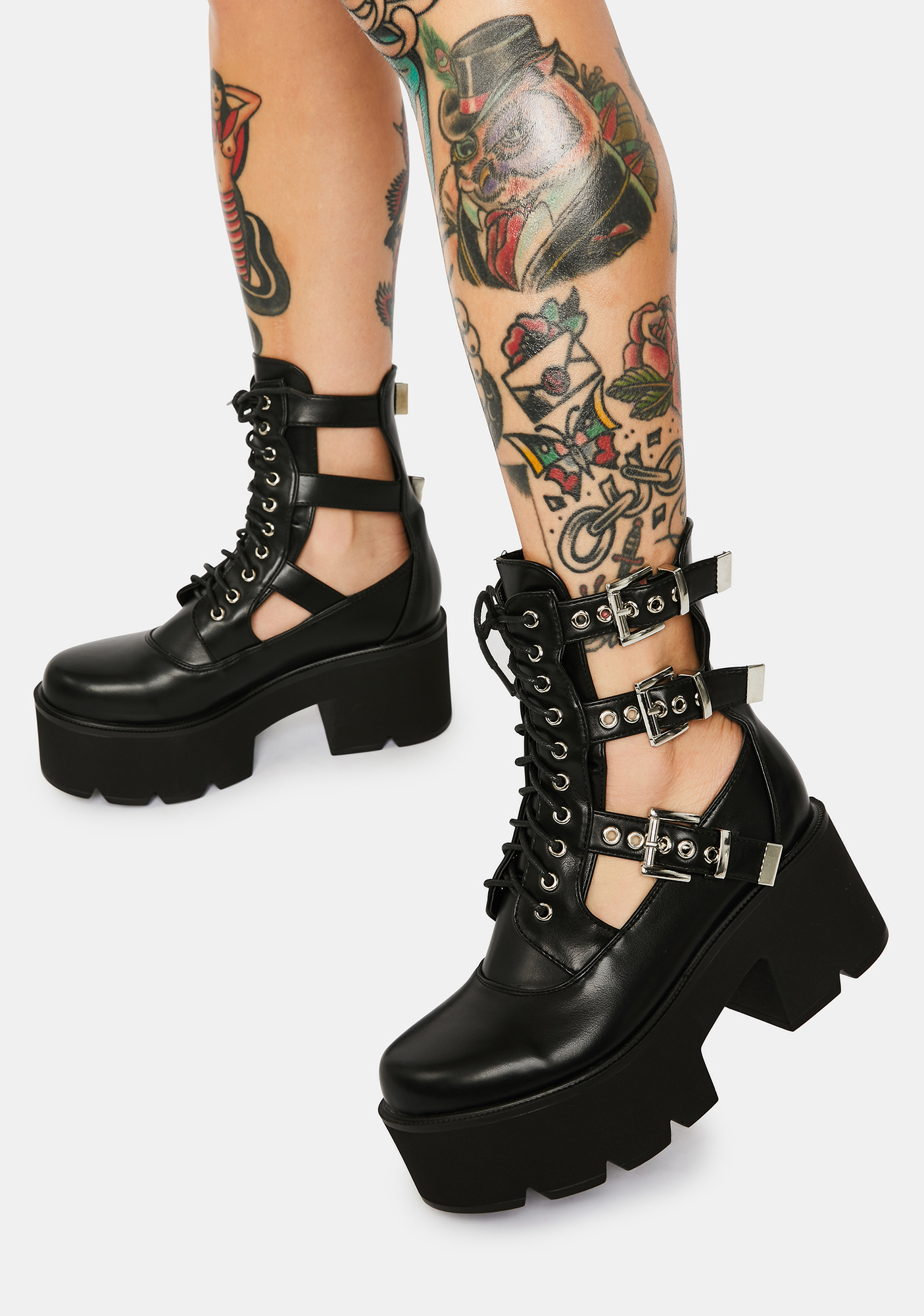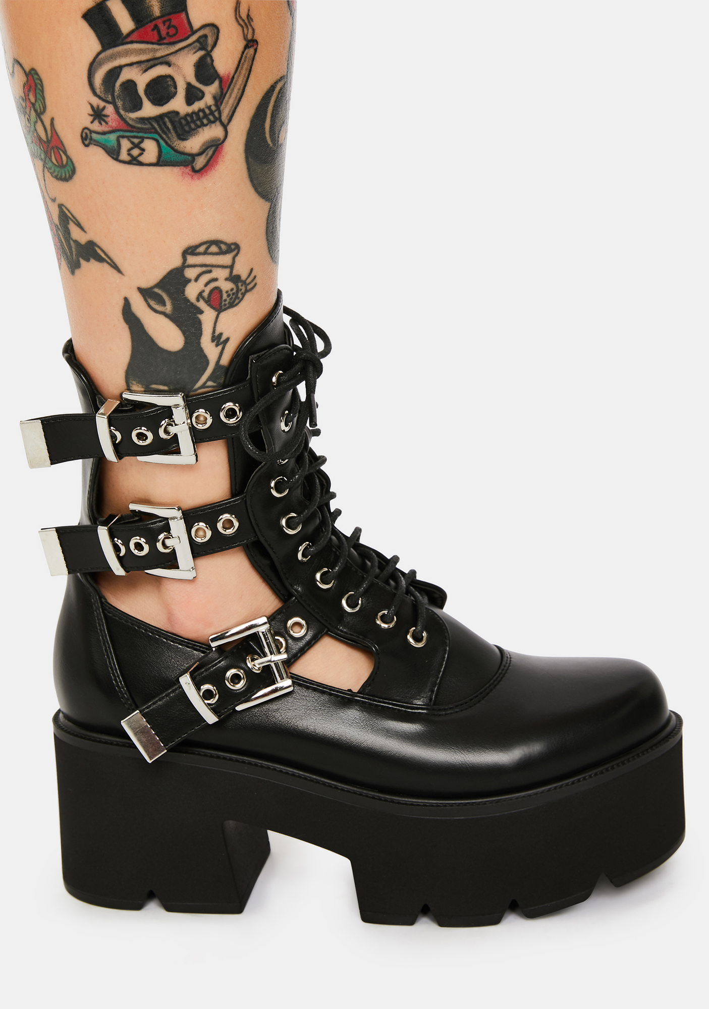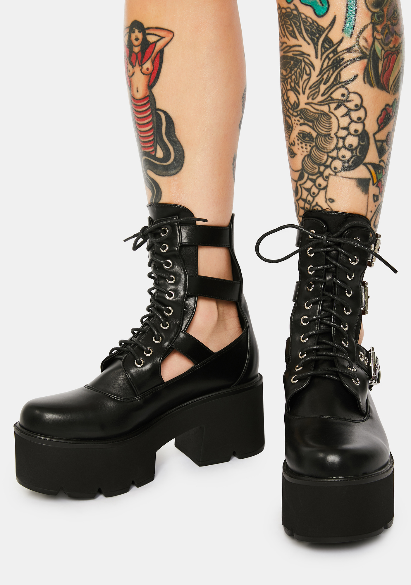 Get Gone Buckle Platform Boots feature a faux leather upper, side cutouts with adjustable buckle straps, and front lace up closures.