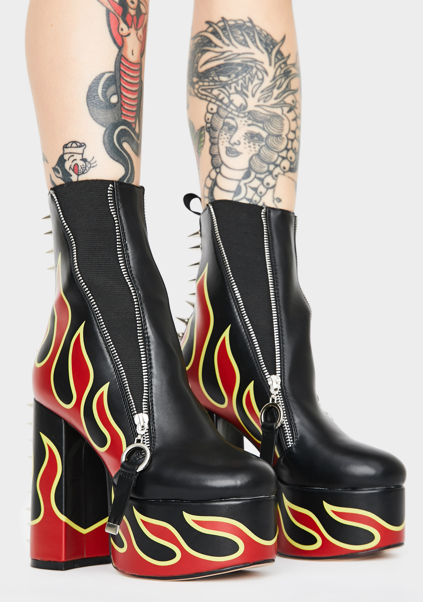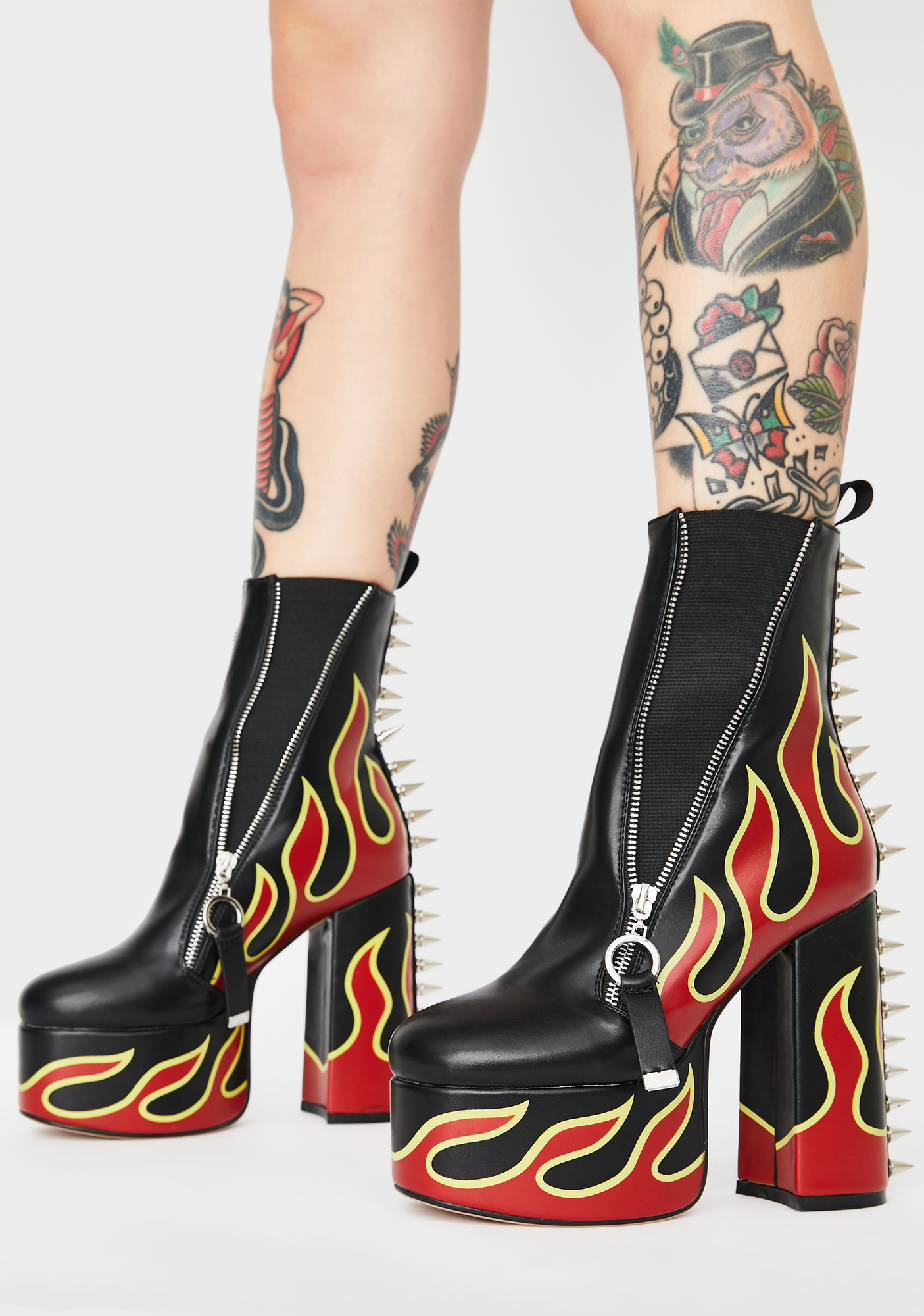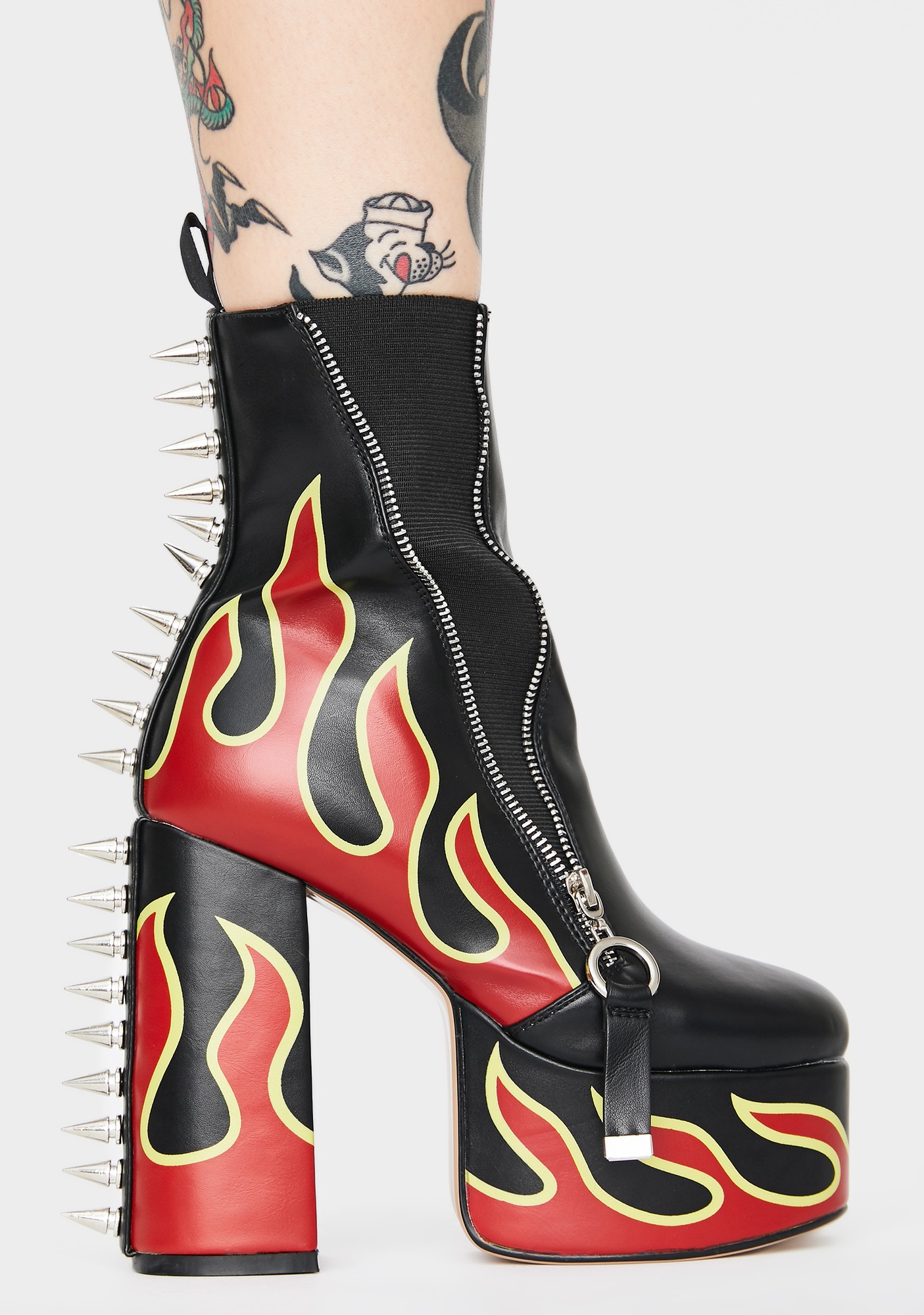 Grillz Flame Platform Boots cuz you’ve reached yer melting point, bb! Add fuel to the fire with these lit heeled booties that have a sikk flame print, spiked accents on the back, side zip details, and thicc platforms.