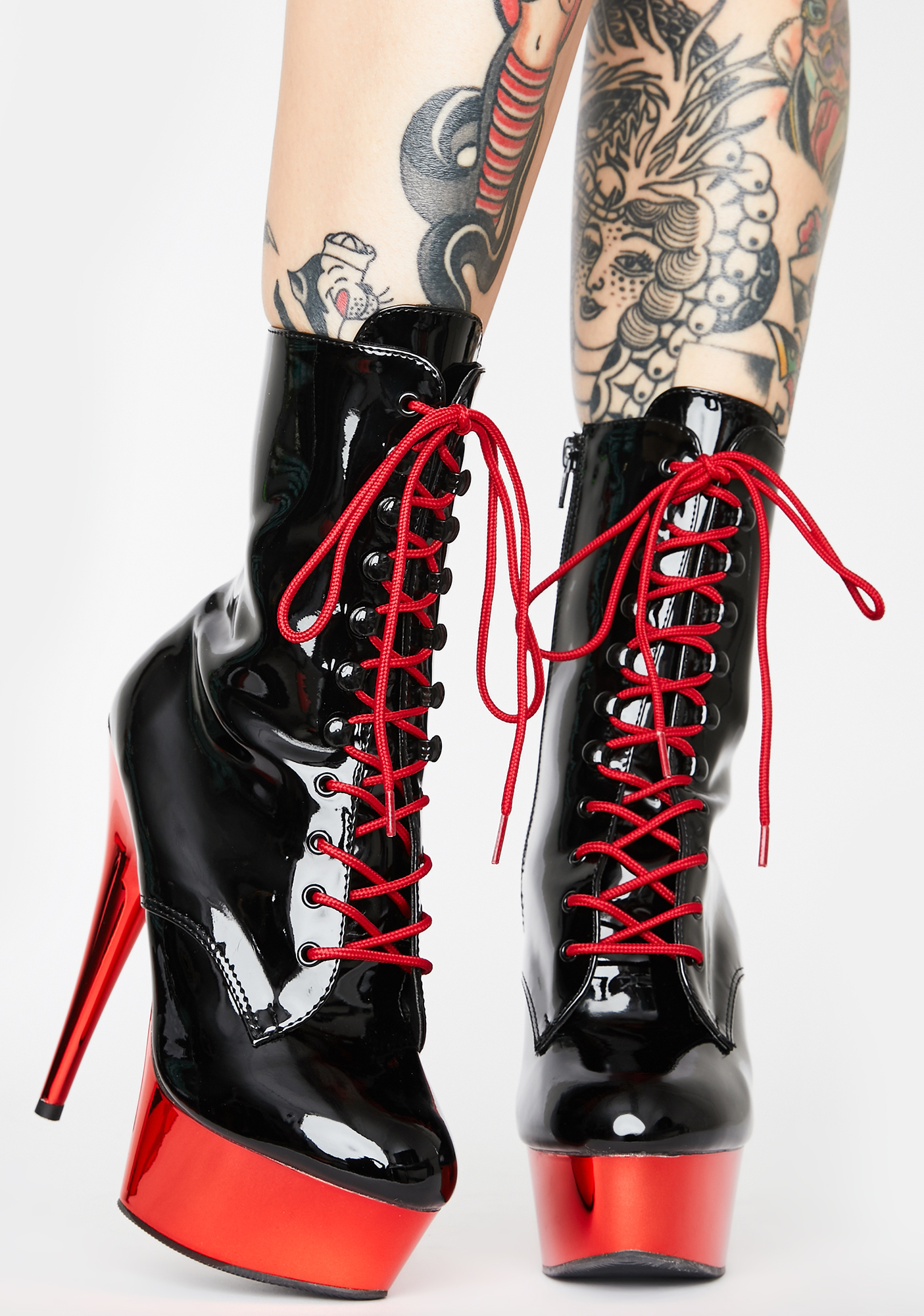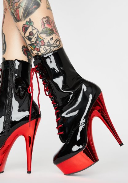 Hot Sinful Addiction Stiletto Boots got ‘em fiendin’ for u, bb! Leave ‘em always wanting more after seeing you strut in these stiletto ankle boots with a patent upper construction, lace up design, shiny mirror wrap sole and inside zipper closure.