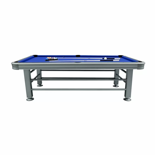 Bring the fun of playing pool outdoors with the Imperial 7ft Outdoor Pool Table. The table features all aluminum corners, legs, and anodized aluminum rails with K66 cushion rubber. The bed comes out of the box clothed in Navy waterproof Taclon cloth. Mostly assembled; just bolt on the legs and use the large 5-inch built-in leg levelers to level the table and begin playing. The bed is made of Pearl Board; 140 layers of Formica sheets and polyester resin. It is put through a high temperature and pressure process to form the bed to make it waterproof, fire retardant, durable, and keeps it level for exceptional play. Comes complete with 2-cues, 1- set of balls, 2-pieces of chalk, a plastic triangle, and a cover. Everything you need to set up and play is included. Rack ’em up!