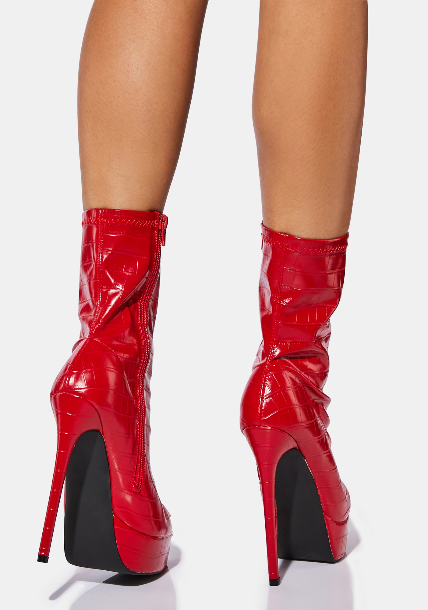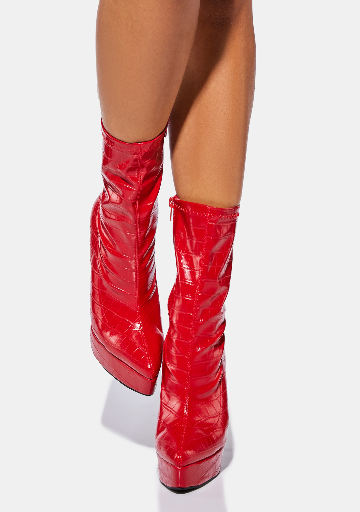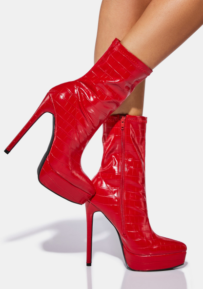 Love Rule My World Platform Ankle Boots have a vegan croc construction, a mid ankle rise, a stiletto heel and platform sole, and a zipper closure at the inner ankle.