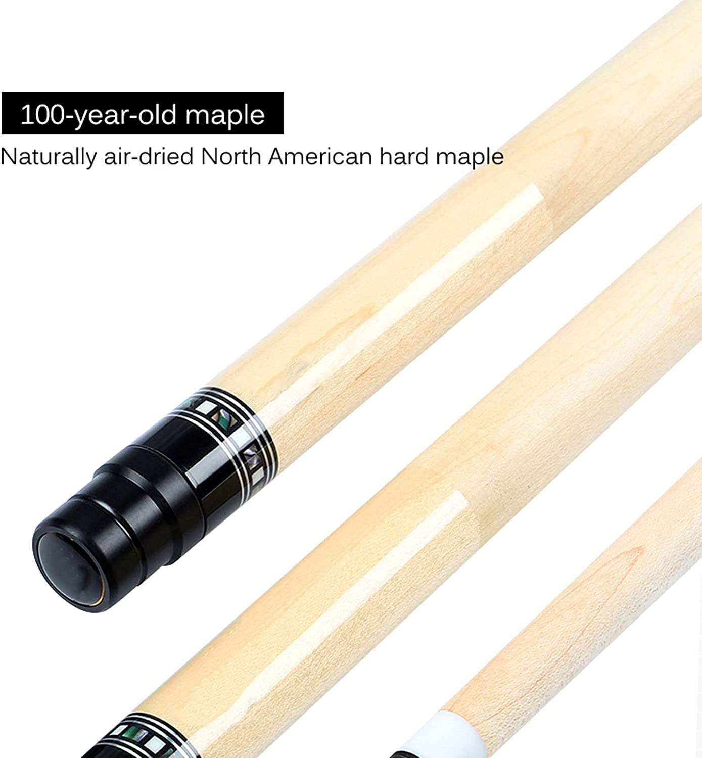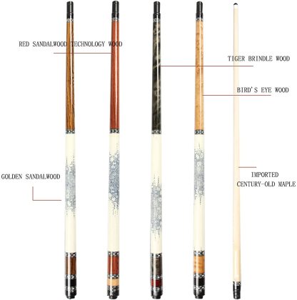- 3. Billiard cue shaft: North American hard maple wood for the front legs, gold sandalwood, bird's eye wood, tiger stripe wood, red sandalwood technology wood for the back handle. The wood has strong density and elasticity and is not easy to bend.