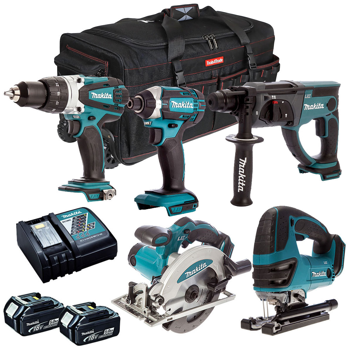 Makita 18V 5 Piece Cordless Power Tool Kit with 2 x 5.0Ah Battery Charger & Bag T4TKIT-12874