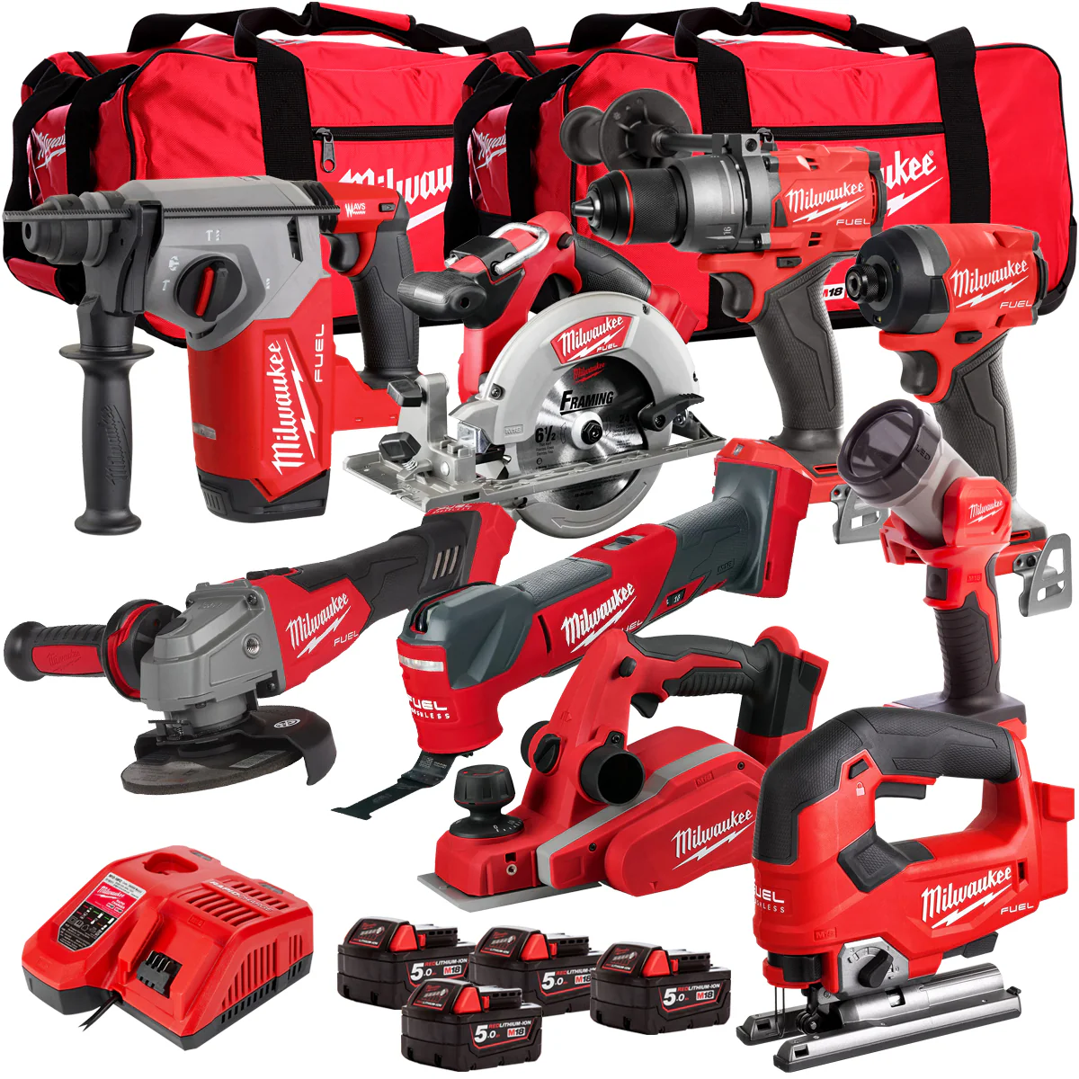 Milwaukee 18V Cordless 9 Piece Tool Kit with 4 x 5.0Ah Batteries & Charger in Bag T4TM-5