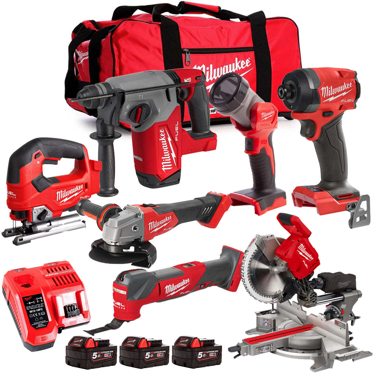 Milwaukee M18FPP6L3-503BK30 18V Brushless 7 Piece Tool Kit with 3 x 5.0Ah Batteries Charger & Wheeled Bag