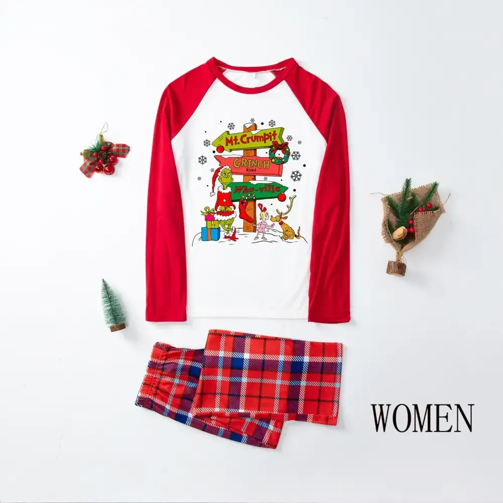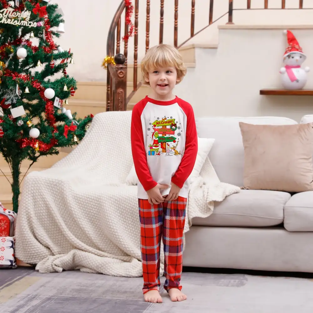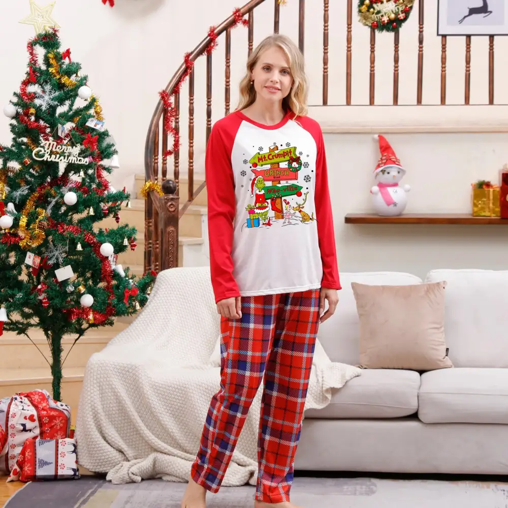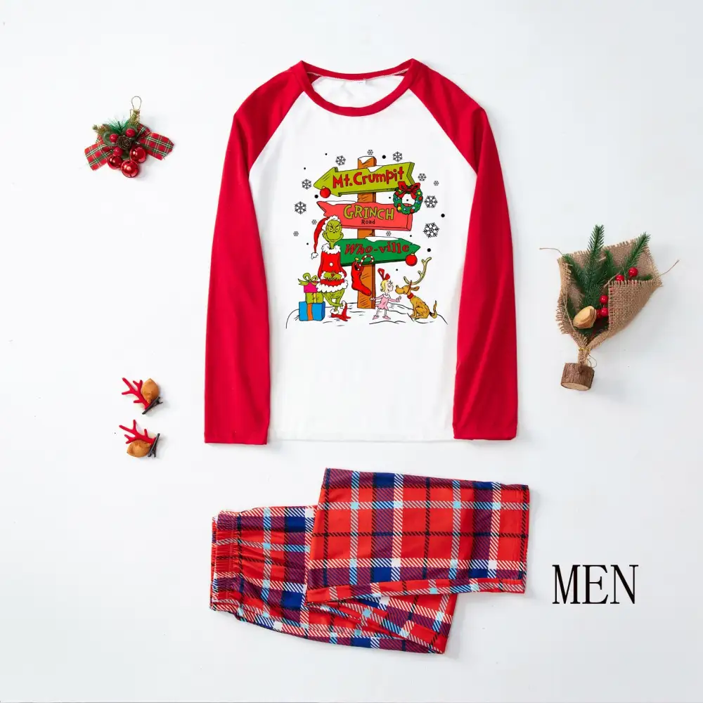 Christmas Plaid Cartoon Letter Print Red Pajama Set