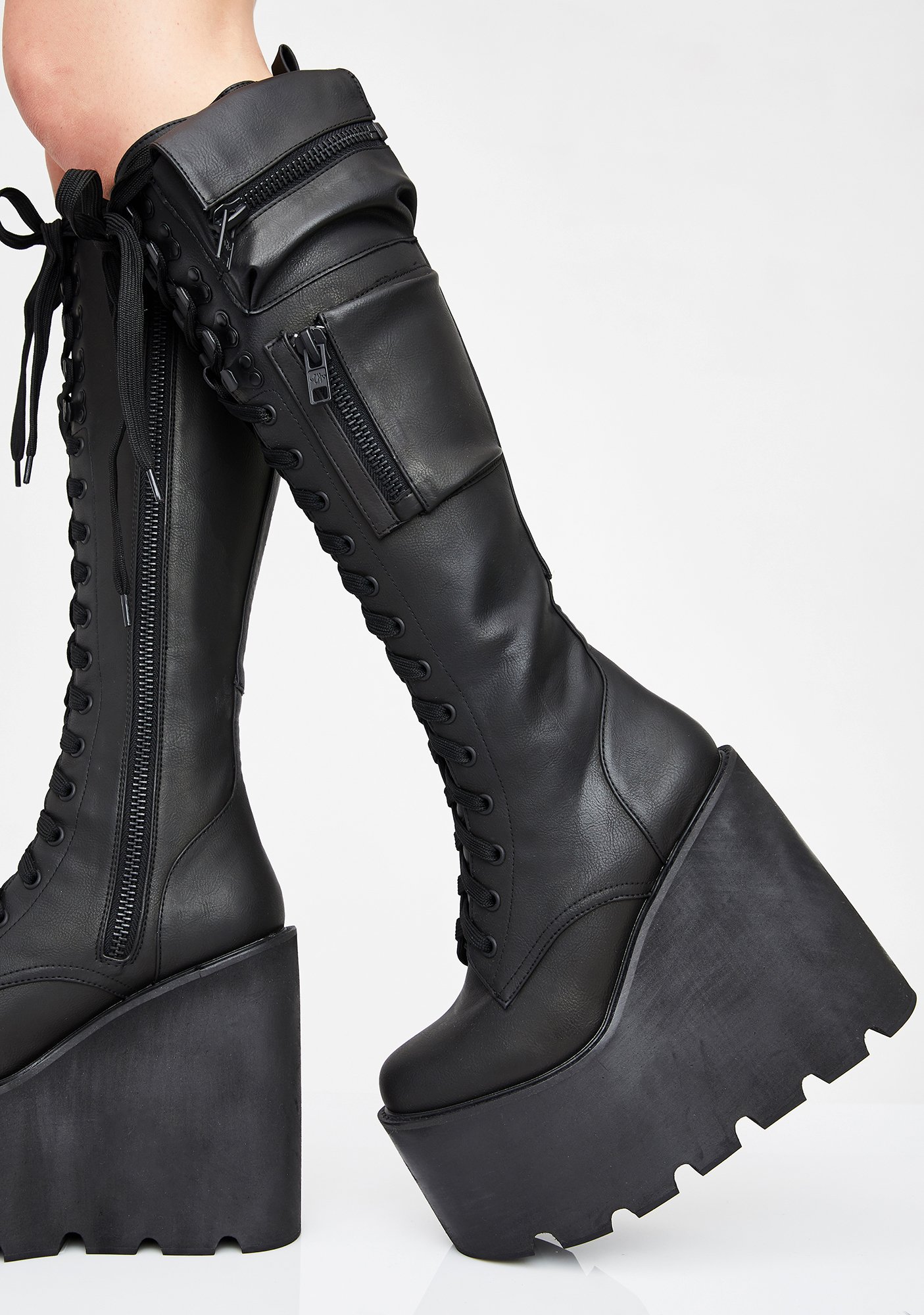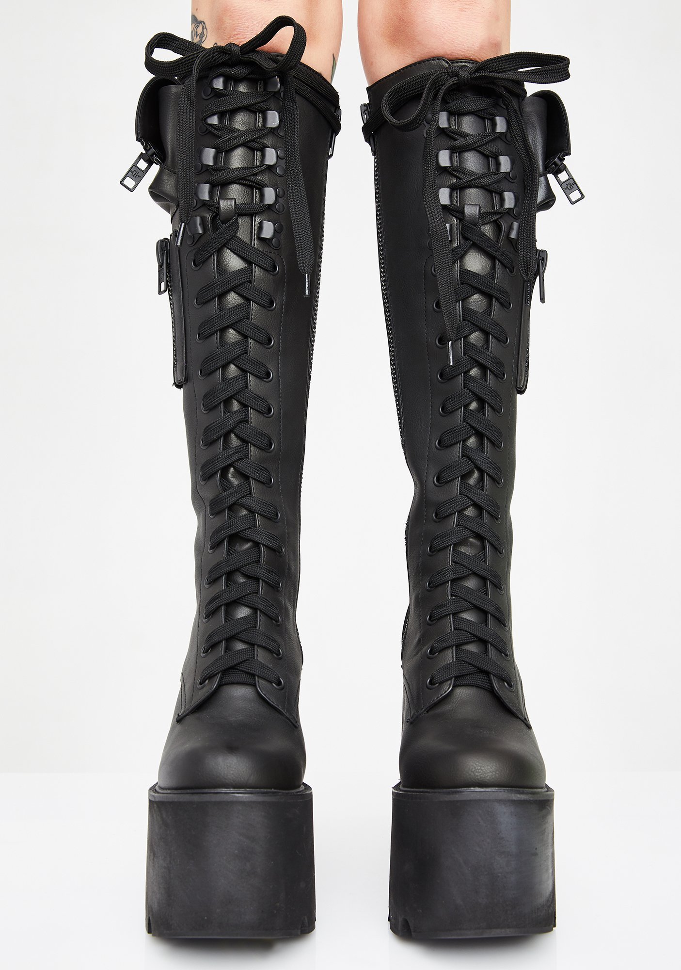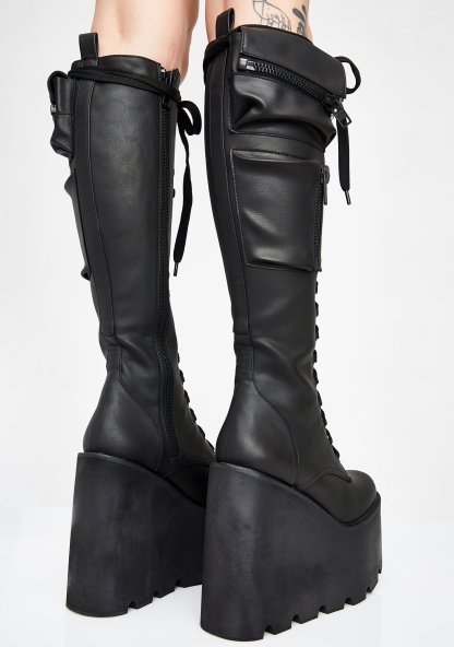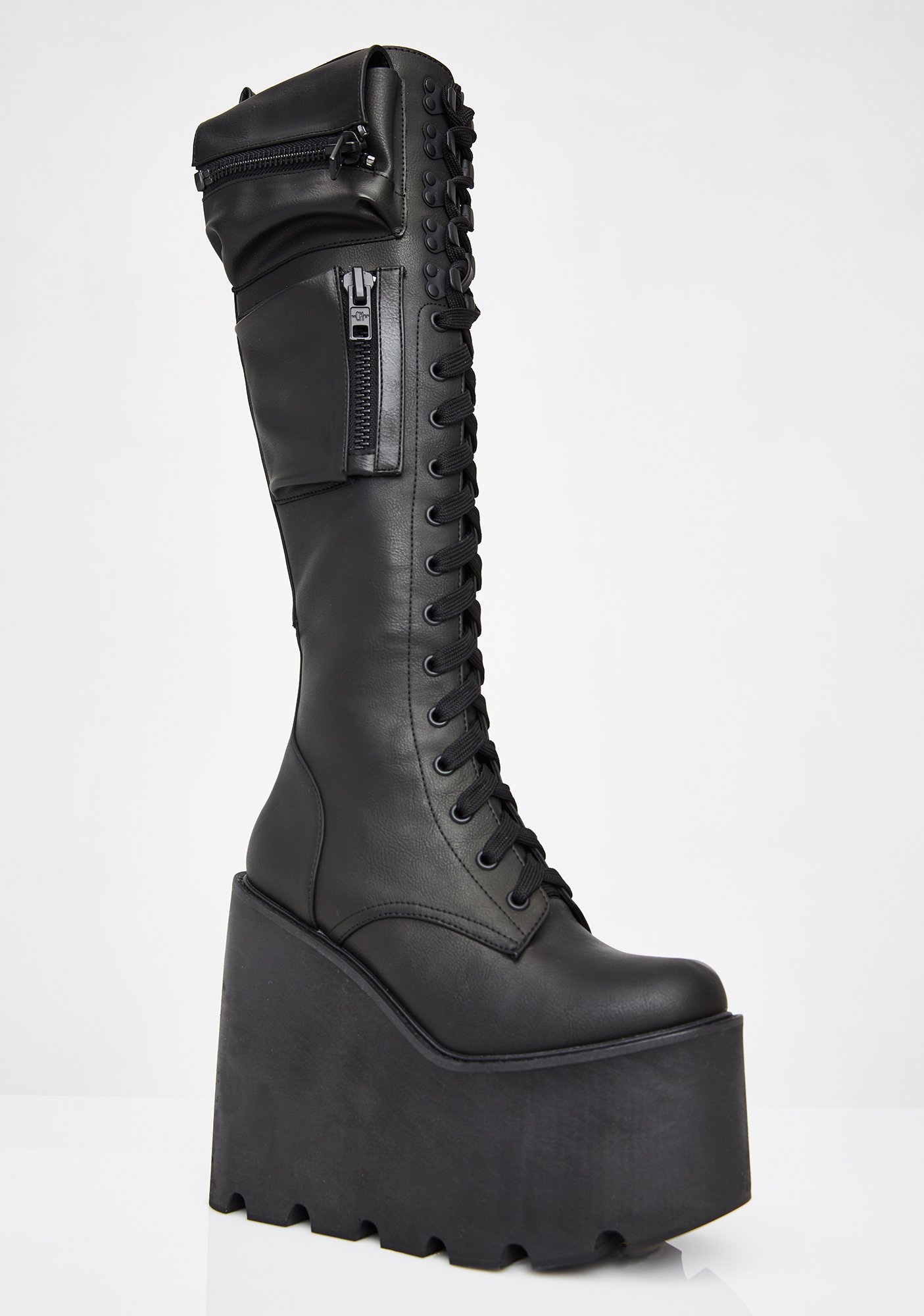 Obsidian Pocket Platform Boots will have ya winnin’ every battle. These sikk knee-high boots have lil zippered pockets on the sides, a lace-up front, cushioned insoles, and stackked platform soles.