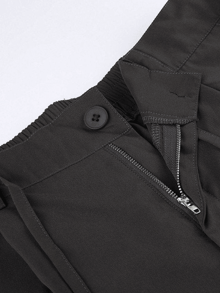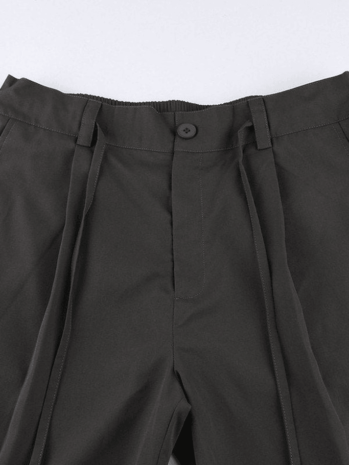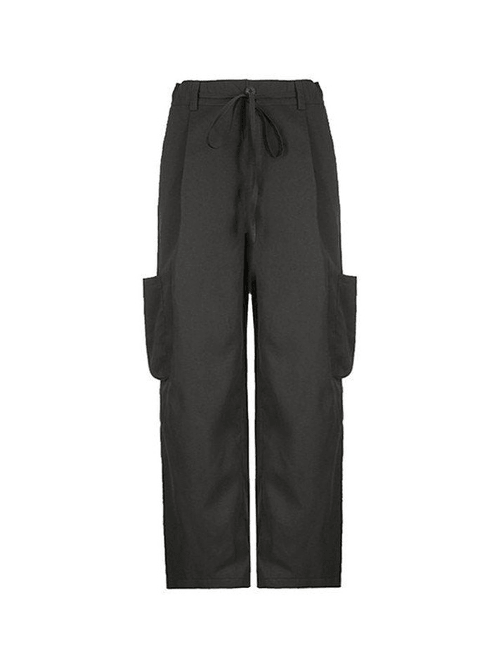 Description: Features back elasticated waist with tie strap detailing, these chic punk-vibe pants have cargo pockets patched, shaped to a relax silhouette, complete with a zip button fasten design.
