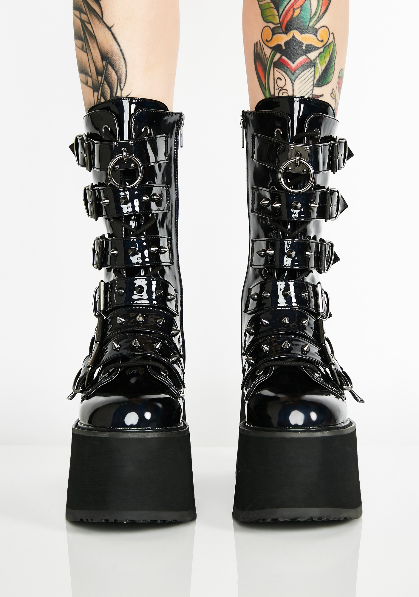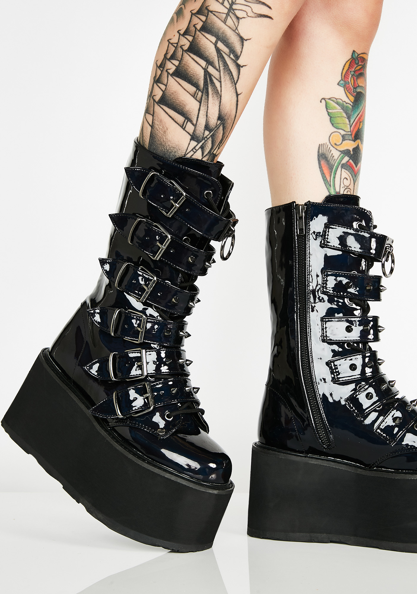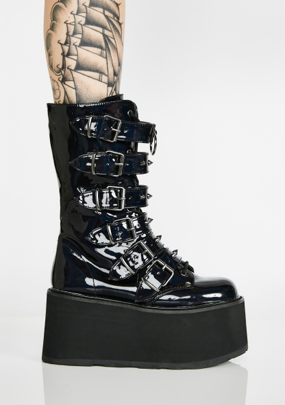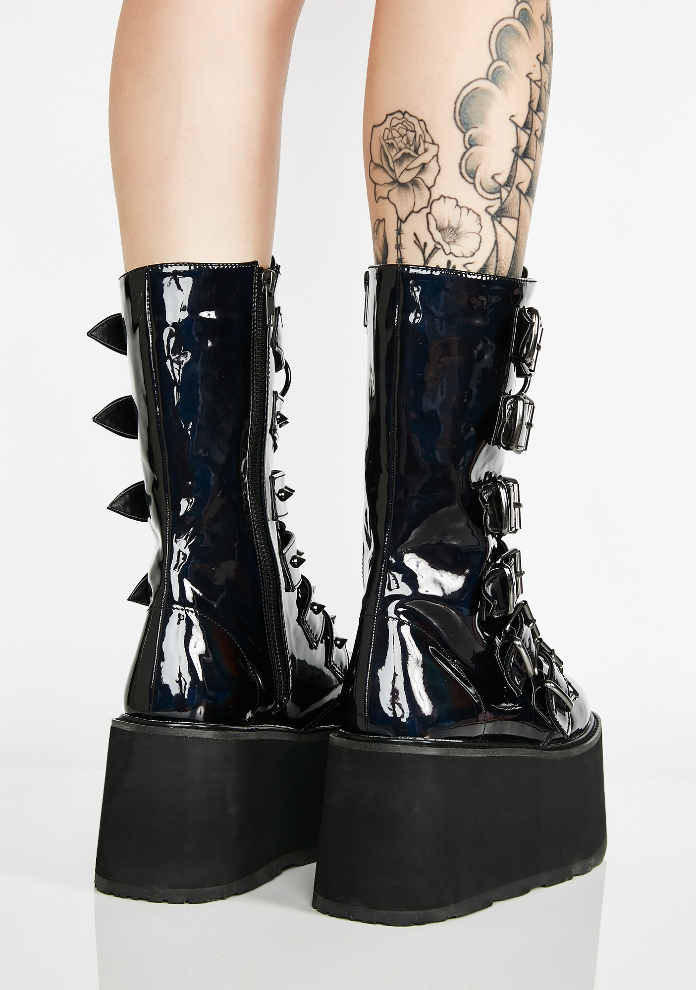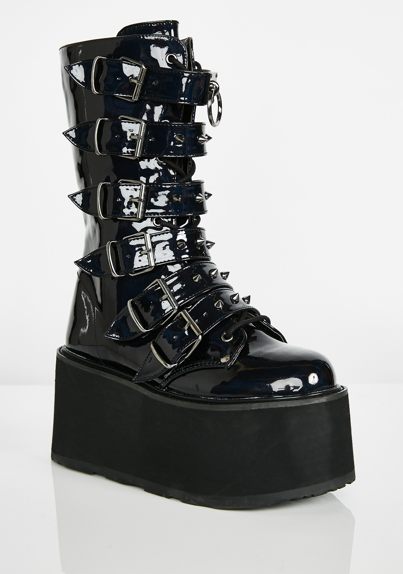 Prizm Heist Buckle Boots cuz you’re a babe on a mission. Take control in these tall platform buckle boots that have a holographic design, silver spikes, and O-ring hardware.