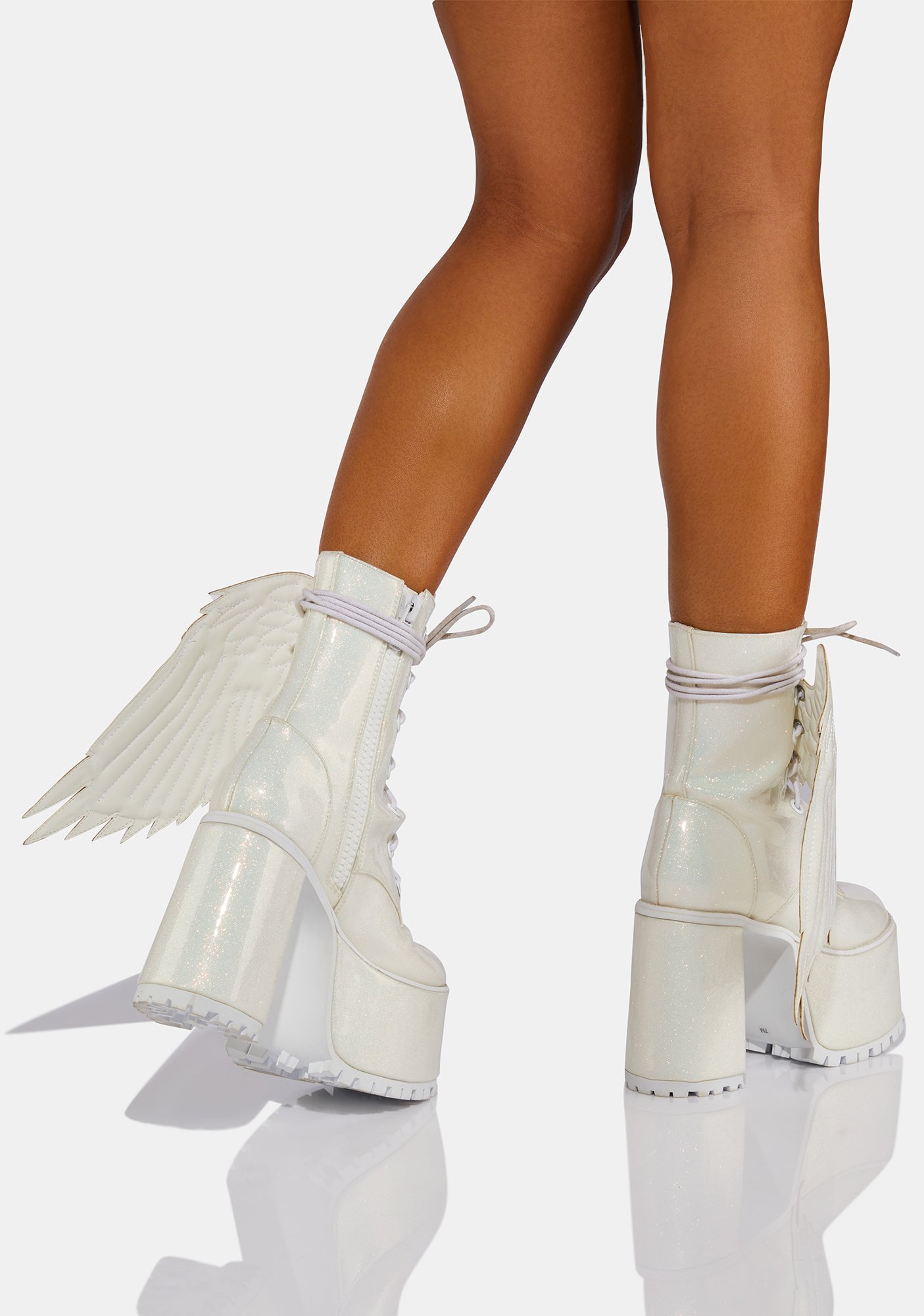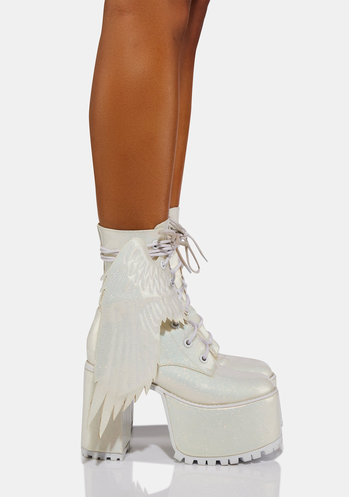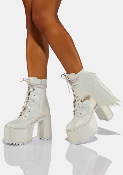 Pure Arctic Angel Glitter Platform Boots cuz you’re the queen of the ice haven. These glittery platform boots have detachable angel wings, extra long adjustable laces, side zip closures, and chunky block heels with cleated soles.