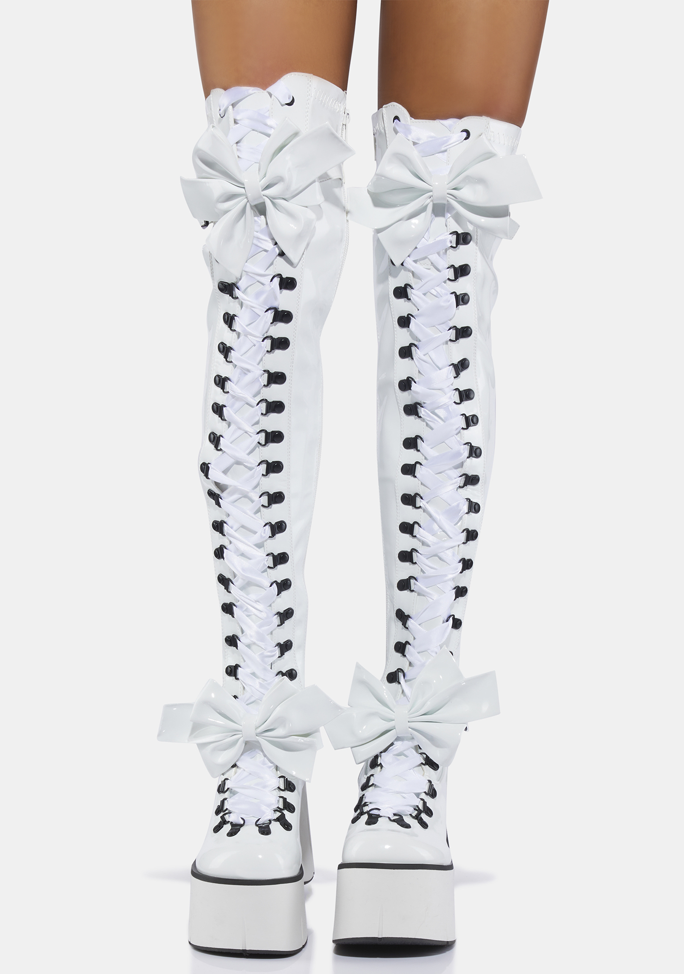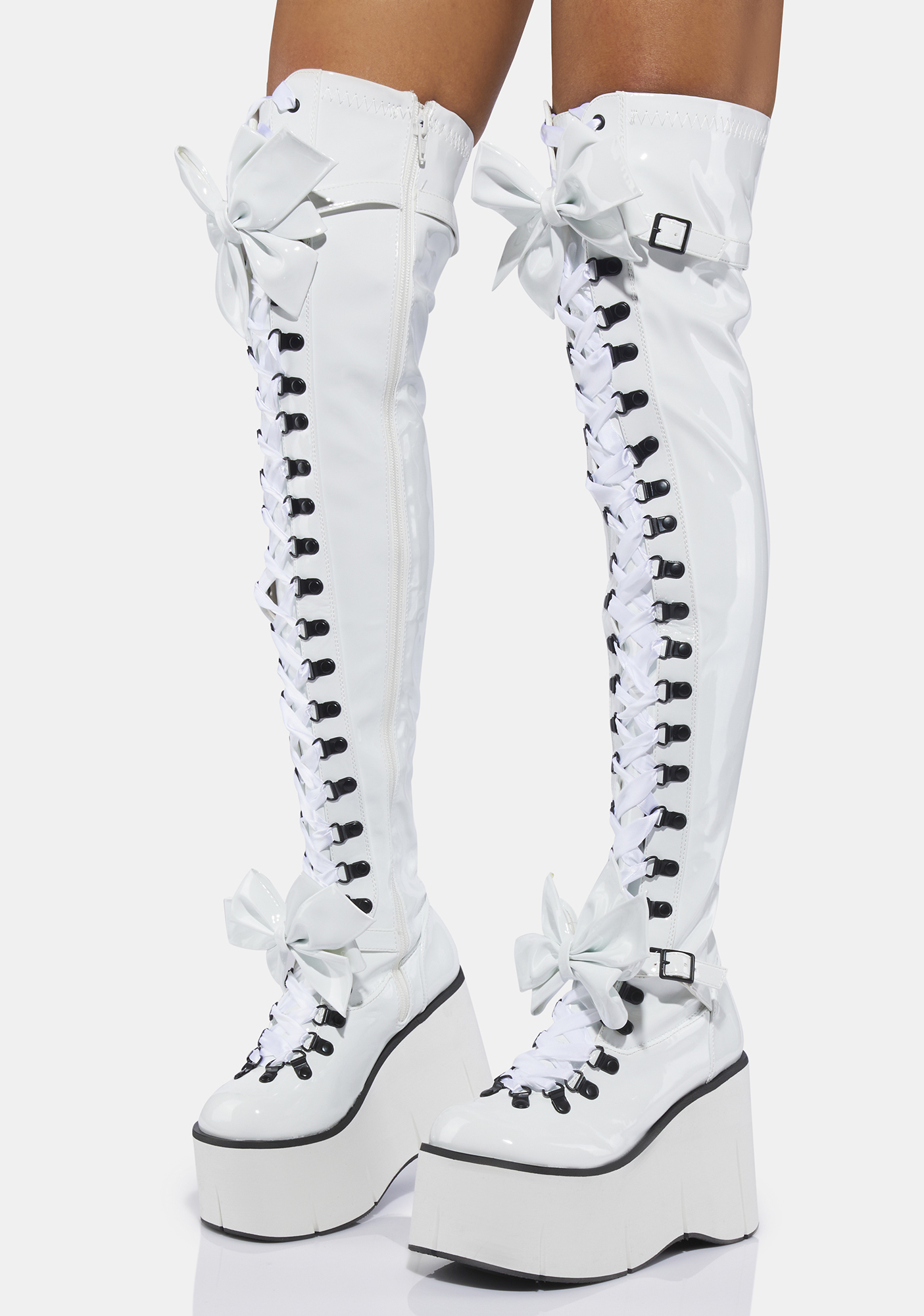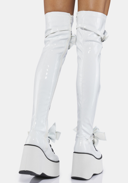 Pure Gothic Princess Thigh High Boots rule the darkness! These gothic thigh high boots have a stretch vegan leather construction, big detachable bows, wedge platform soles, lace up fronts, and side zip closures.