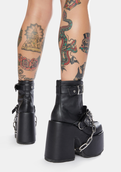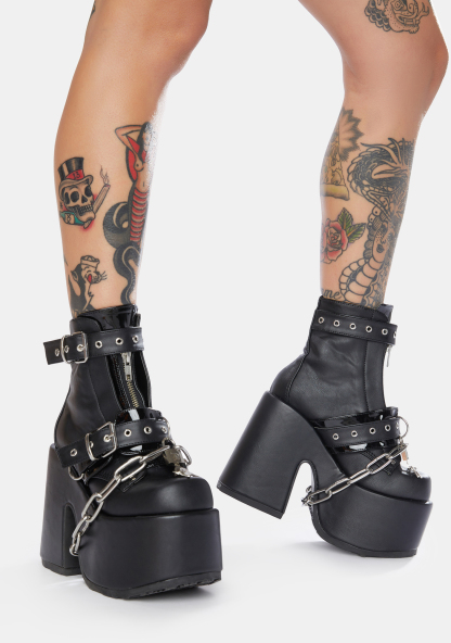 Ruin My Life Platform Ankle Boots burn it all to the ground! These platform ankle boots have a vegan leather construction, eyelet buckle straps, chain detailing, chunky heels and front zip closures.