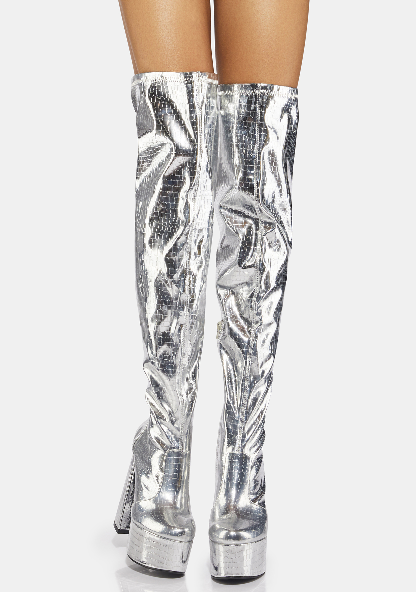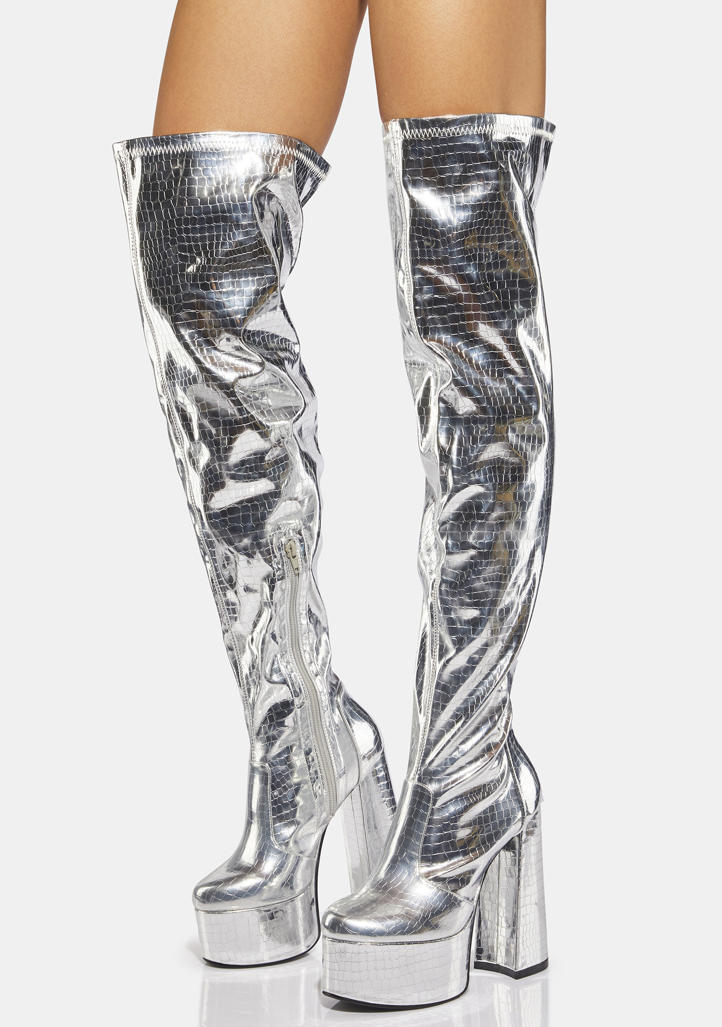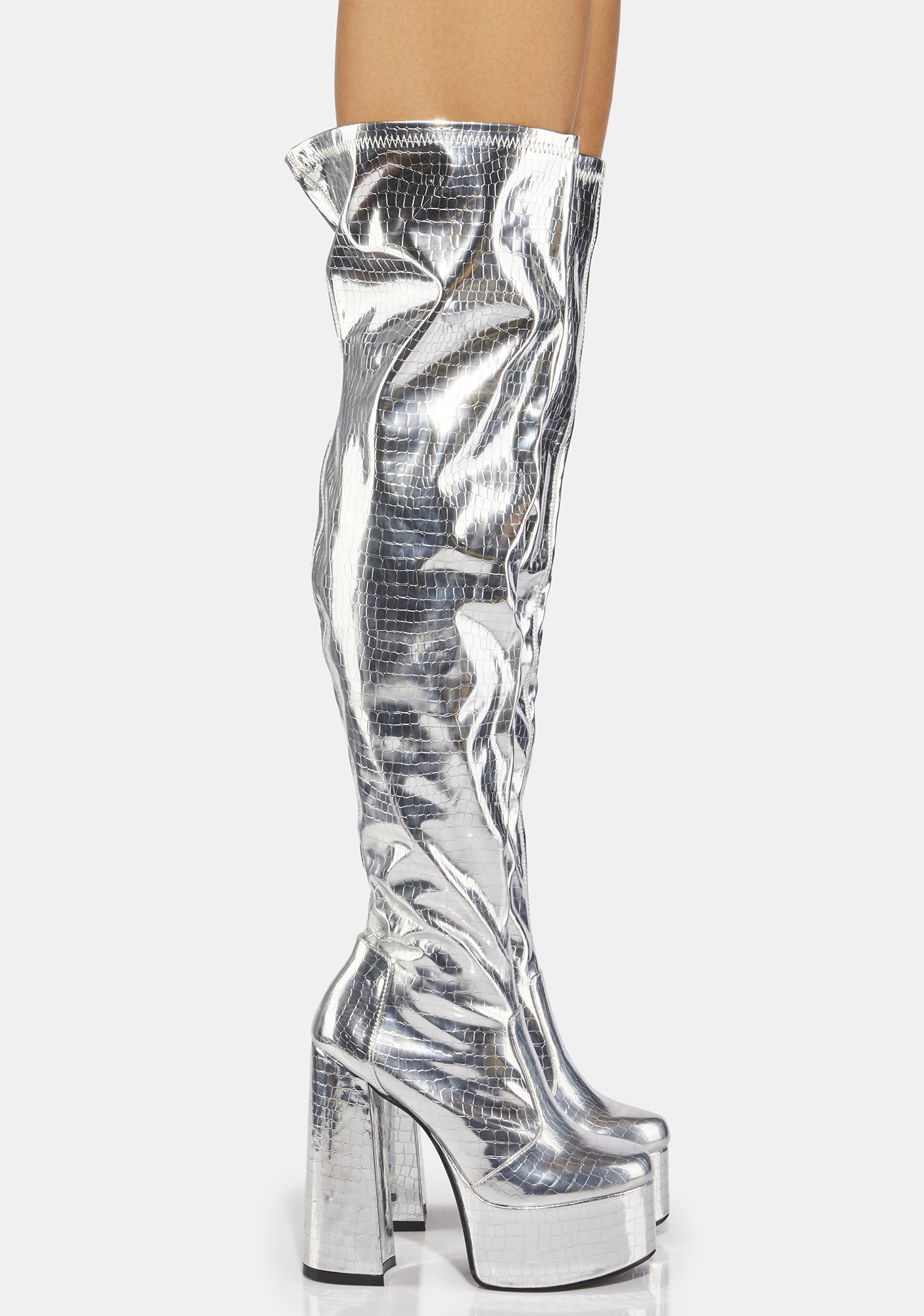 Silver Bodie Knee High Boots you're turning heads! These knee high boots have a metallic design with a croc texture, side zipper closures, platform soles, and block heels.