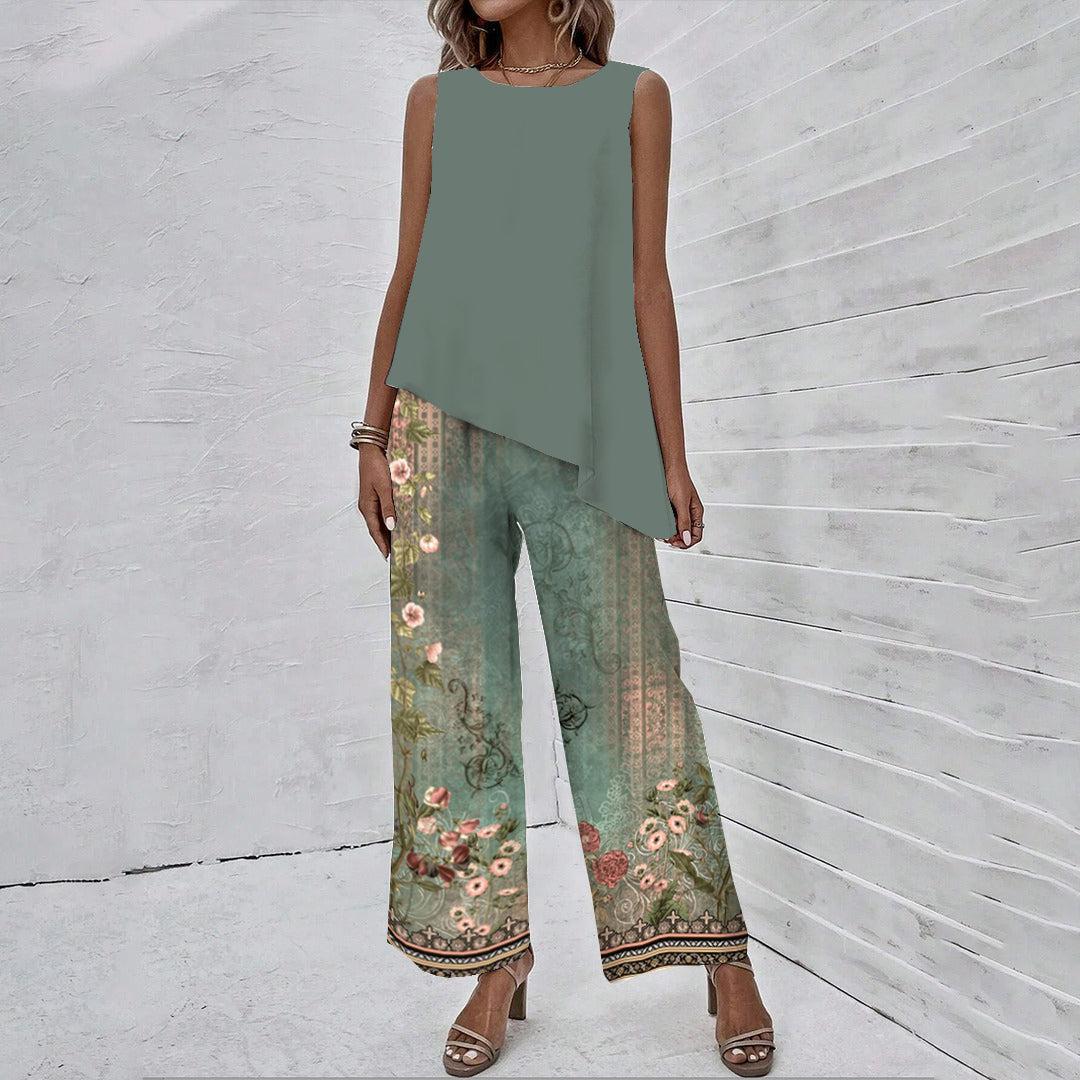 Revamp your wardrobe with our sleeveless two piece set, featuring a trendy print design. Made with high quality materials, this set offers both style and comfort for any occasion. Upgrade your fashion game with this fresh and elegant ensemble.