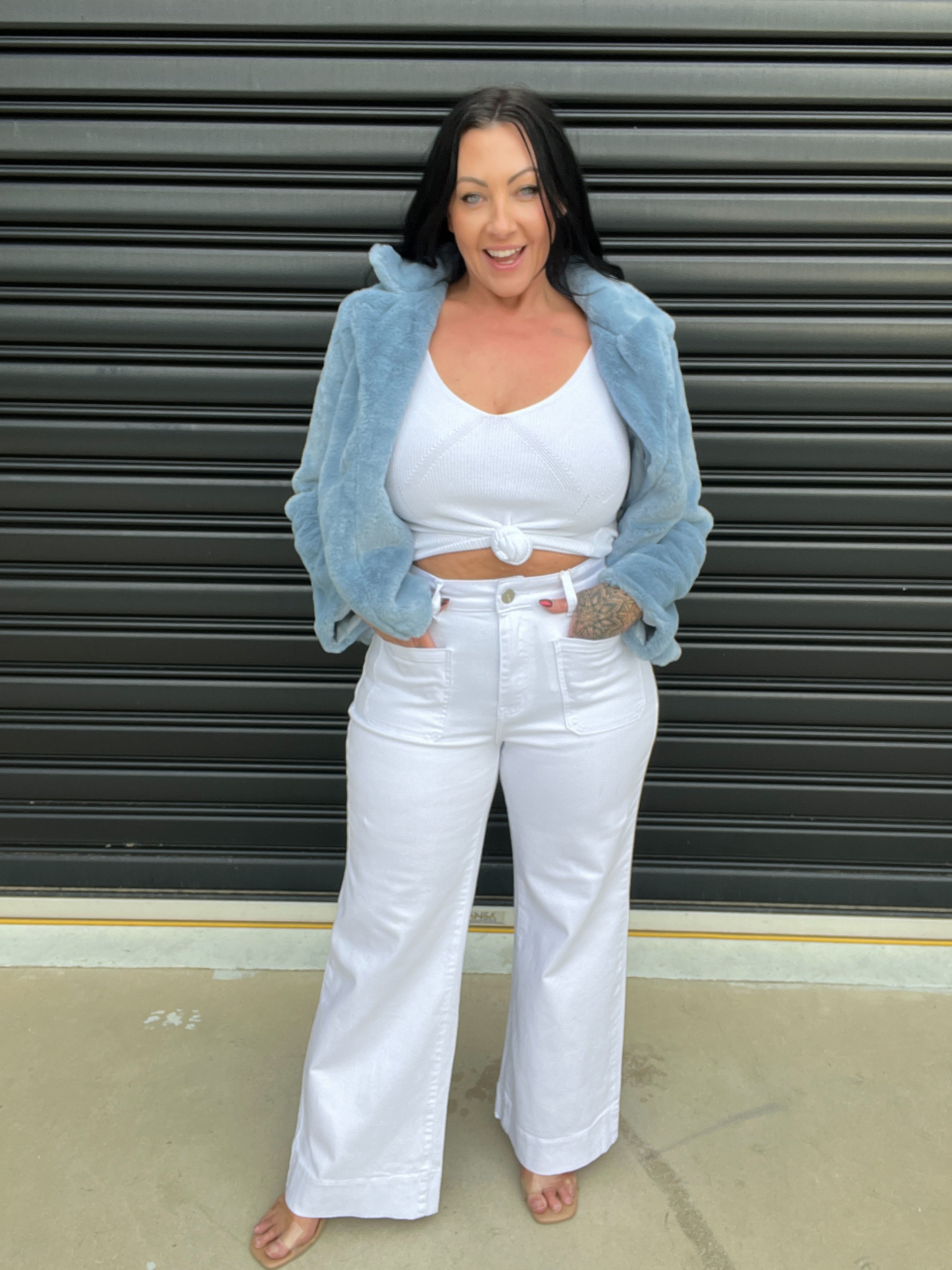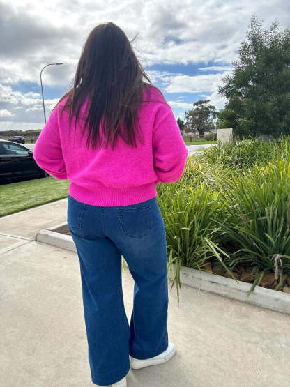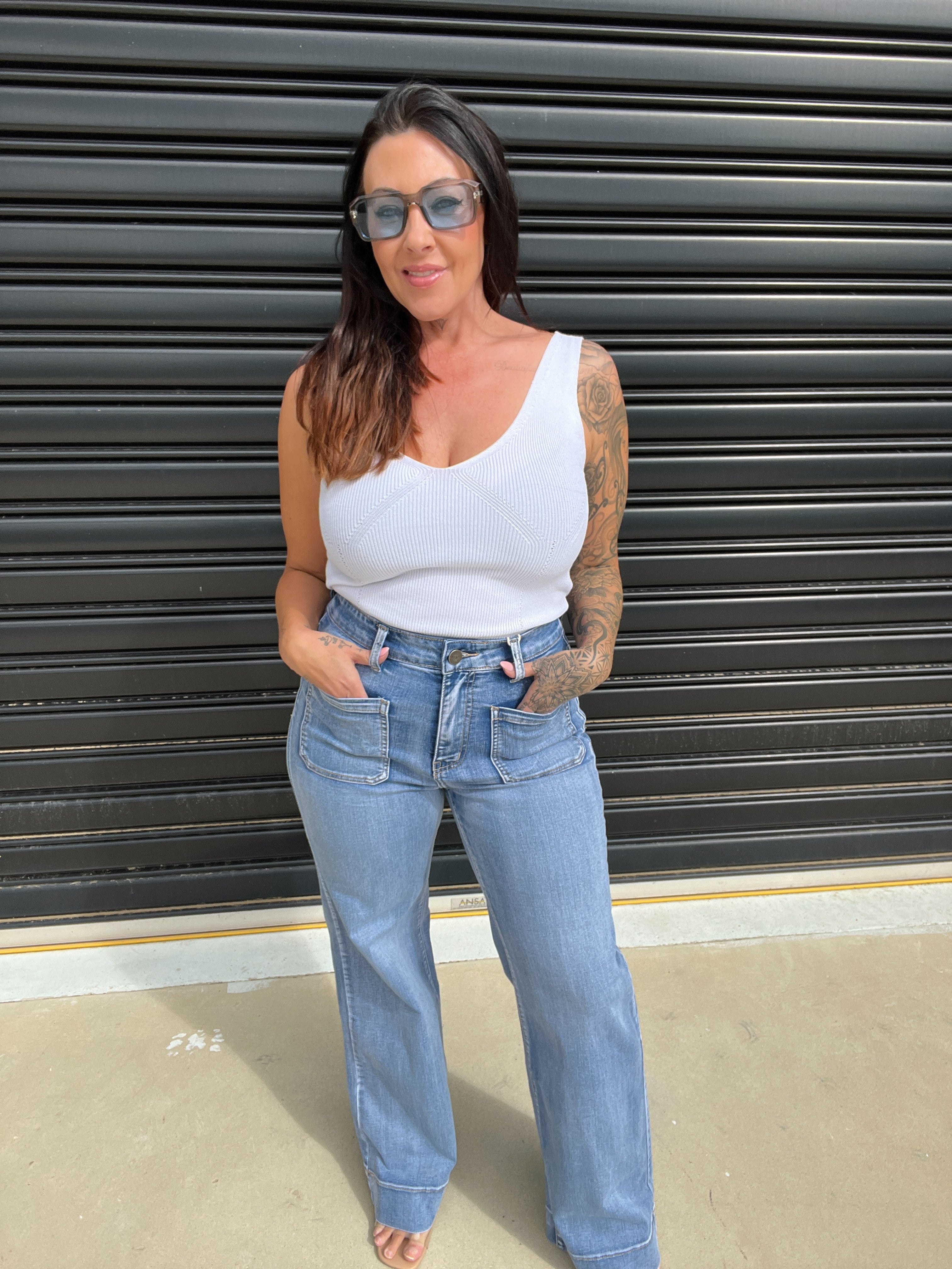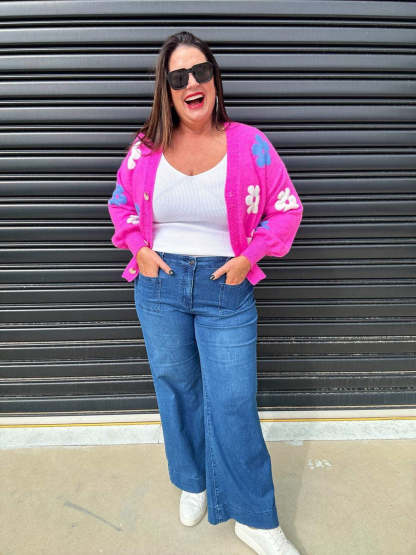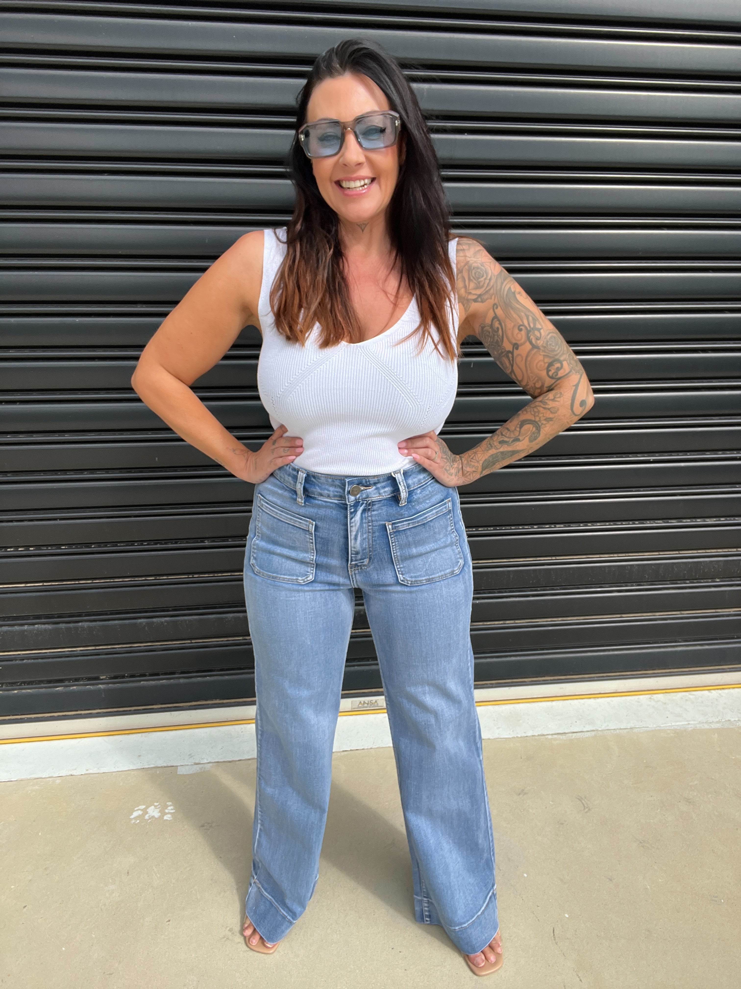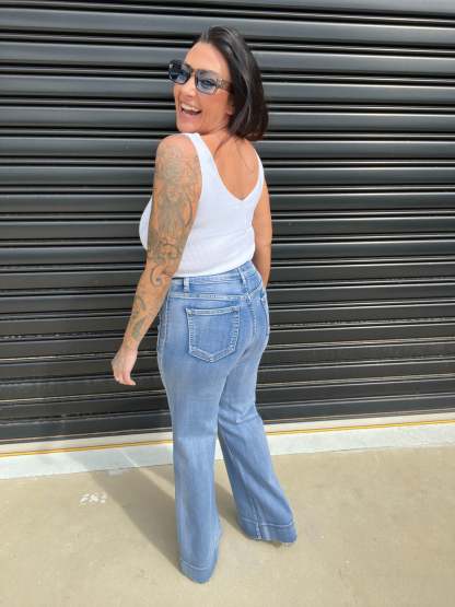Introducing our new Skipper jeans, the ultimate in trendy denim fashion. These jeans feature an on-trend wide leg design that captures the cool 70’s vibe perfectly. Slightly fitted through the leg and fanning out into a wide leg, these jeans are both fun and stylish. Recommendation: We recommend sizing down for the perfect fit