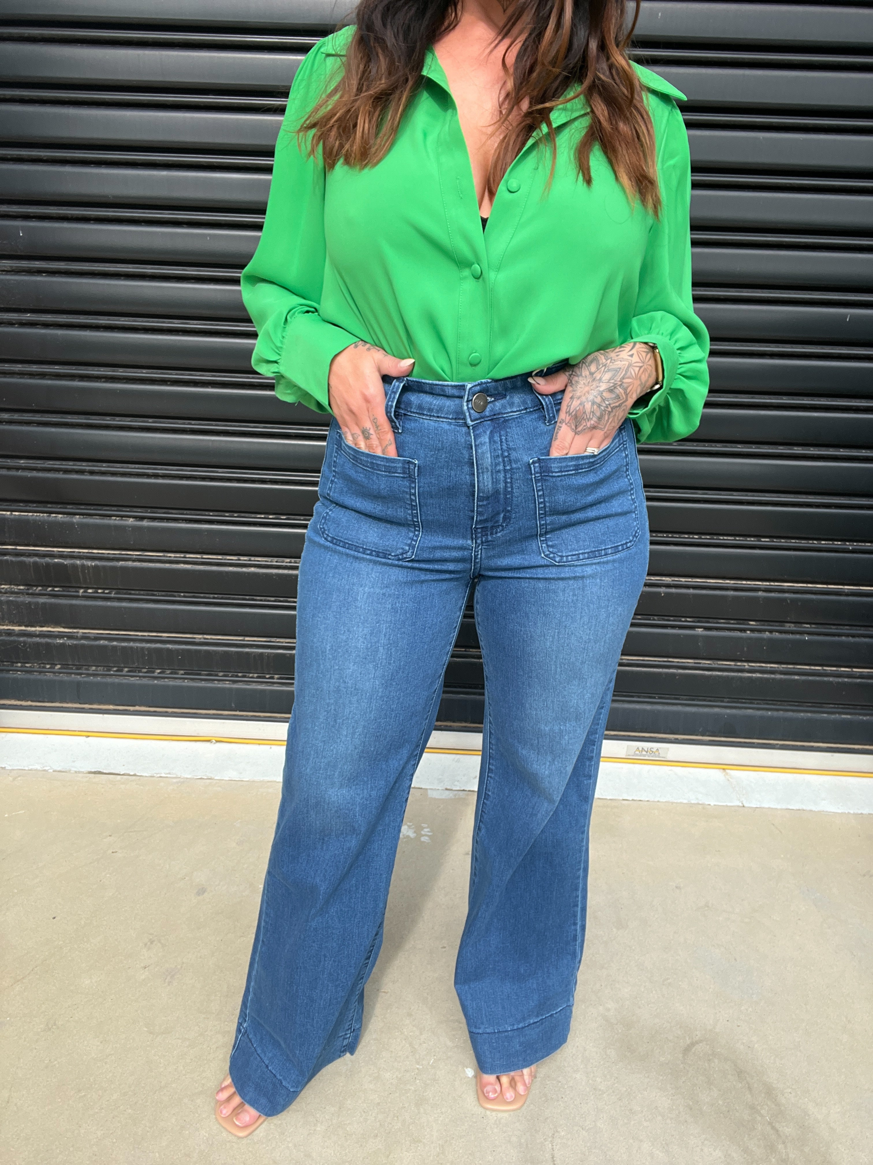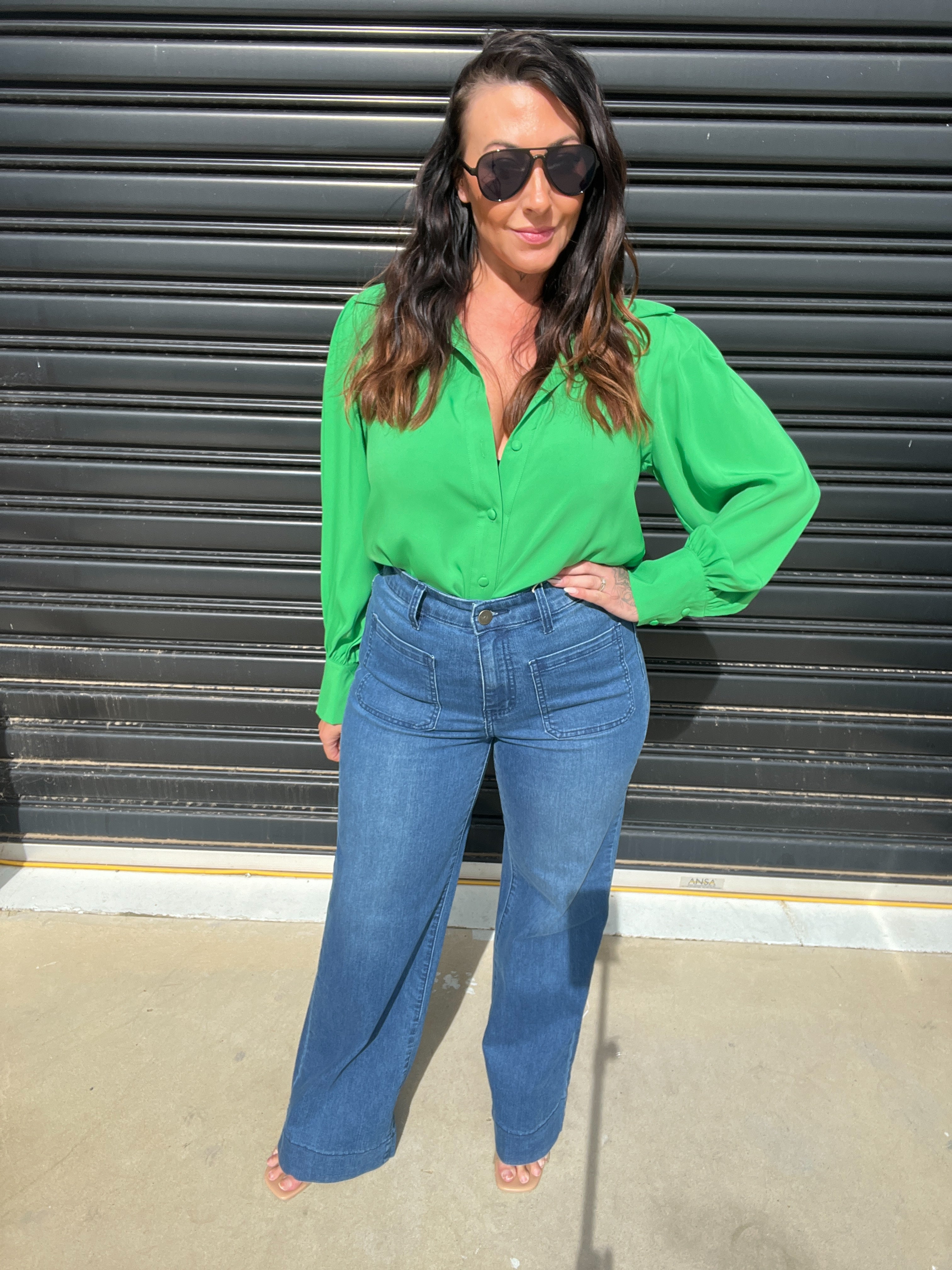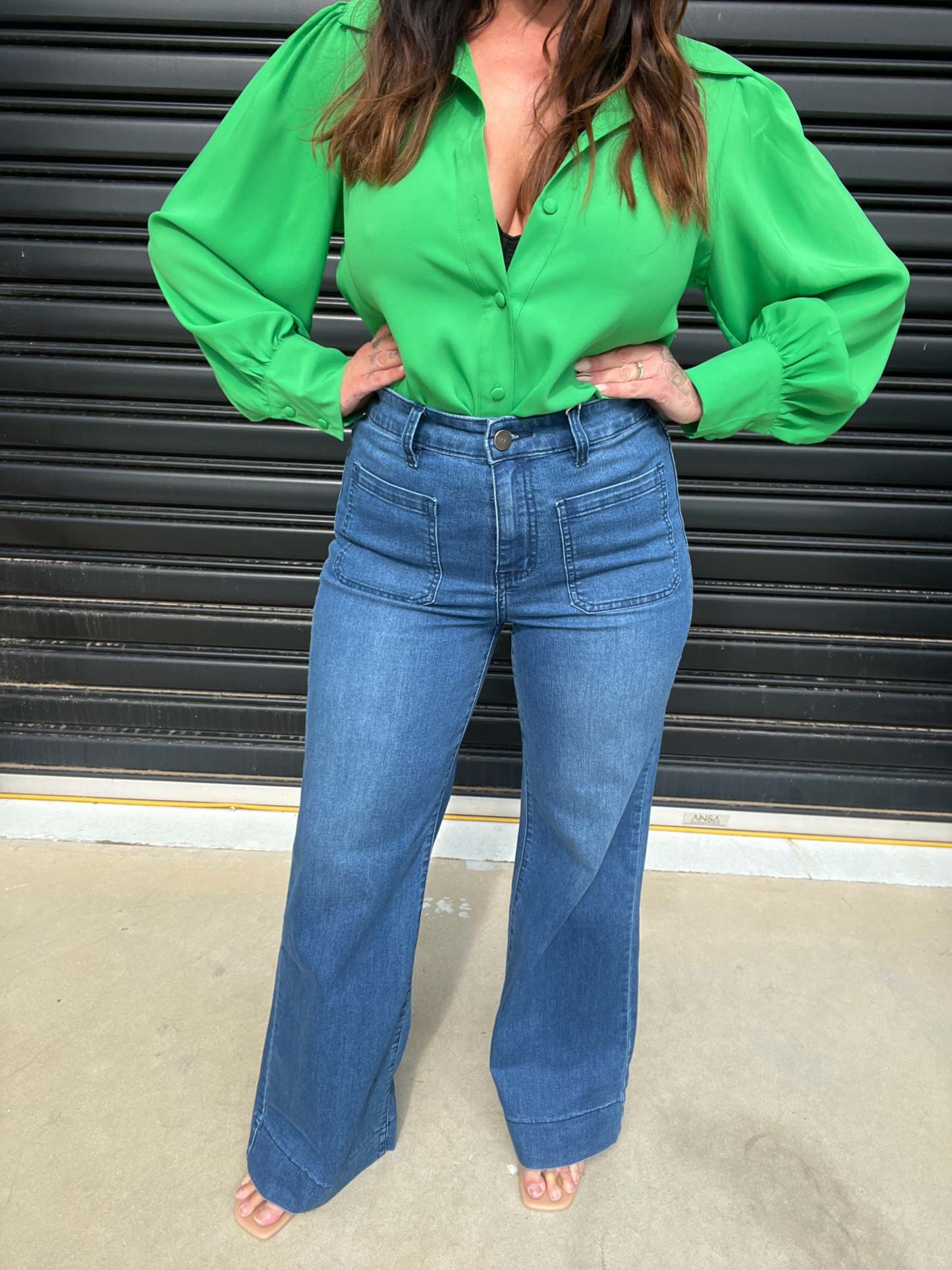 Introducing our new Skipper jeans, the ultimate in trendy denim fashion. These jeans feature an on-trend wide leg design that captures the cool 70’s vibe perfectly. Slightly fitted through the leg and fanning out into a wide leg, these jeans are both fun and stylish. Recommendation: We recommend sizing down for the perfect fit