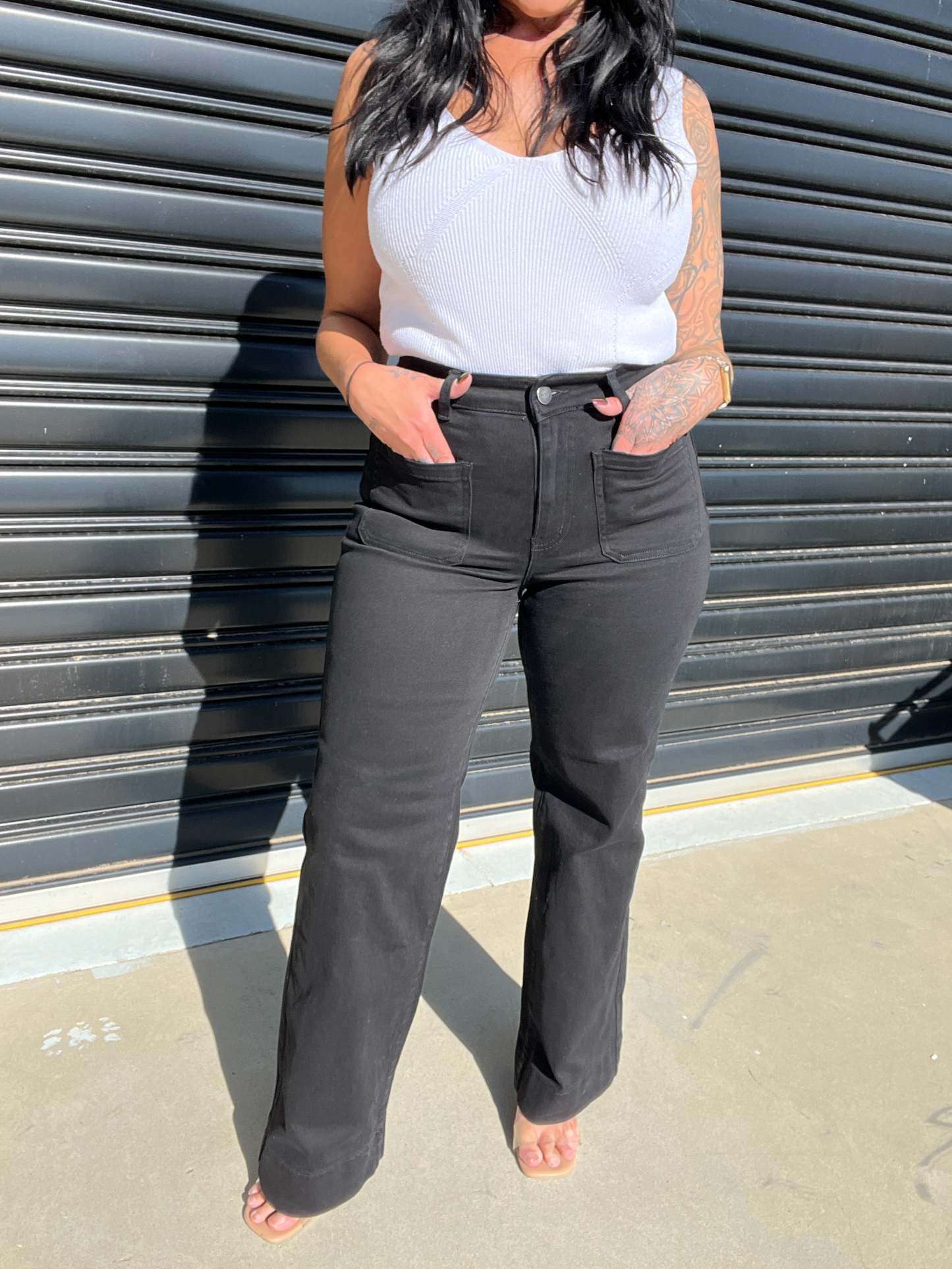 - Design: Mid-high rise with bold front pockets for a chic look.