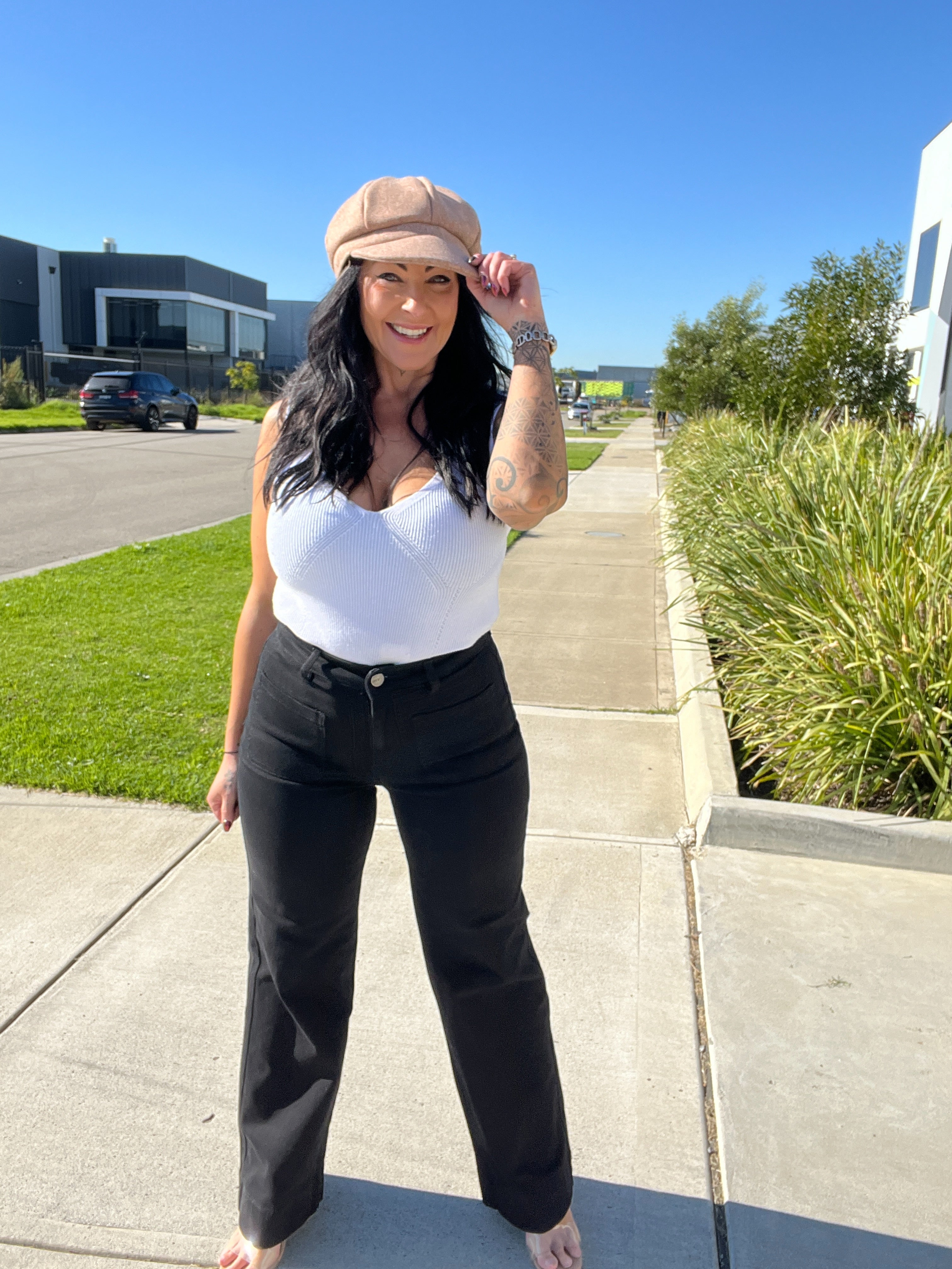 - Fit: Slightly fitted through the leg, flaring into a wide leg for that retro 70’s style.