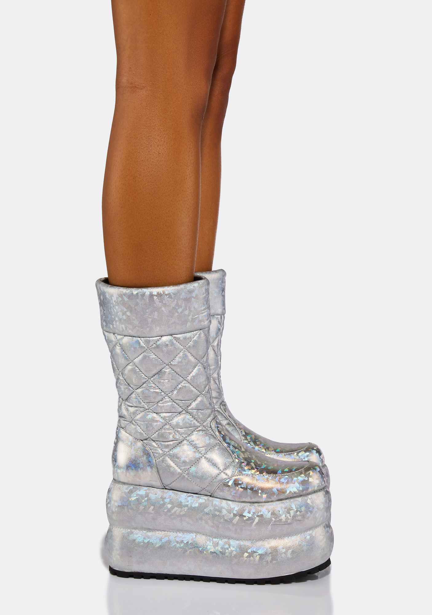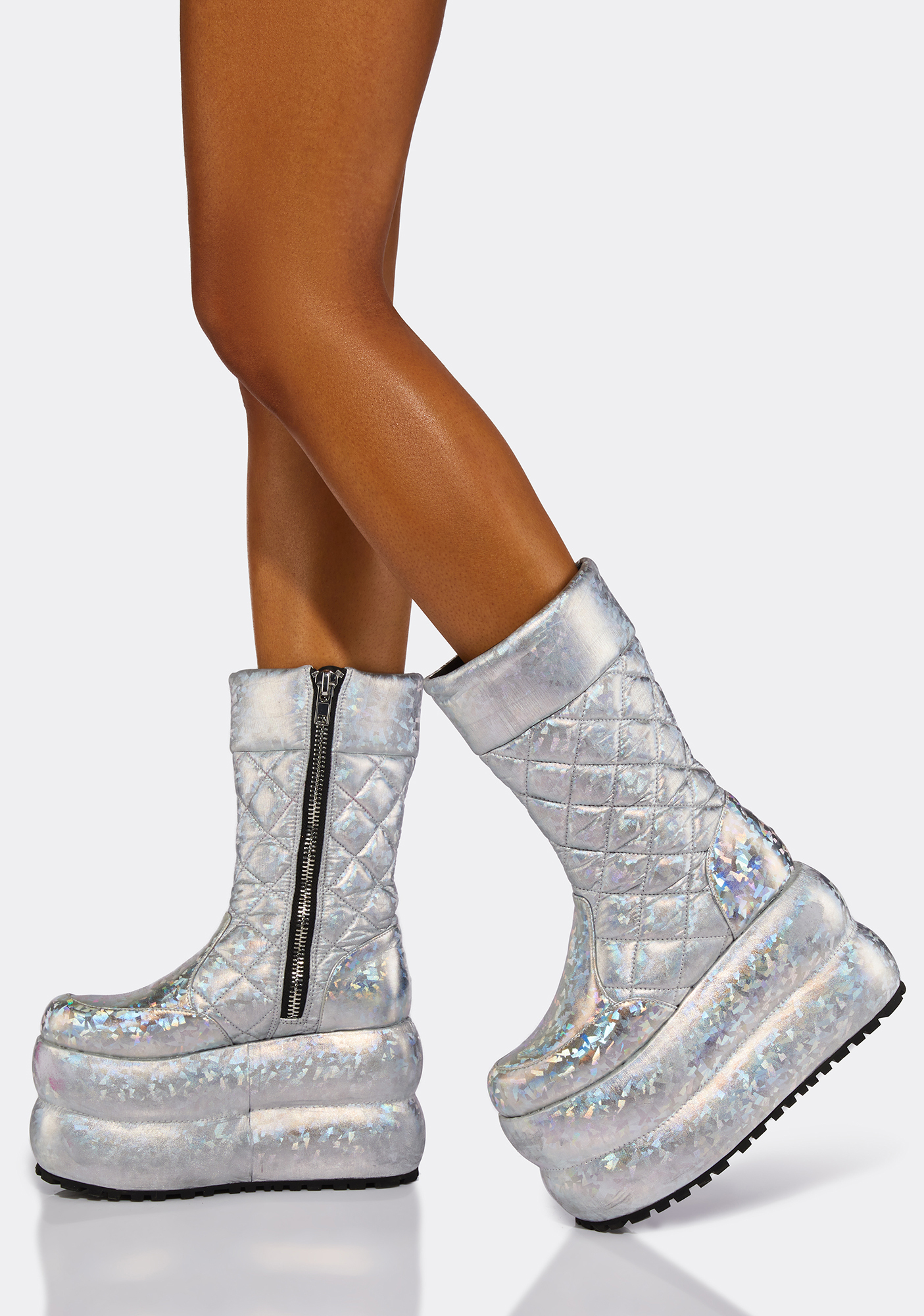 Space Raid Holographic Puffer Boots cuz you’re going beyond the stars! These holographic puffer boots have a quilted construction with a sparkle pattern all over, side zip closures, and tiered platform soles.