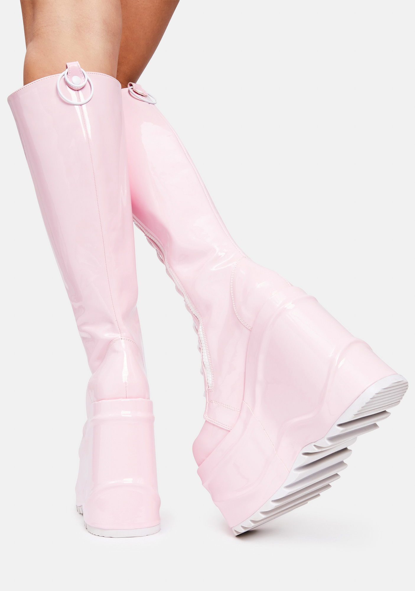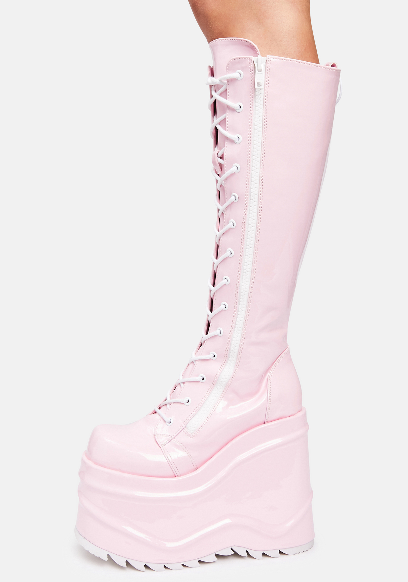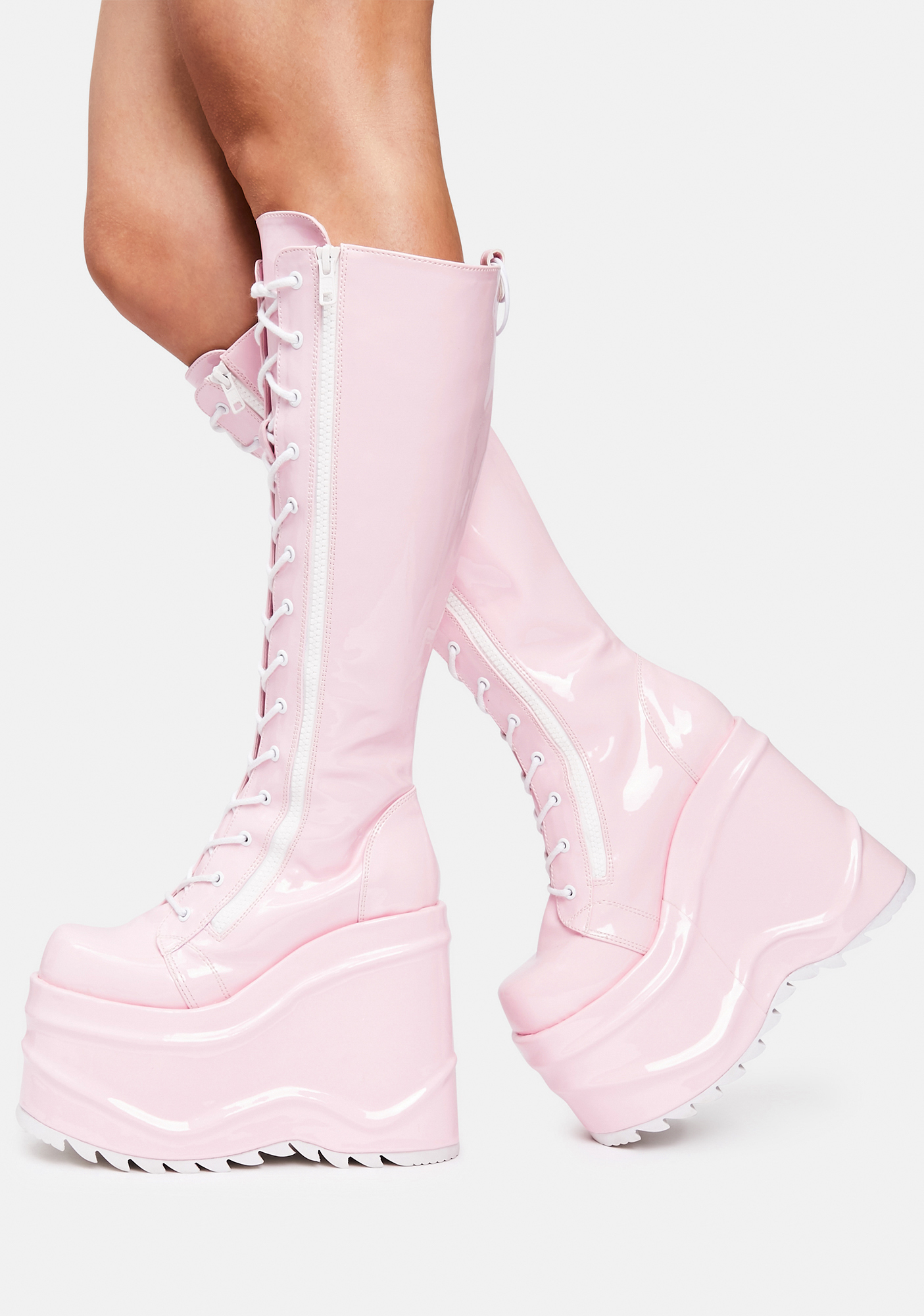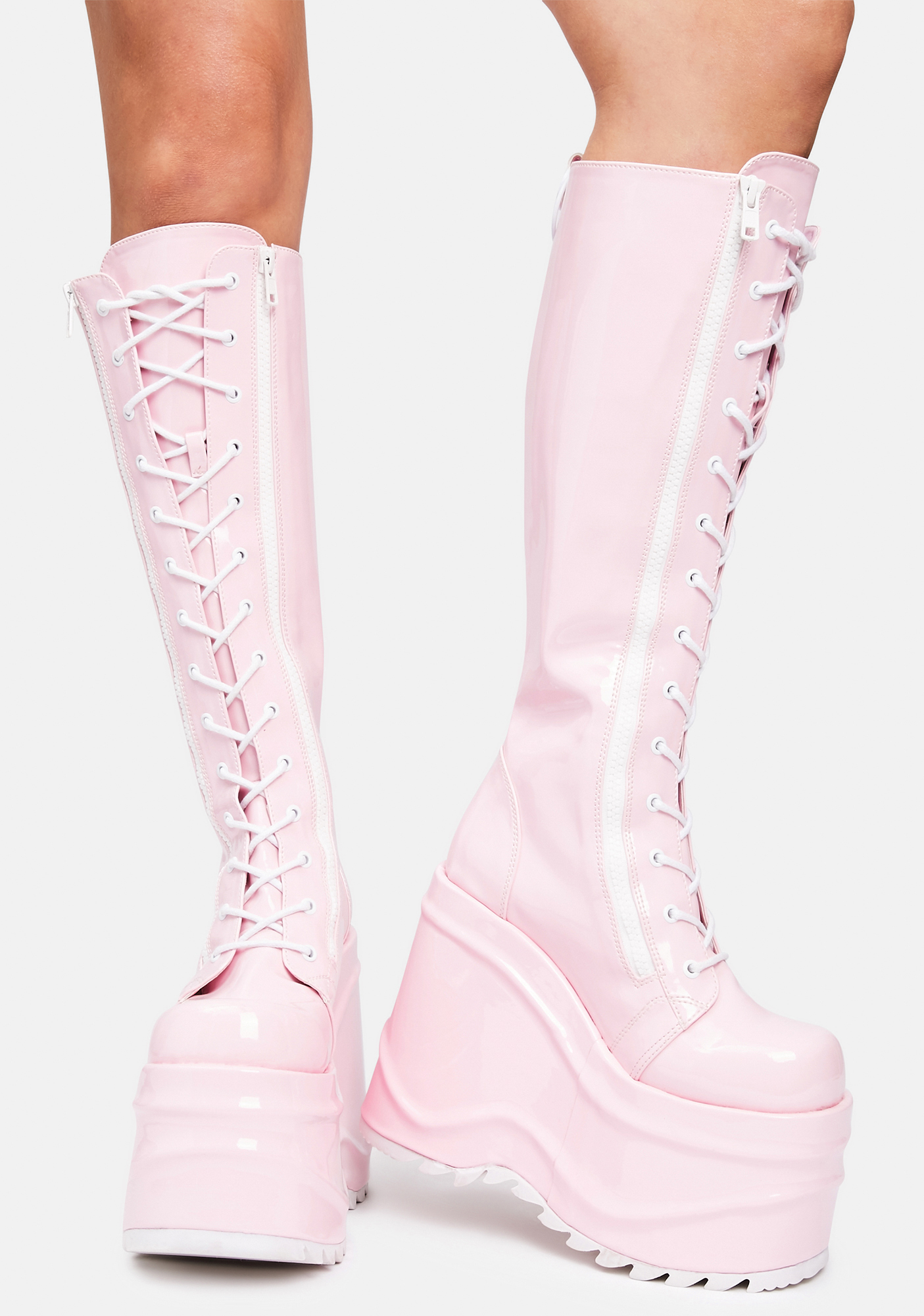 Demonia Sweet Evil Intentions Wedge Knee High Boots cuz you’re always on your worst behavior. These patent vegan leather knee high boots have platform wedges, lace up fronts with zip closures, rounded toes, and back O-ring accents.
